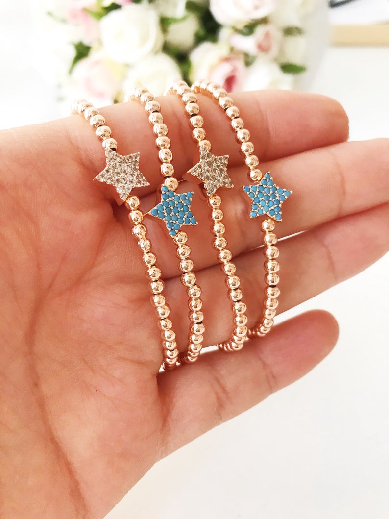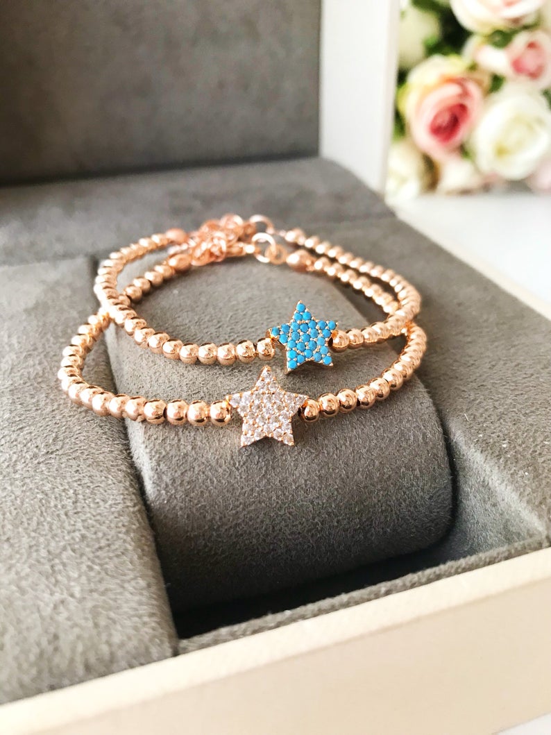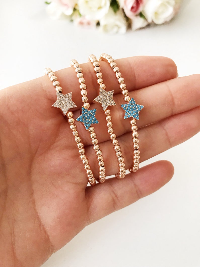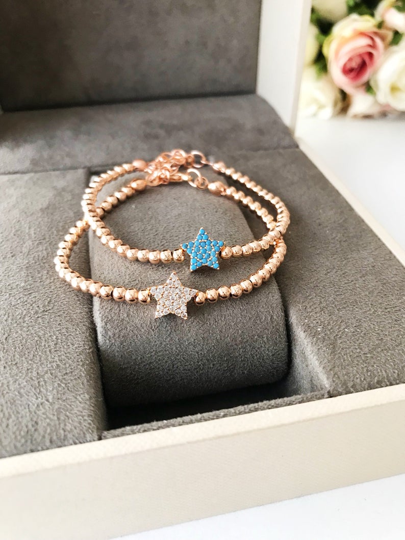 A dainty rose gold bracelet featuring a tiny star charm, adorned with either turquoise or zirconia beads, showcasing its delicate and adjustable design.