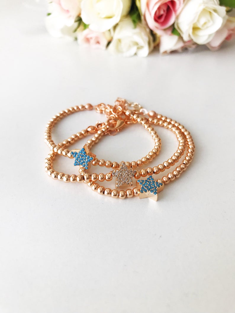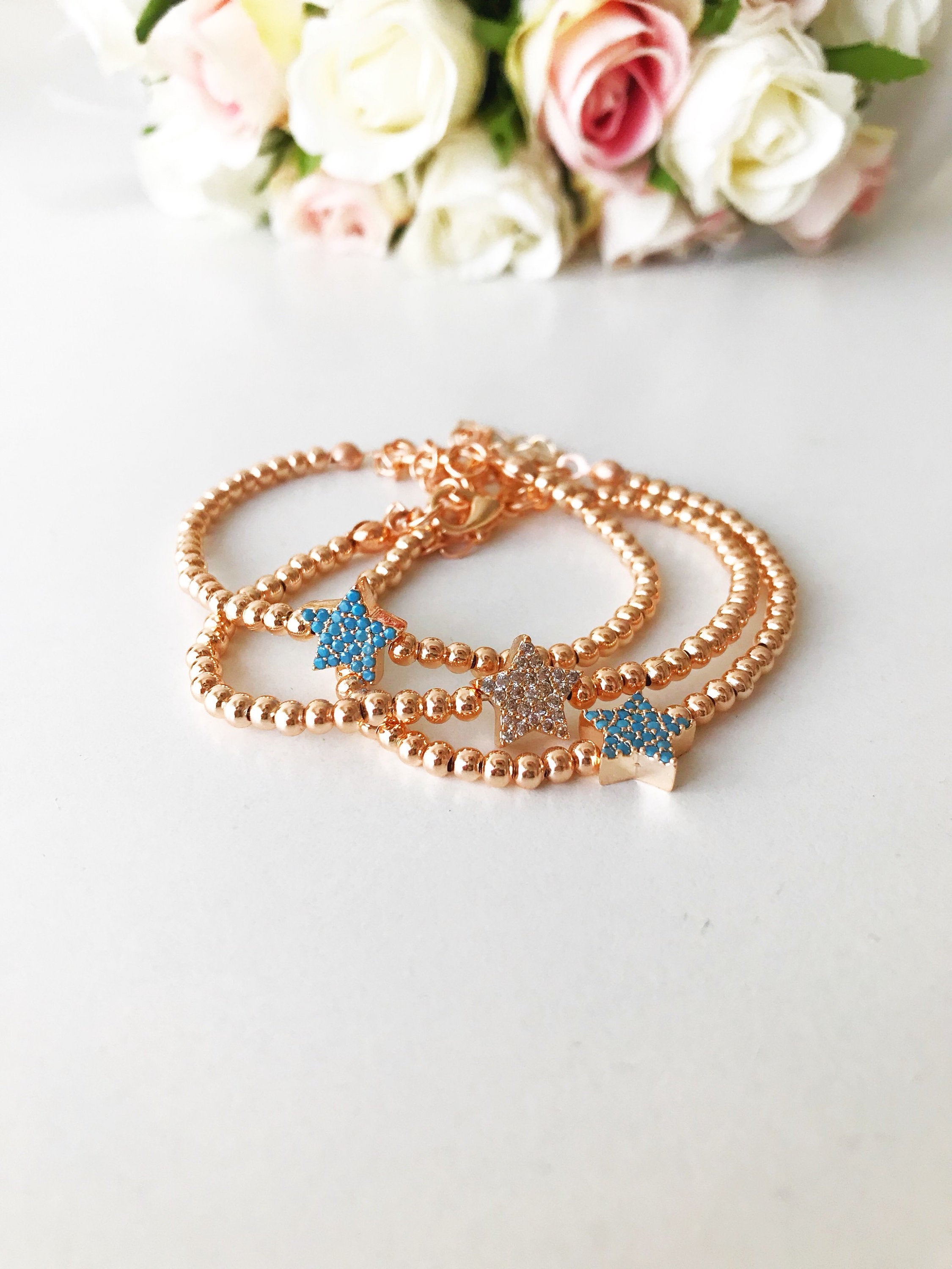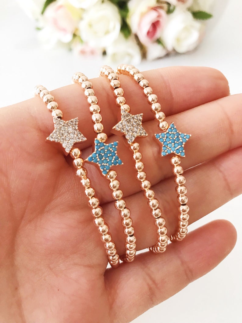 A dainty rose gold bracelet featuring a tiny star charm, adorned with either turquoise or zirconia beads, showcasing its delicate and adjustable design.
