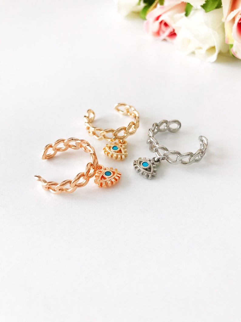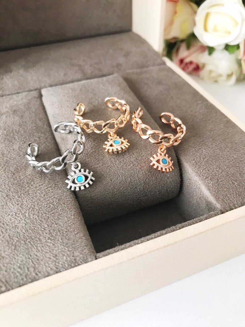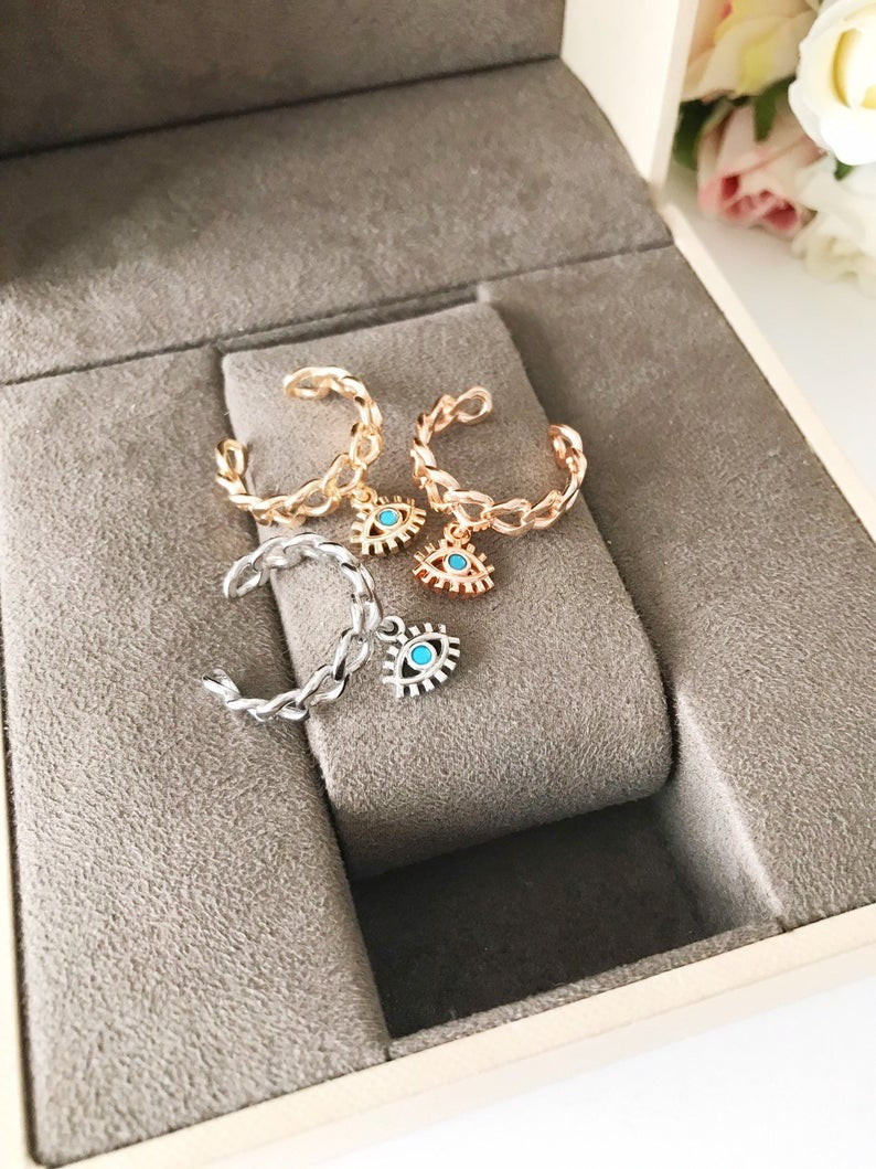 Our Dangle Evil Eye Rings come in three exquisite finishes: silver, gold, and rose gold. Each finish offers a unique look, allowing you to choose the one that best complements your personal style. The silver rings provide a classic and timeless appeal, while the gold and rose gold options add a touch of warmth and sophistication.
