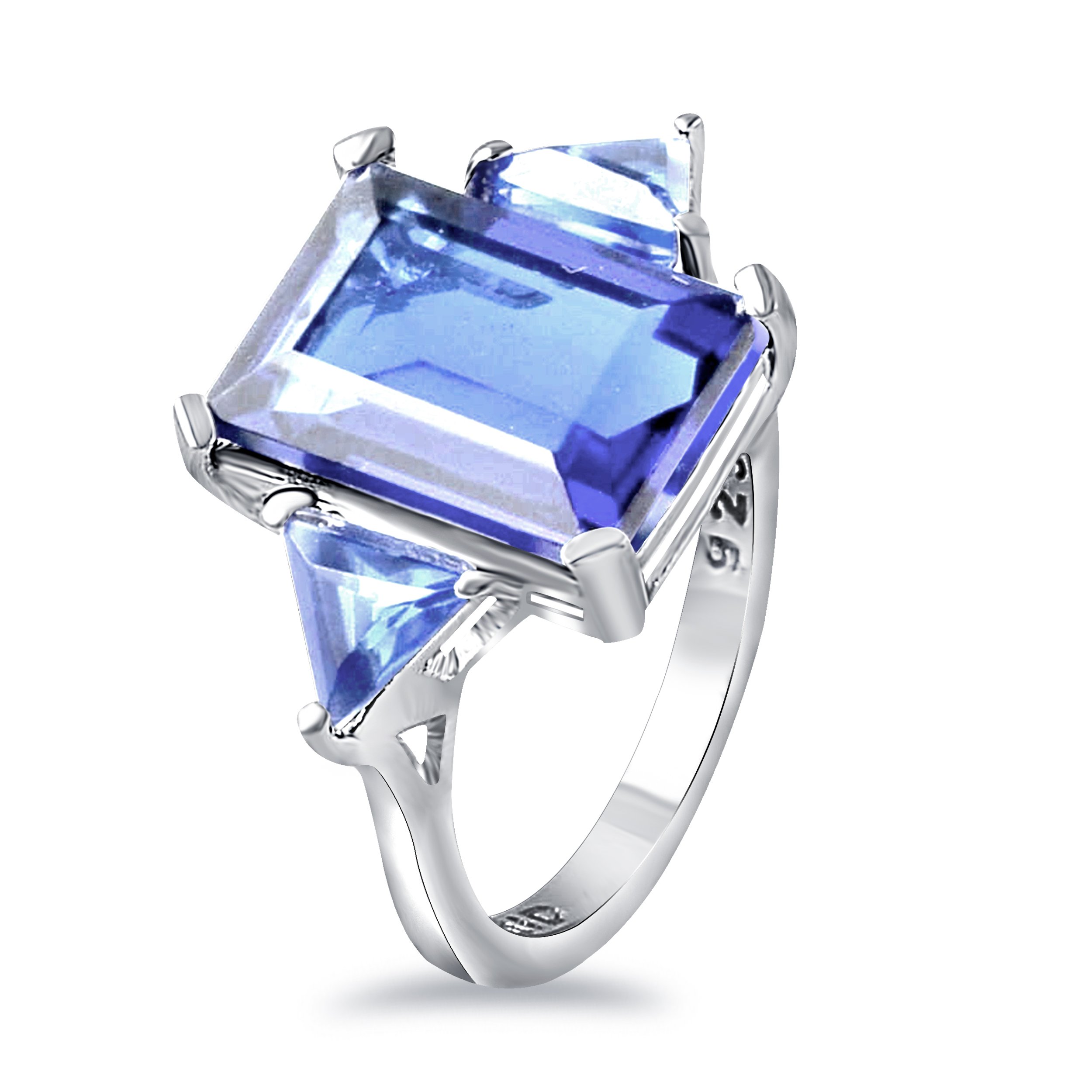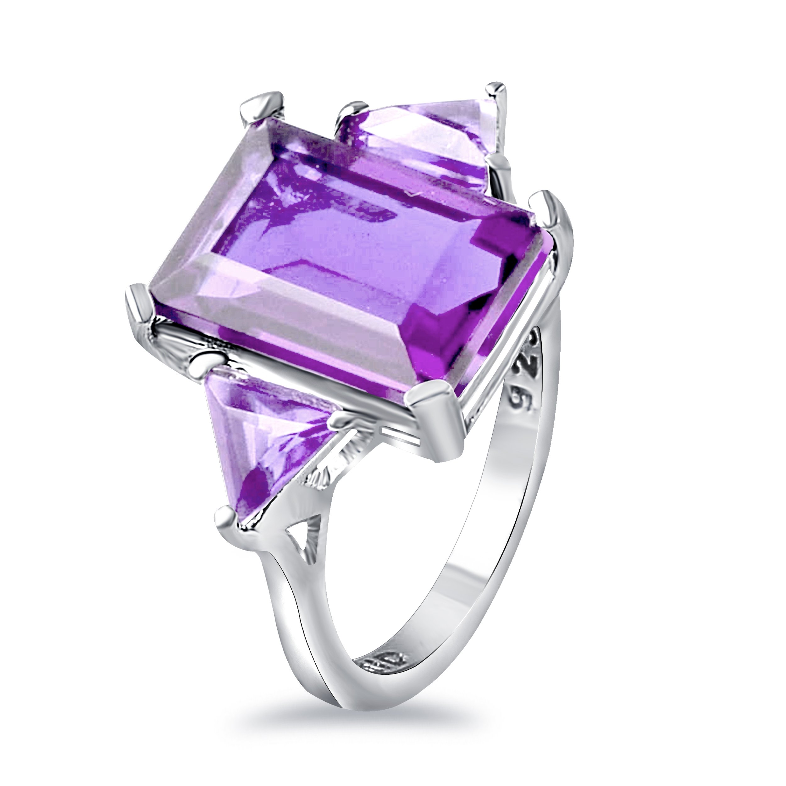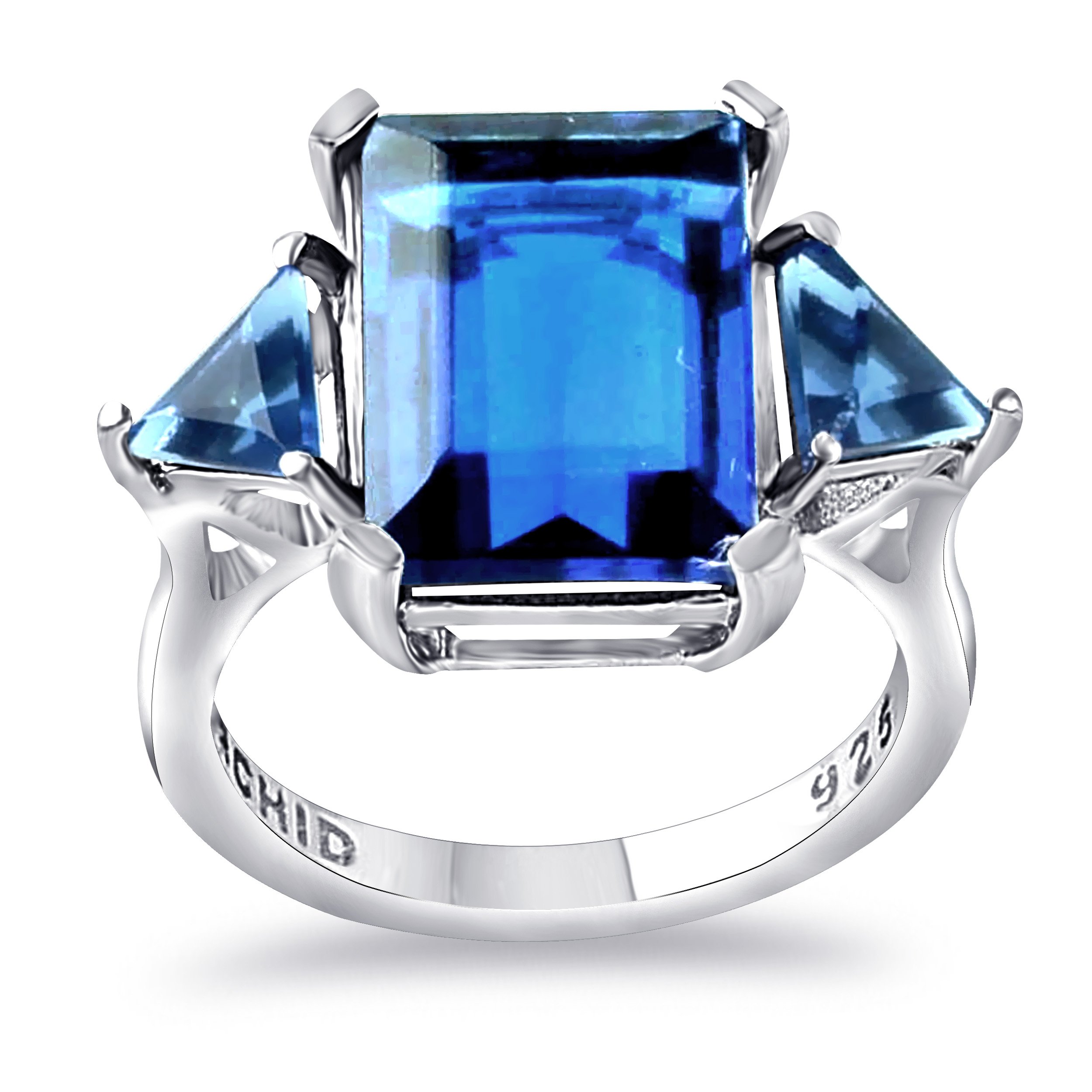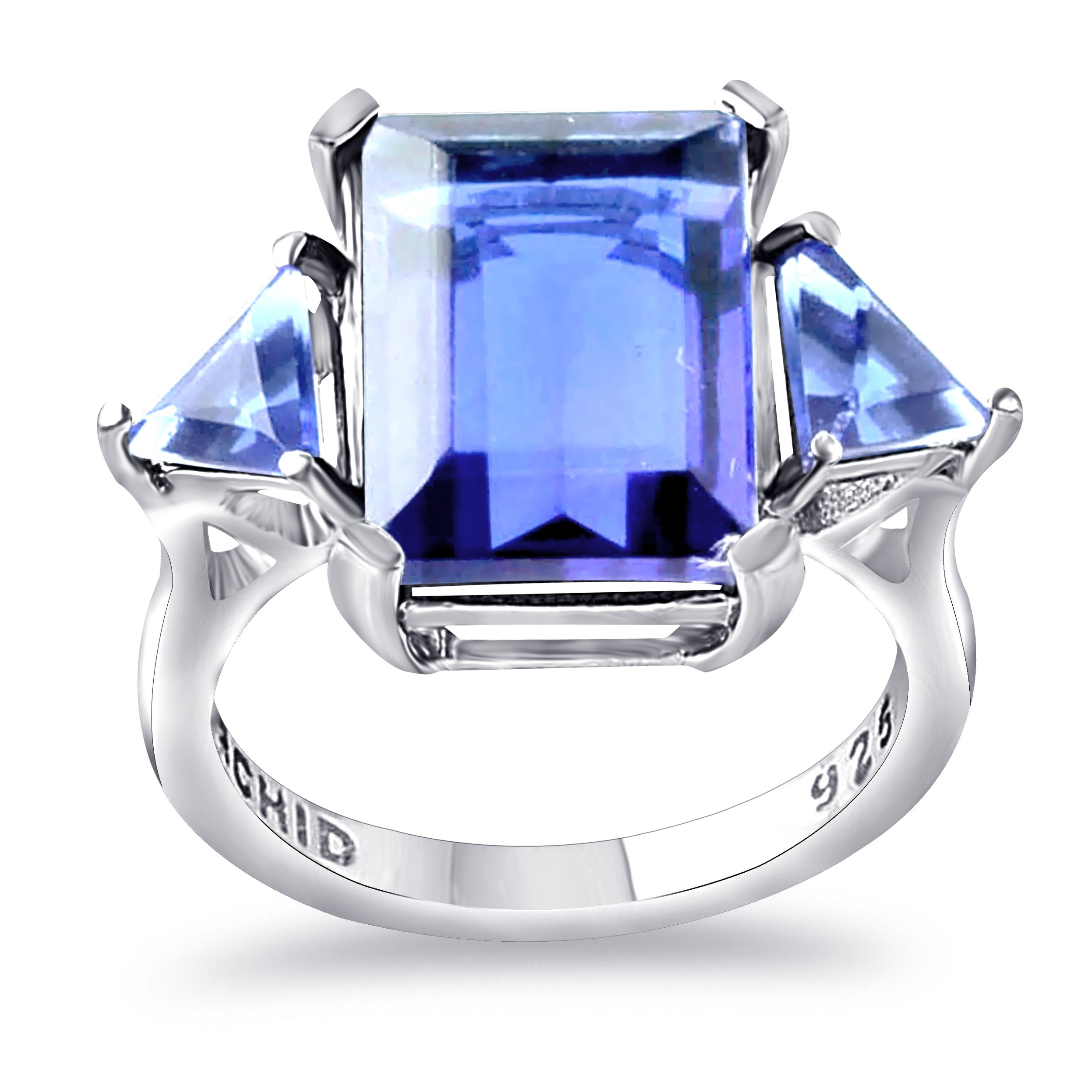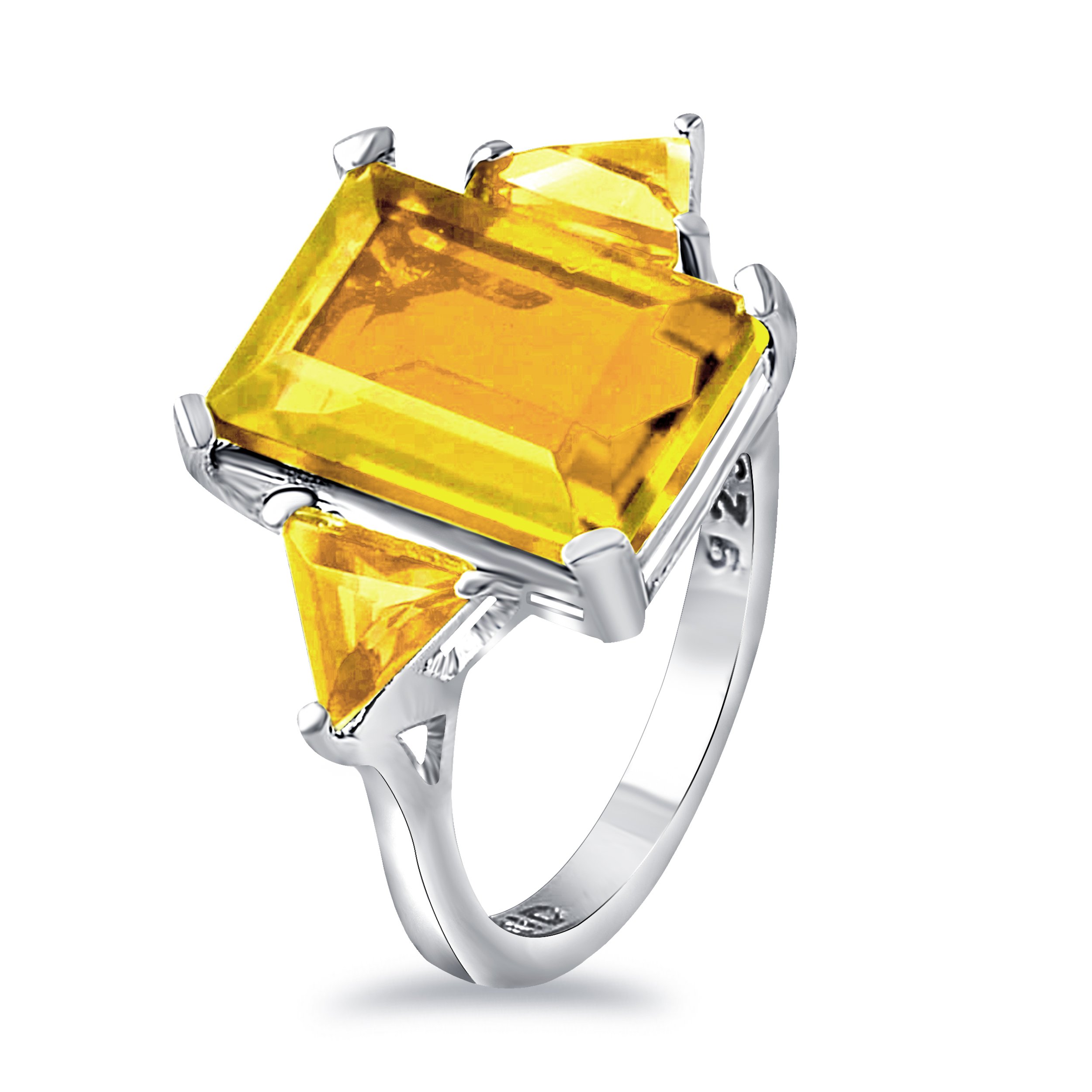 This 3-stone ring features a selection of beautiful lab-created gemstones, including Emerald, Peridot, Citrine, Garnet, Blue Topaz, Tanzanite, Sapphire, Amethyst, and White CZ. Each gemstone is carefully set using a prong setting, ensuring that they are securely held in place while allowing maximum light to pass through, enhancing their brilliance. The combination of octagon and triangle stone shapes adds a unique touch to the overall design.