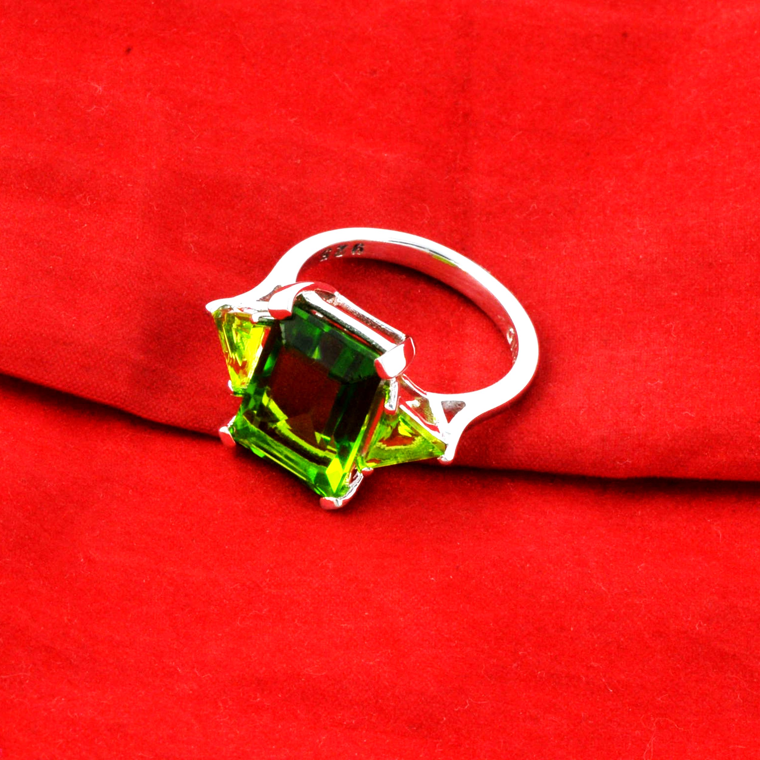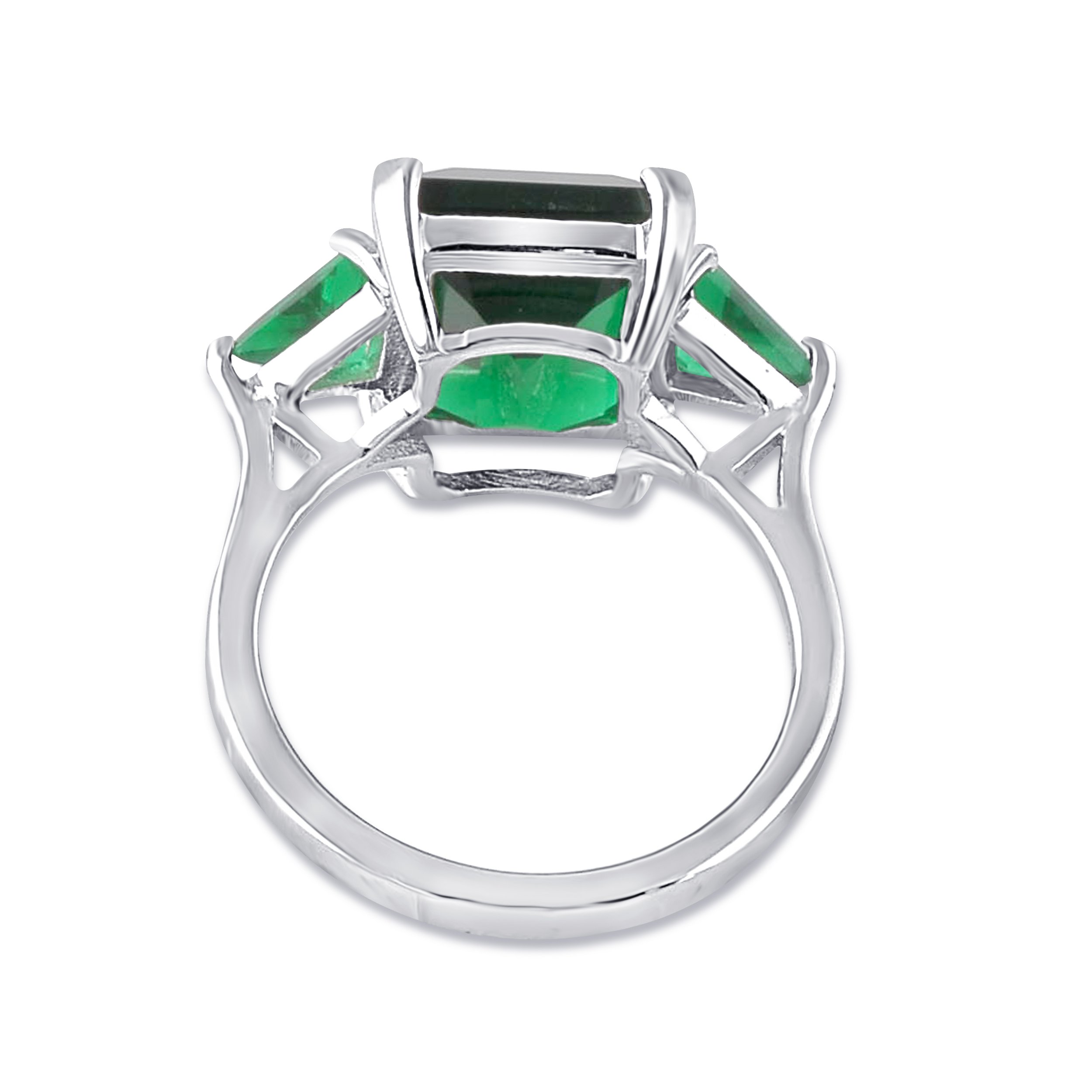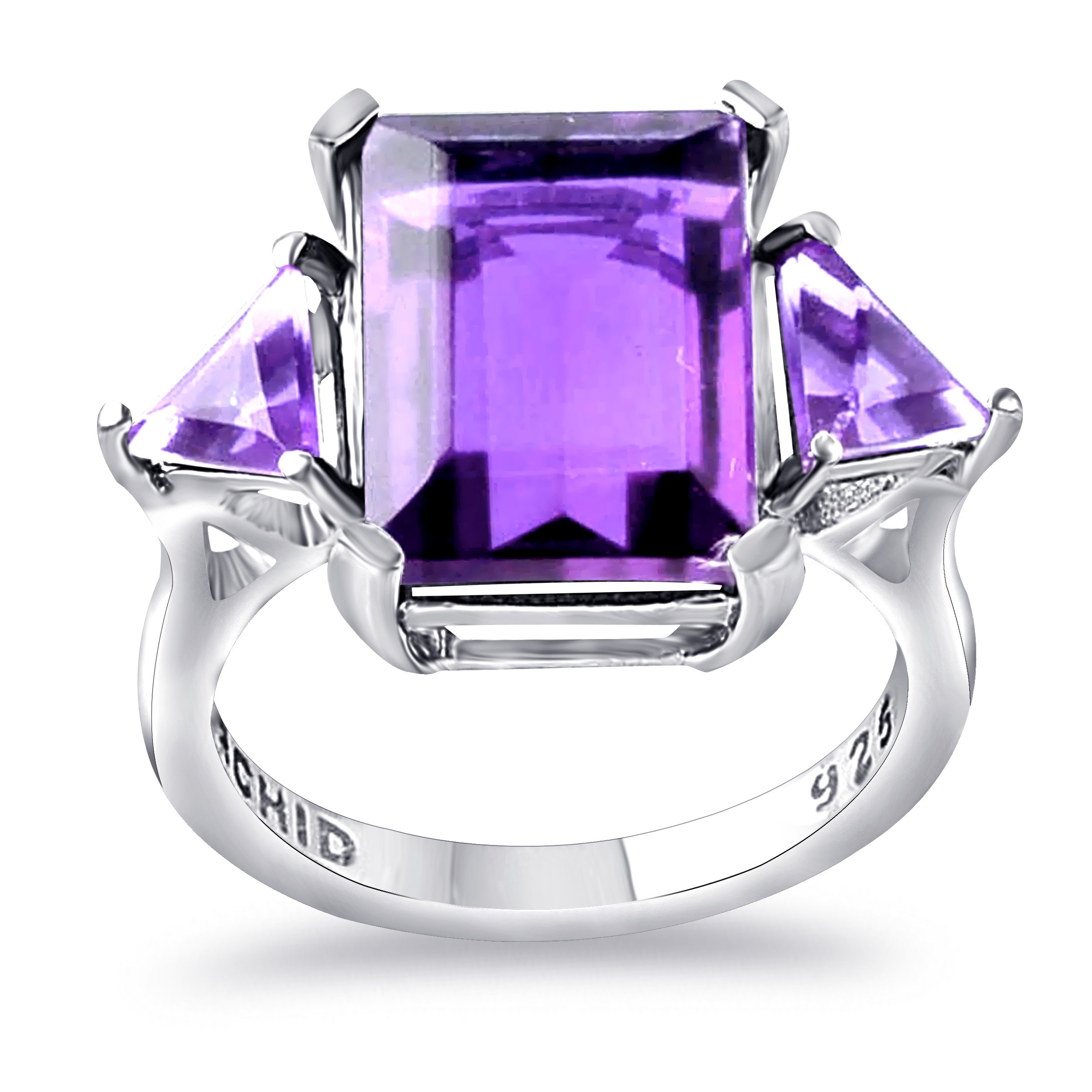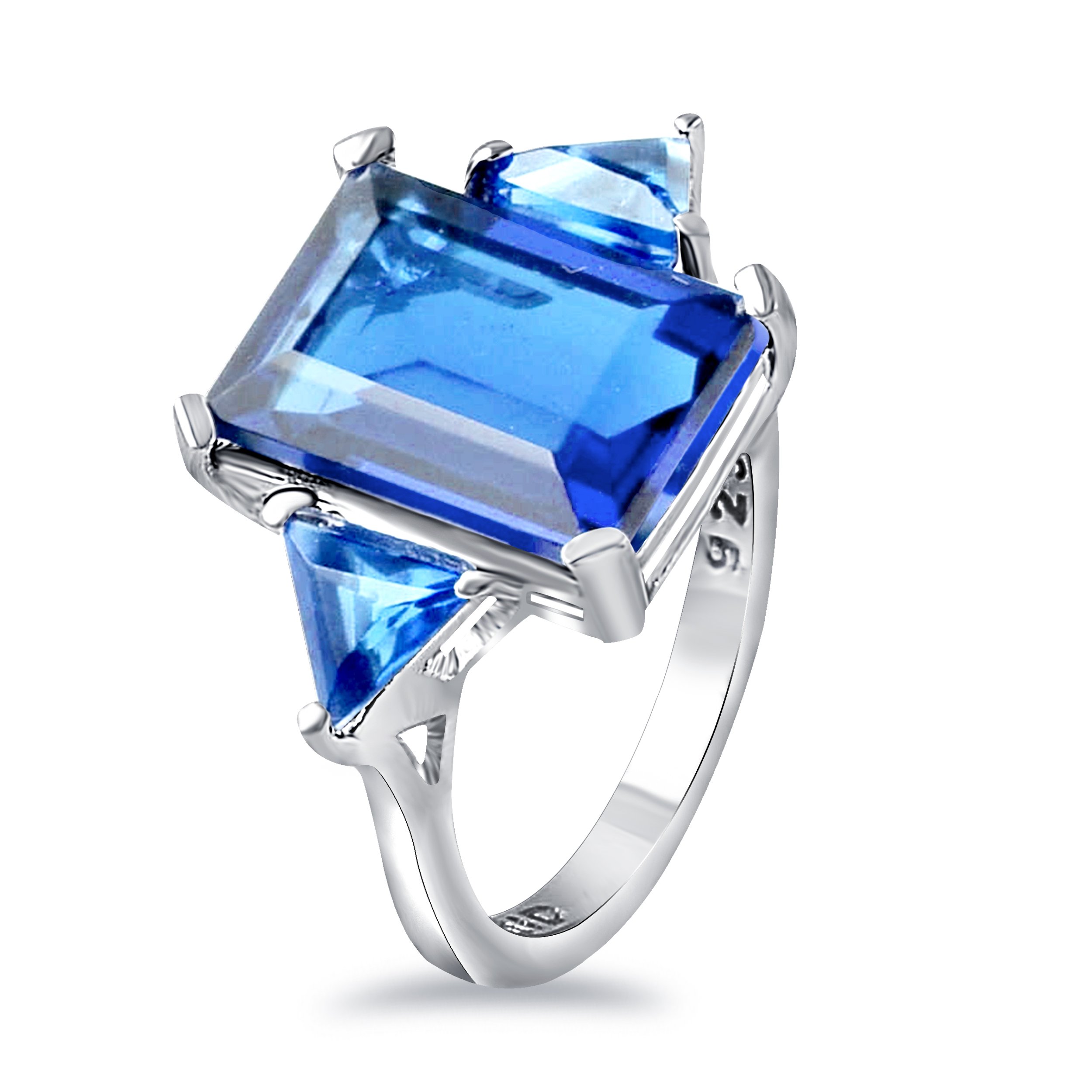 This 3-stone ring features a selection of beautiful lab-created gemstones, including Emerald, Peridot, Citrine, Garnet, Blue Topaz, Tanzanite, Sapphire, Amethyst, and White CZ. Each gemstone is carefully set using a prong setting, ensuring that they are securely held in place while allowing maximum light to pass through, enhancing their brilliance. The combination of octagon and triangle stone shapes adds a unique touch to the overall design.