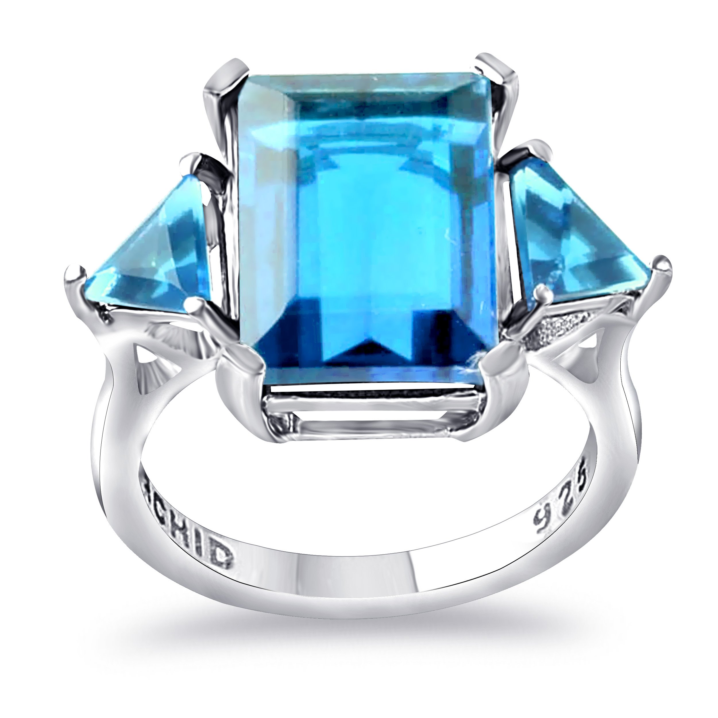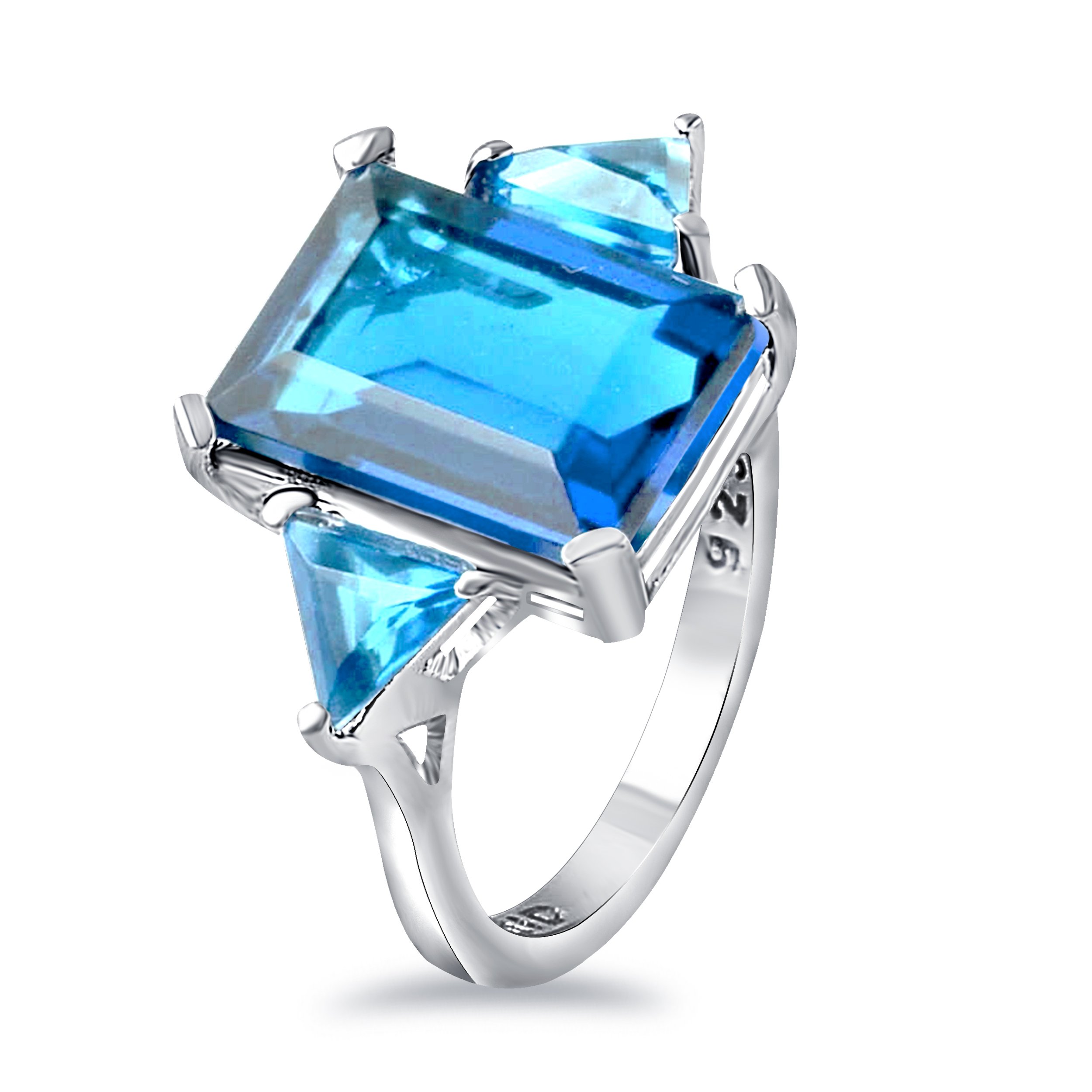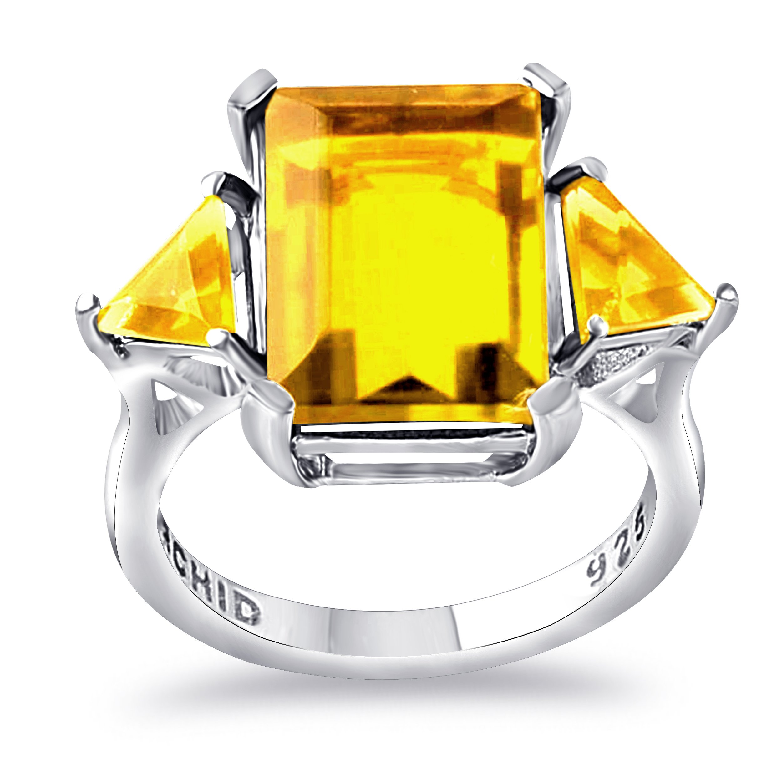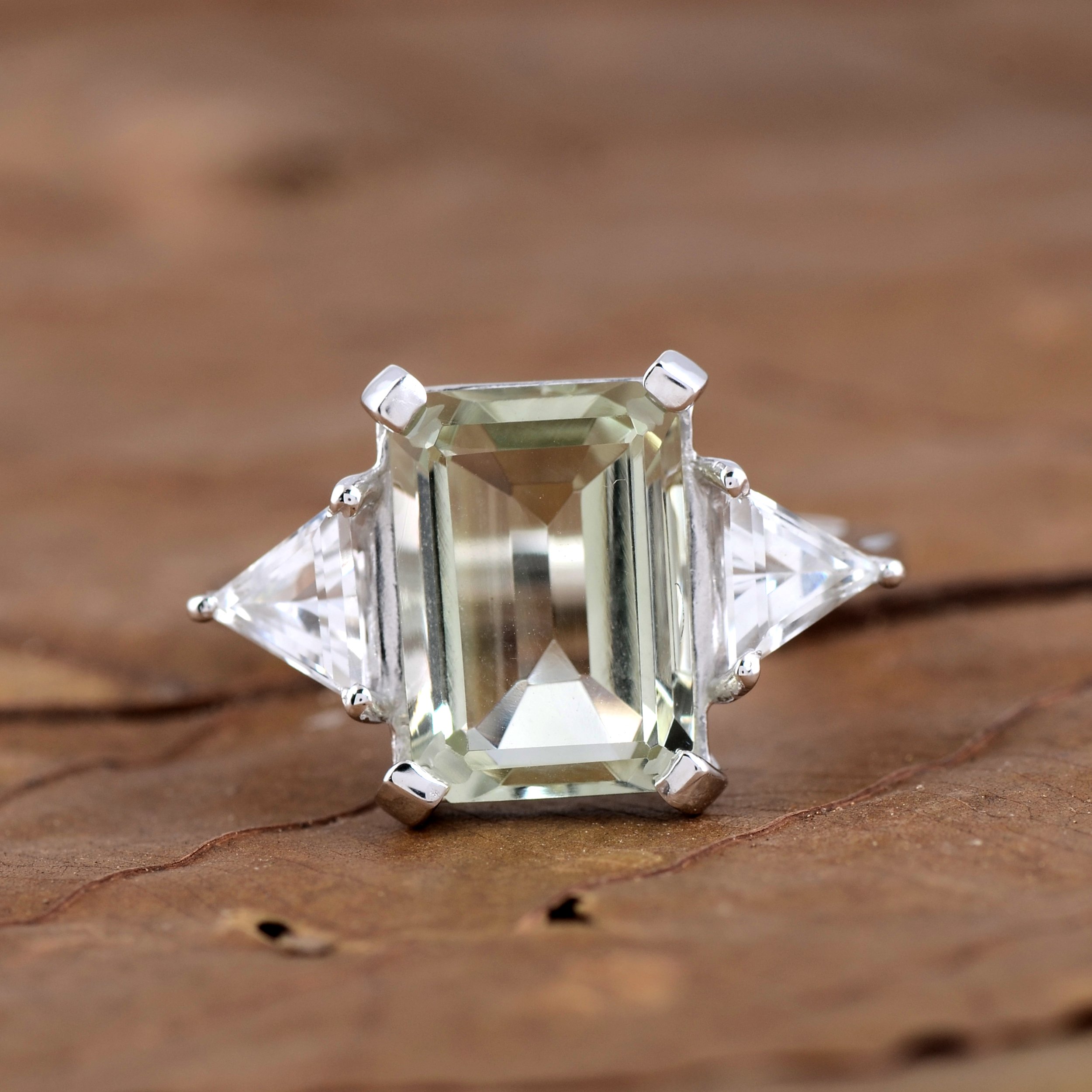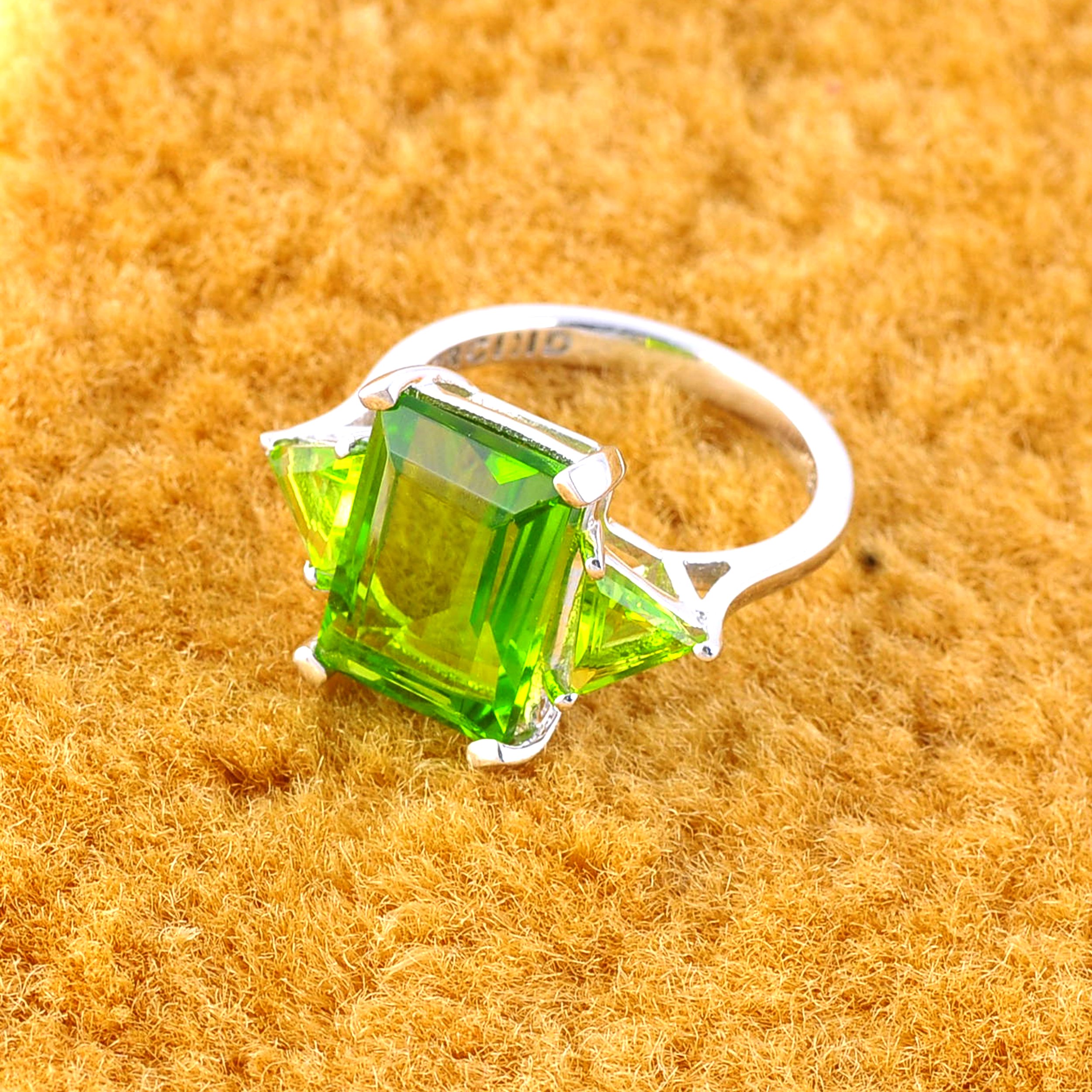 This 3-stone ring features a selection of beautiful lab-created gemstones, including Emerald, Peridot, Citrine, Garnet, Blue Topaz, Tanzanite, Sapphire, Amethyst, and White CZ. Each gemstone is carefully set using a prong setting, ensuring that they are securely held in place while allowing maximum light to pass through, enhancing their brilliance. The combination of octagon and triangle stone shapes adds a unique touch to the overall design.