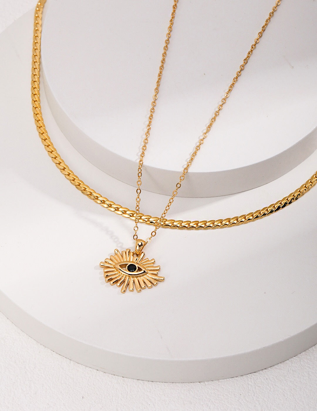 Introducing the exquisite Devil's Eye Zircon Necklace, a stunning piece of jewelry that combines elegance and craftsmanship. This necklace is handmade, featuring a beautiful heart-shaped pendant adorned with sparkling zircon stones. The gold vermeil finish, which is 18ct gold plated on sterling silver, adds a luxurious touch to this unique accessory.