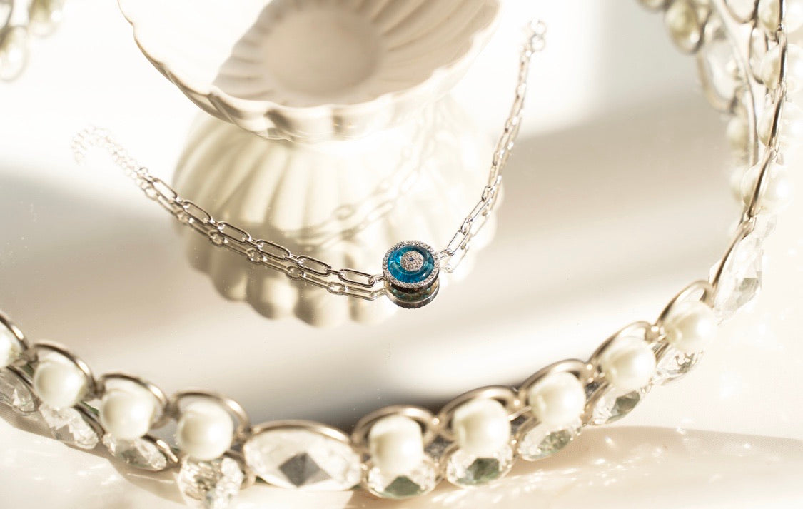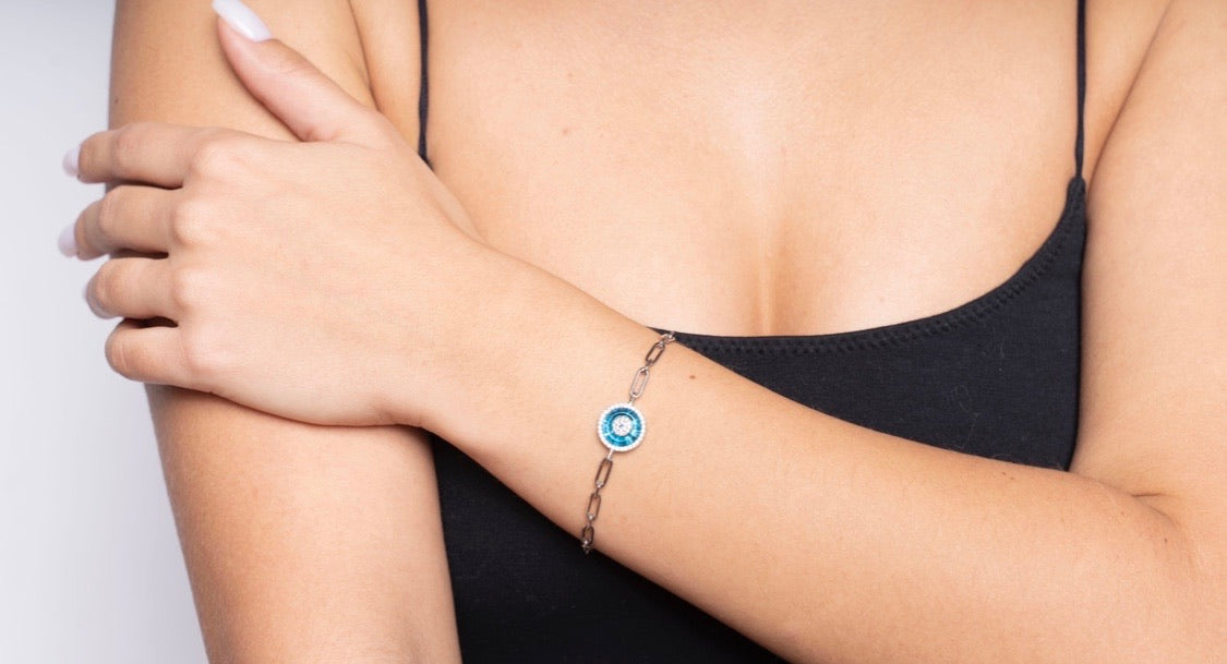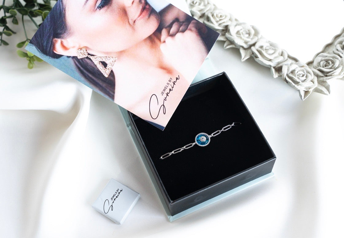 Crafted from high-quality 925 sterling silver, the ELLA Bracelet showcases exceptional craftsmanship. The bracelet is designed with a delicate cable chain that adds to its contemporary look. The ocean-blue enamel evil eye is beautifully embellished with sparkling round-cut cubic zirconias, which catch the light and add a touch of glamour to any outfit.