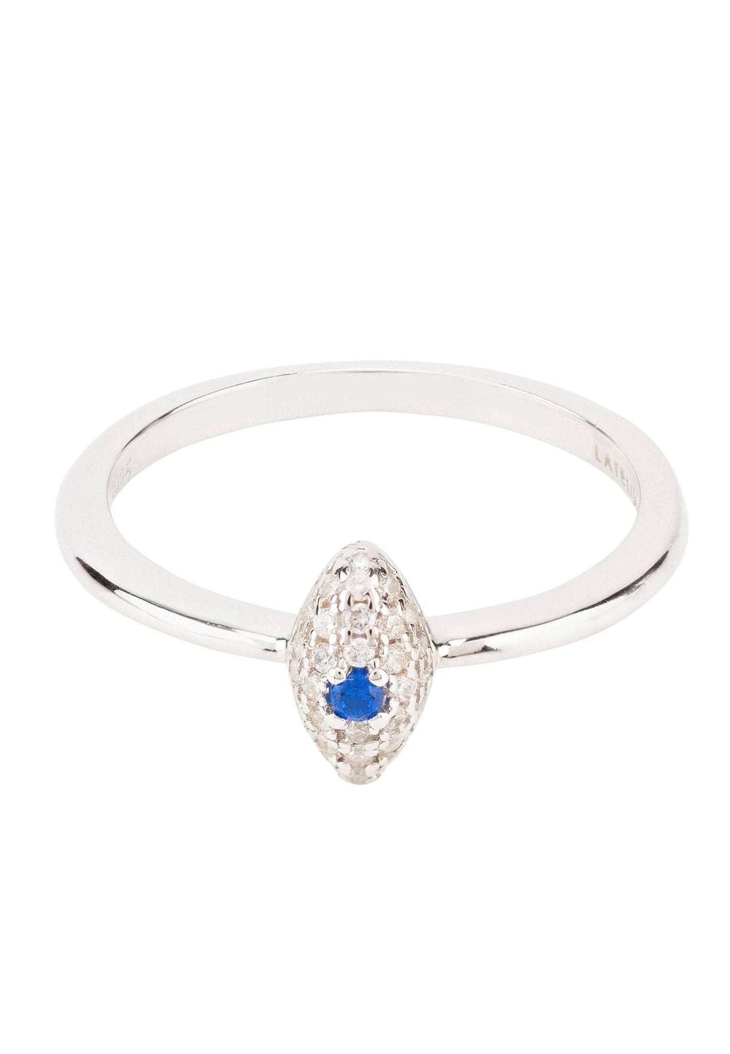 This pretty and petite ring features a captivating eye motif adorned with sparkling white zirconia, with a striking blue zircon at its center. The design is simple yet eye-catching, making it a versatile addition to any jewelry collection. Whether worn alone for a minimalist look or stacked with other rings from Latelita London, this ring is sure to enhance your style.
