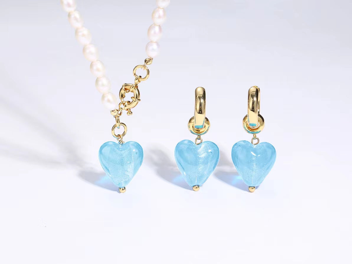 Introducing the stunning Esmée Aquamarine Glaze Heart Dangle Earrings, a perfect blend of artistry and elegance. These earrings are not just accessories; they are a statement of style and individuality. Each pair features beautiful glass heart-shaped dangles that are handmade, ensuring that no two pieces are exactly alike. The rich colors of the glaze hearts are enhanced by shimmering golden flecks, creating a captivating visual effect that is sure to turn heads.