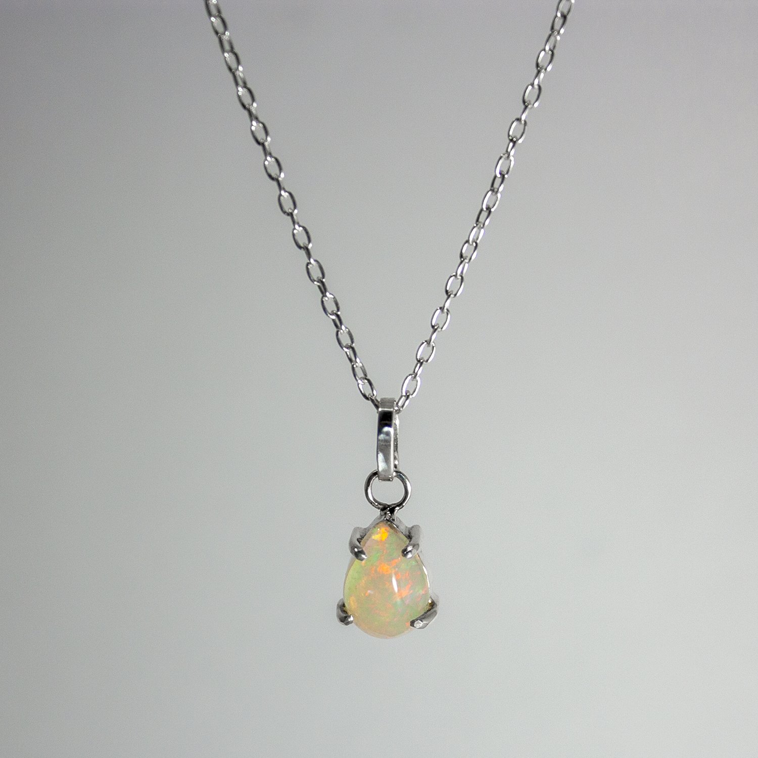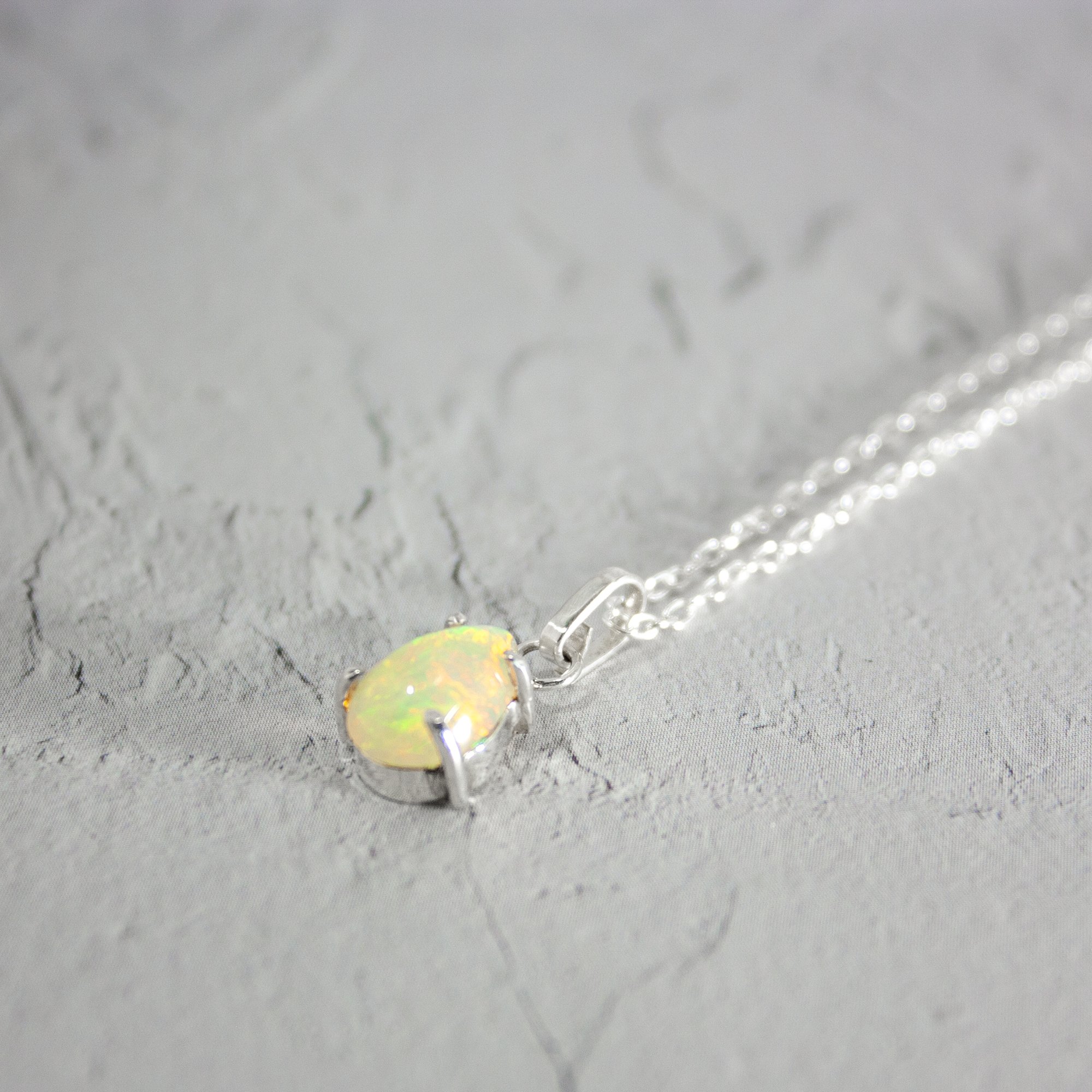 Crafted with care, this pendant necklace is made from .925 sterling silver, ensuring durability and a luxurious finish. The pear-shaped opal measures 10x7mm, perfectly sized to highlight its unique colors and patterns. Each gemstone is carefully selected for its quality, and the pendant is designed to enhance the natural beauty of the opal.