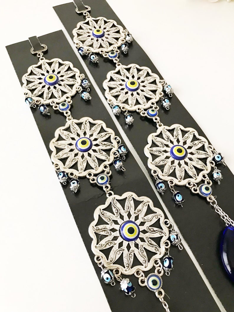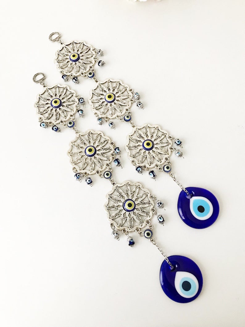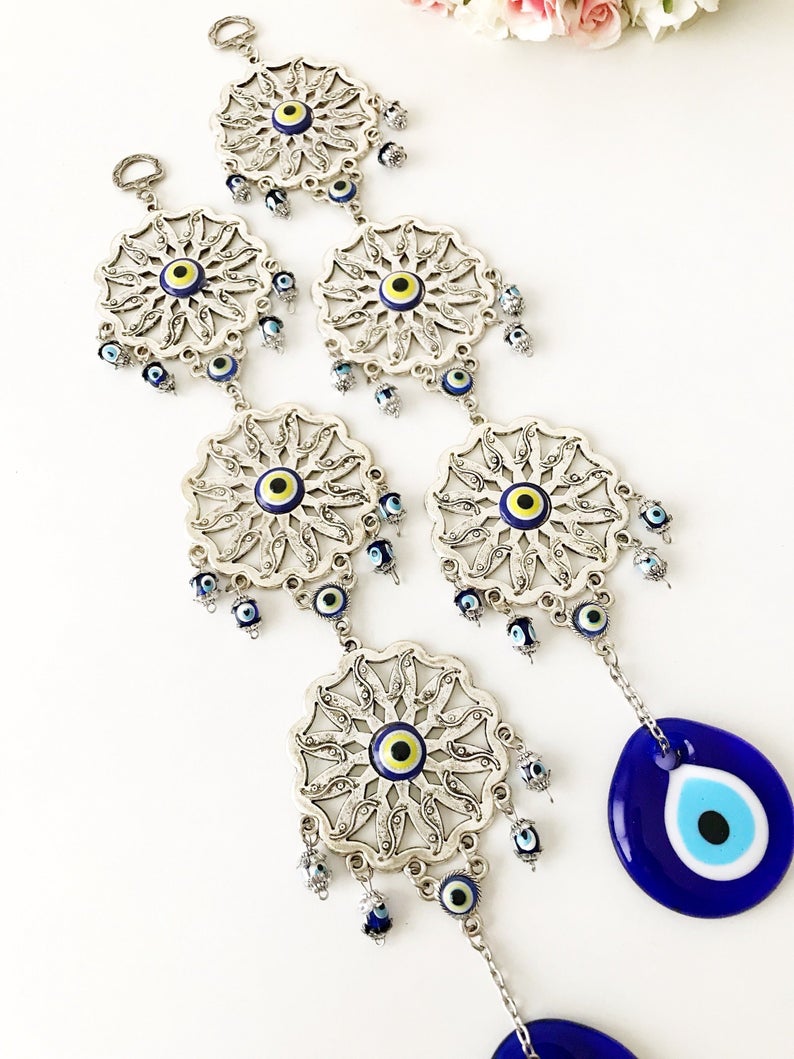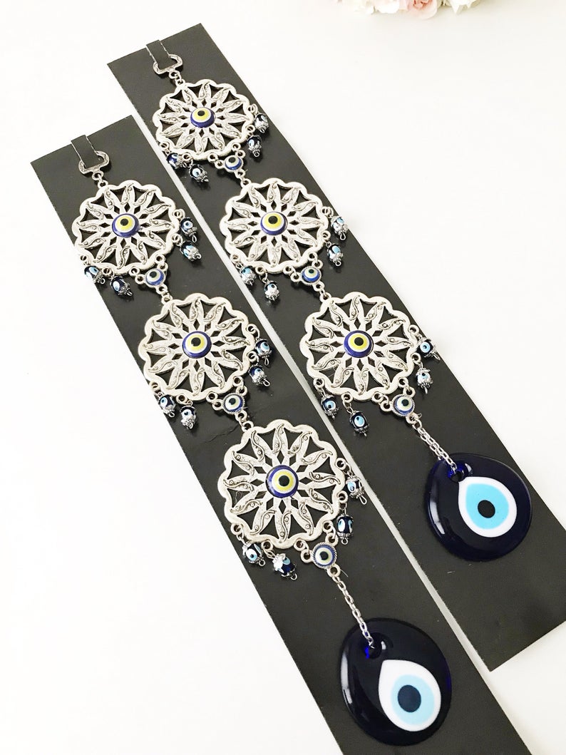 Our Evil Eye wall decor is meticulously crafted by skilled artisans who pour their creativity and passion into every piece. The use of high-quality materials ensures durability while maintaining an elegant aesthetic. The combination of vibrant blue evil eye beads and the delicate metal sunflower figures creates a striking visual that captures attention and admiration.