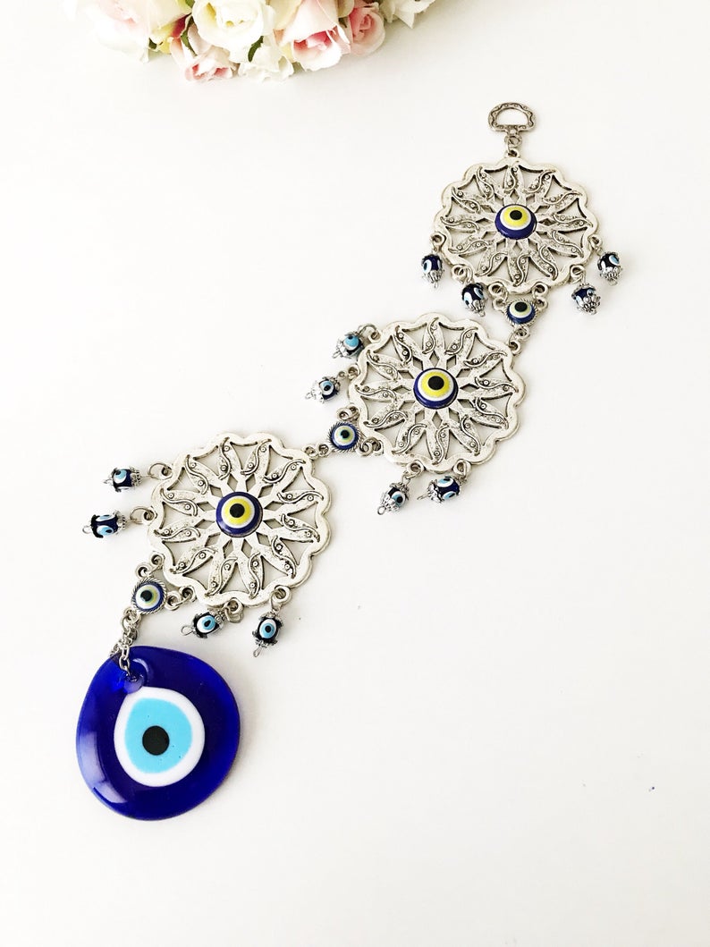 Transform your living space with our stunning Evil Eye Blue Wall Decor featuring three intricately designed sunflowers. This unique piece is not just a decorative item; it embodies cultural significance and artistic craftsmanship. Each wall hanging is handmade, ensuring that every piece is one-of-a-kind, adding a personal touch to your home.