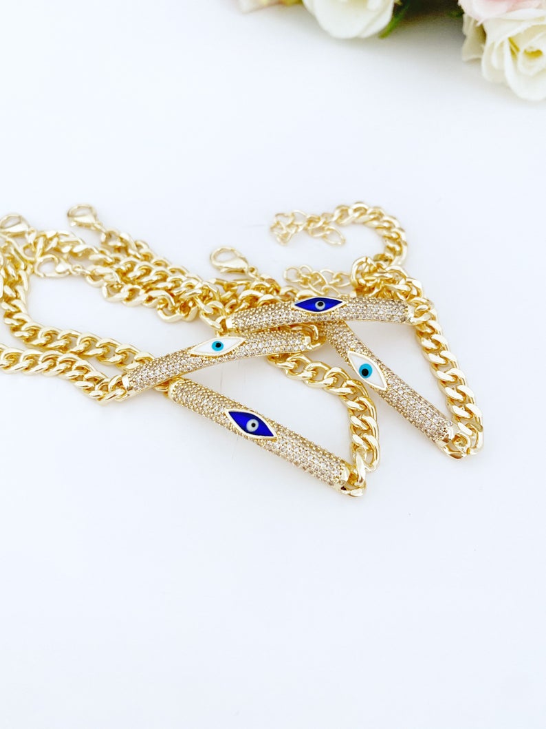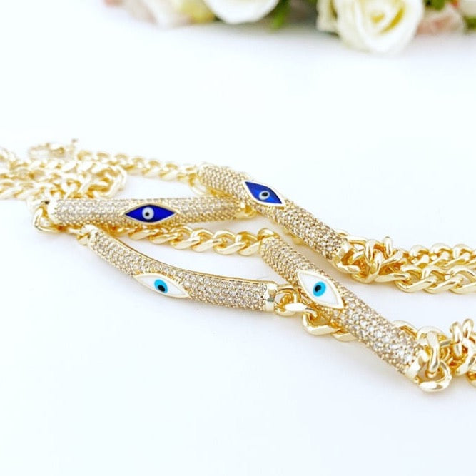 The Evil Eye Bracelet is a beautiful piece of jewelry that combines elegance with cultural significance. This stunning bracelet features a gold link chain adorned with blue and white evil eye charms, symbolizing protection and warding off negative energy. Whether you're looking to enhance your personal style or searching for the perfect gift for a loved one, this bracelet is an excellent choice.