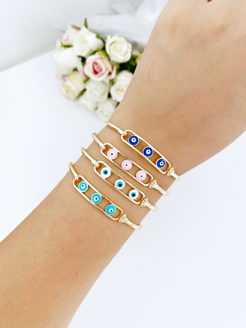 The Evil Eye Bracelet features a unique hook design that makes it easy to wear. The main oval evil eye charm is movable, providing flexibility and comfort. This design ensures that the bracelet fits securely on your wrist while allowing the charm to move freely, adding a dynamic element to your accessory collection.