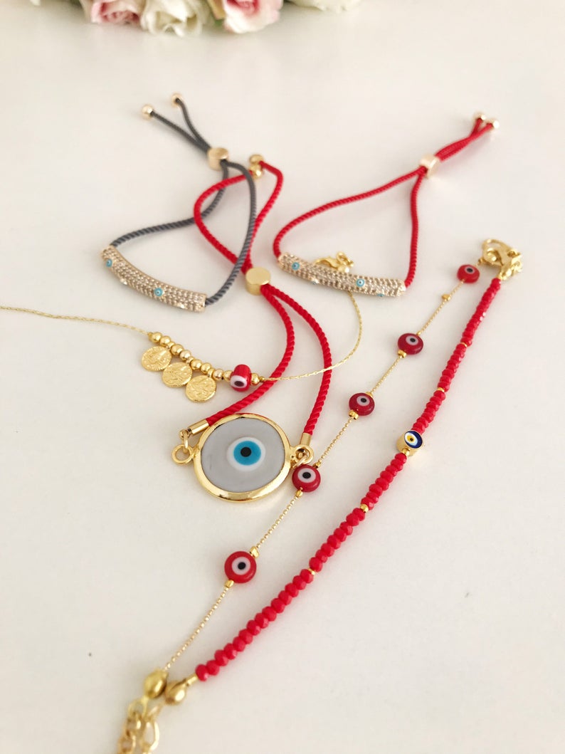 Dropship Evil Eye Bracelet, Red Beads Bracelet, Gold Link Chain Bracelet