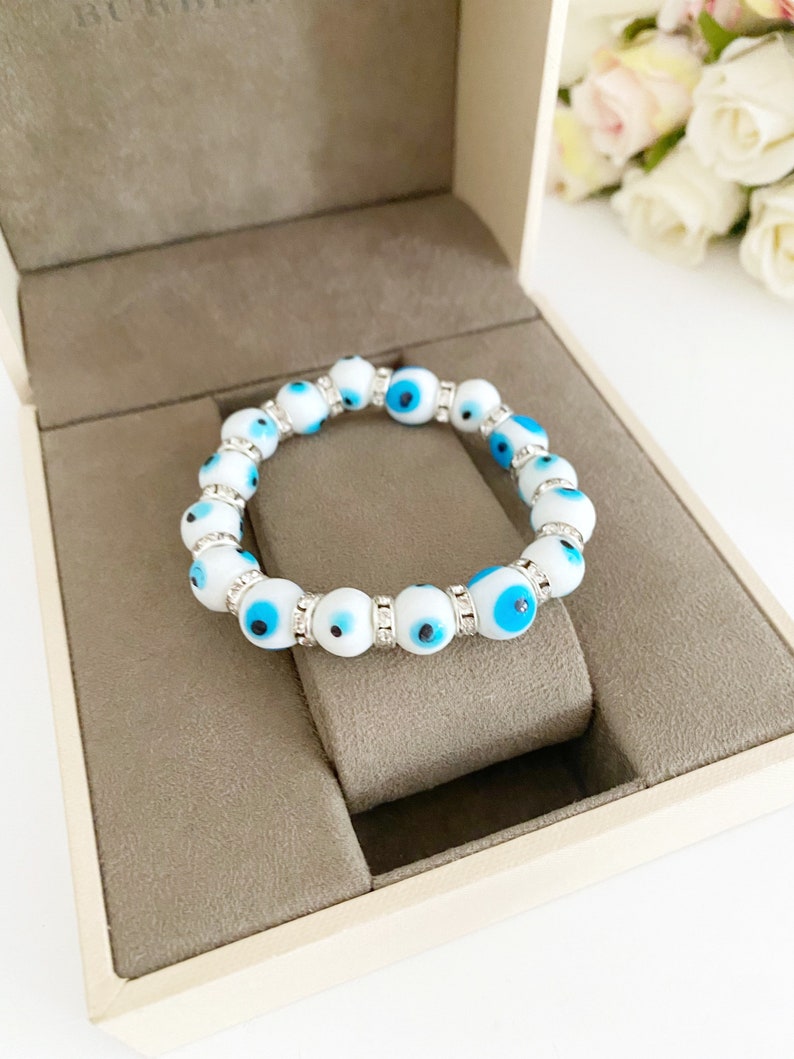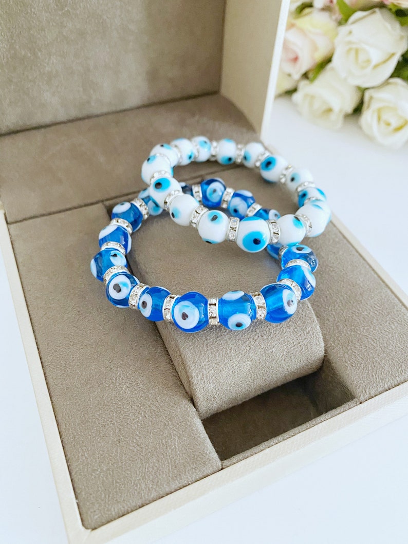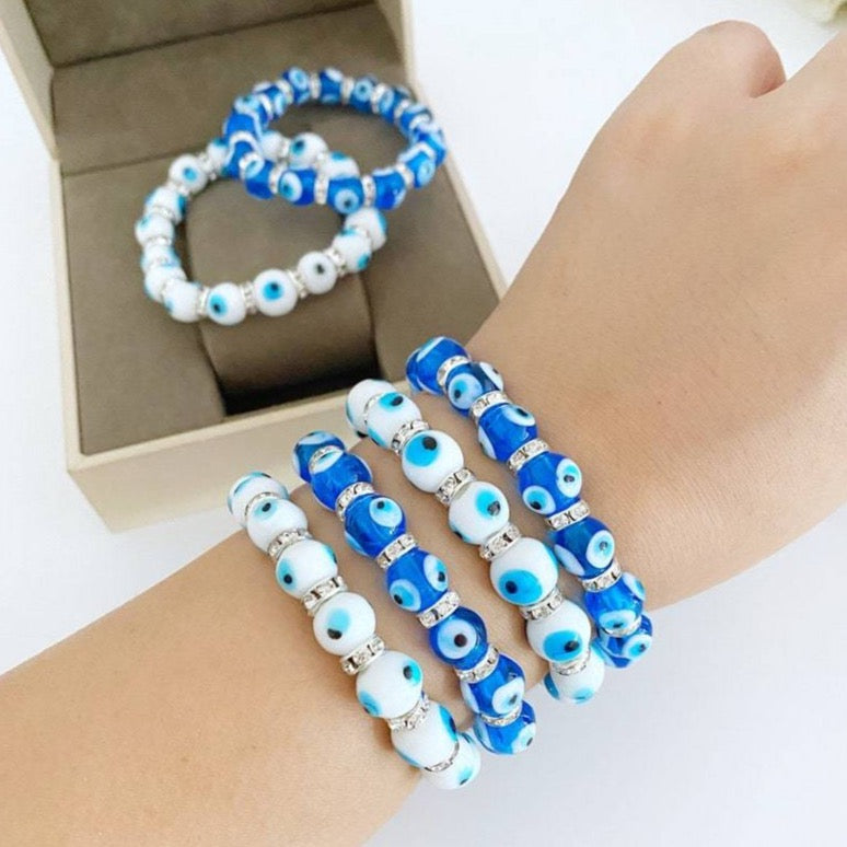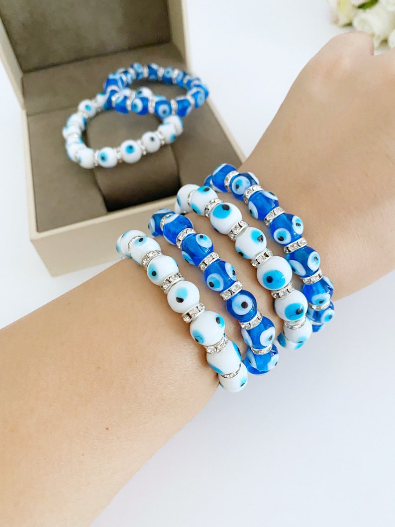 This bracelet is made from high-quality ceramic ball beads and blue glass eye beads. The ceramic beads offer durability while the glass beads add a touch of elegance. The combination of these materials ensures that the bracelet is not only visually appealing but also long-lasting. The blue evil eye beads are particularly significant, as they are known for their protective properties.