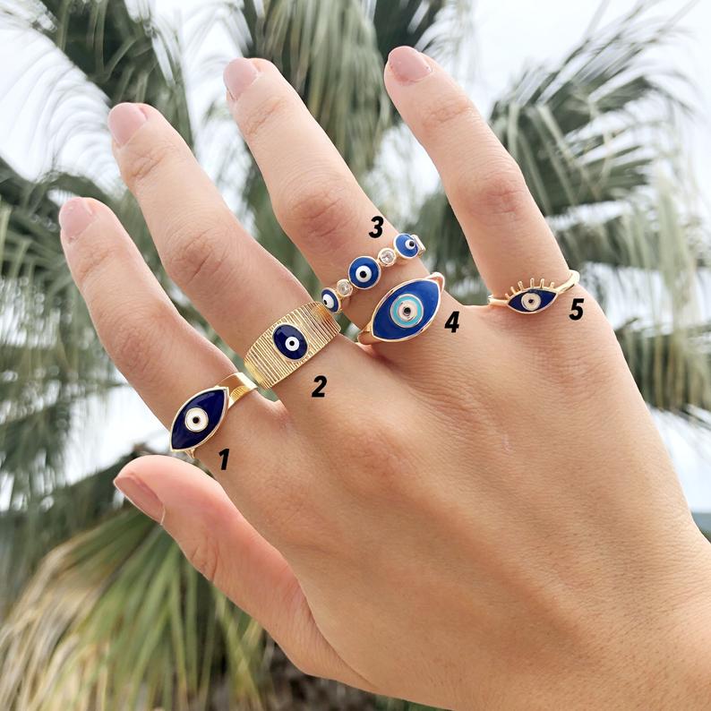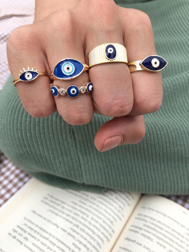 The Evil Eye Ring Set includes five different styles, each with its own unique design. This variety allows you to mix and match according to your outfit or mood. Whether you prefer a simple and elegant look or something more intricate, this collection has something for everyone. Choose your favorite styles during checkout and express your individuality.