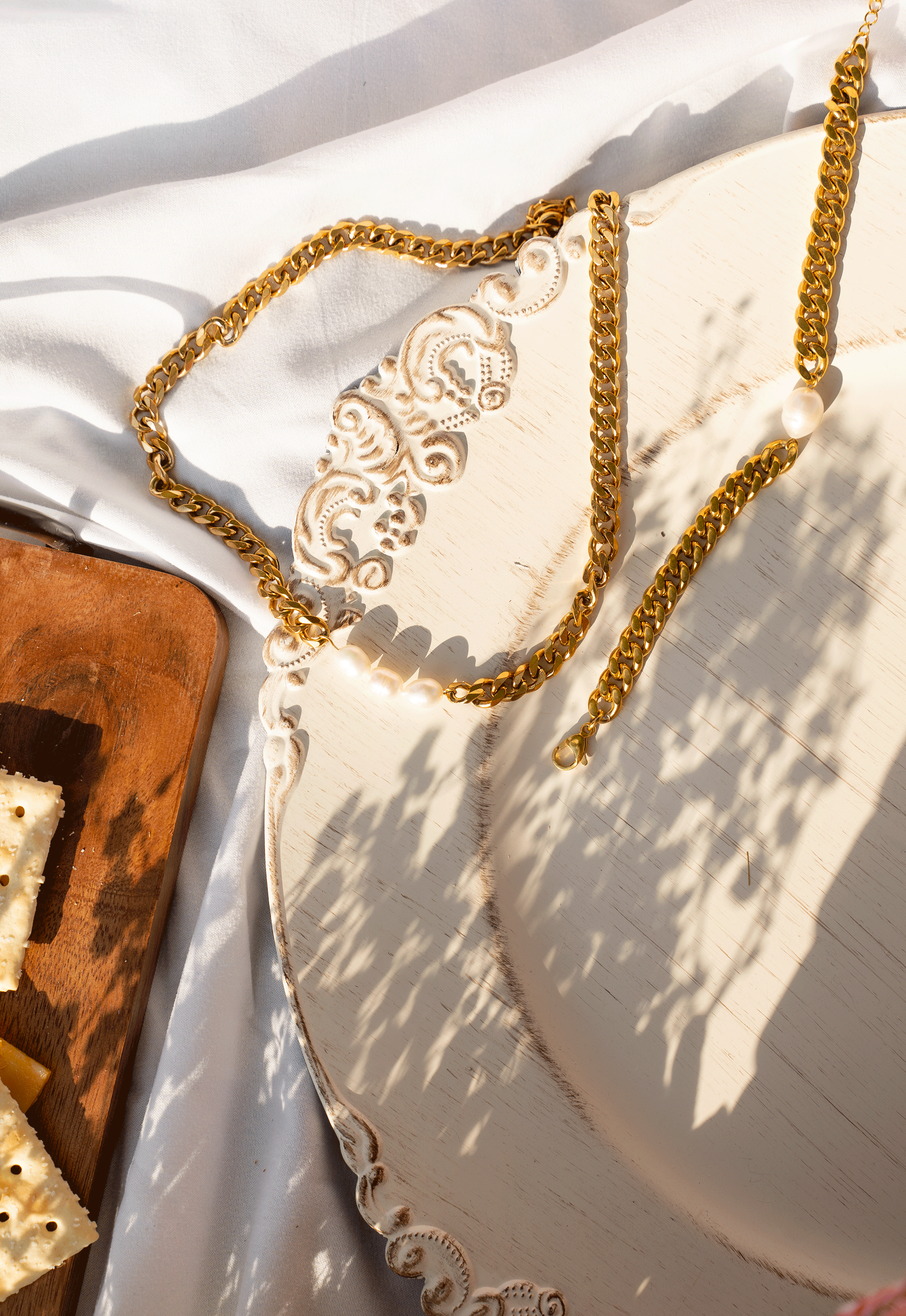EZLYN Necklace featuring freshwater pearls and an 18k gold plated metal plate, elegantly designed for versatile wear.