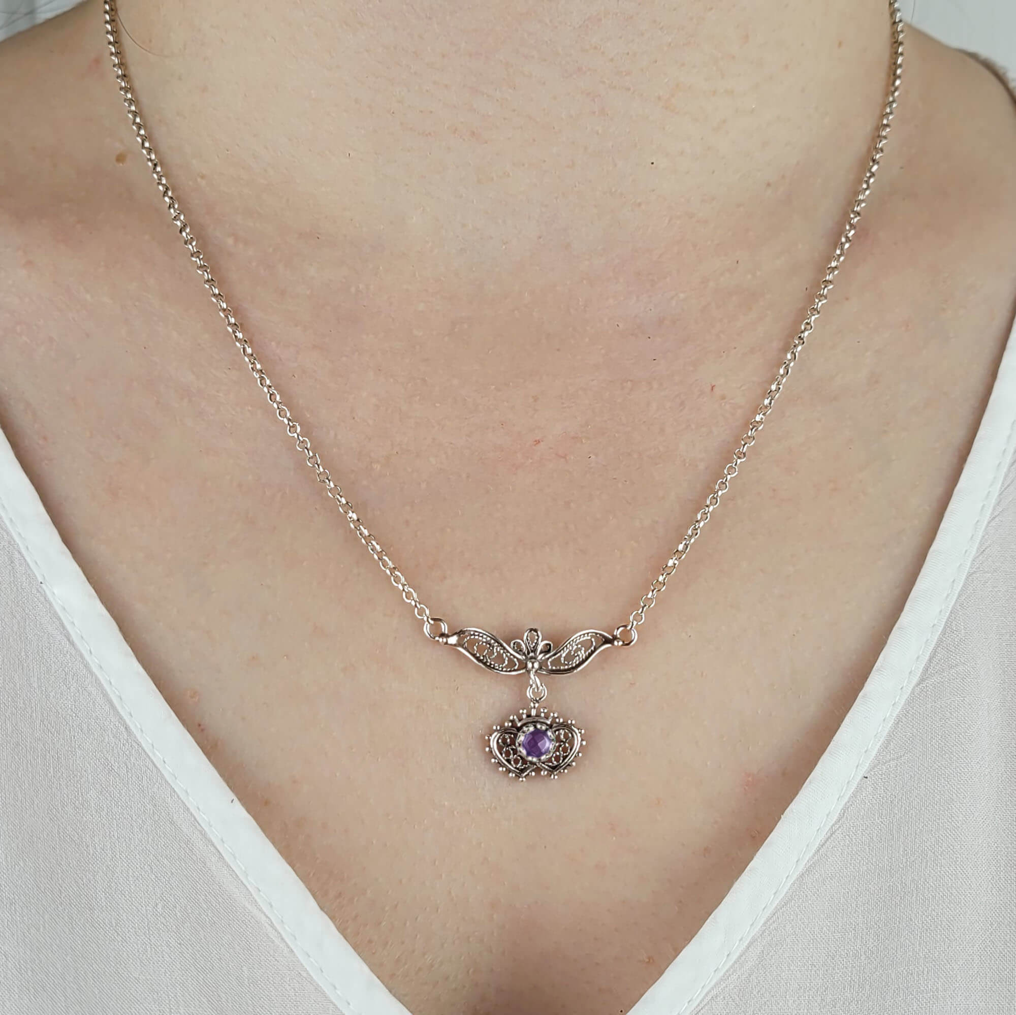 Whether you're dressing up for a special occasion or adding a touch of elegance to your everyday wear, the Filigree Art Amethyst / Blue Topaz Heart to Heart Design Women Silver Necklace is the perfect choice. Its unique design, high-quality materials, and stunning gemstones make it a must-have accessory for any jewelry lover.