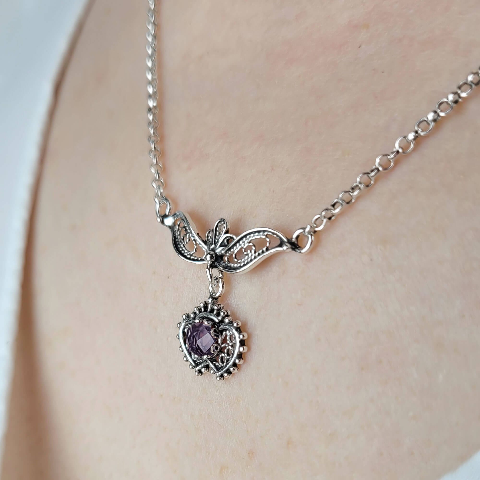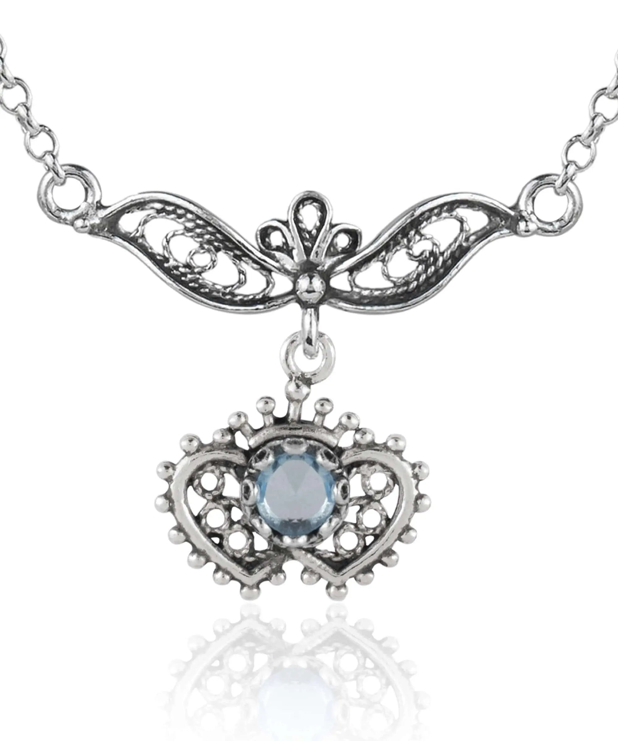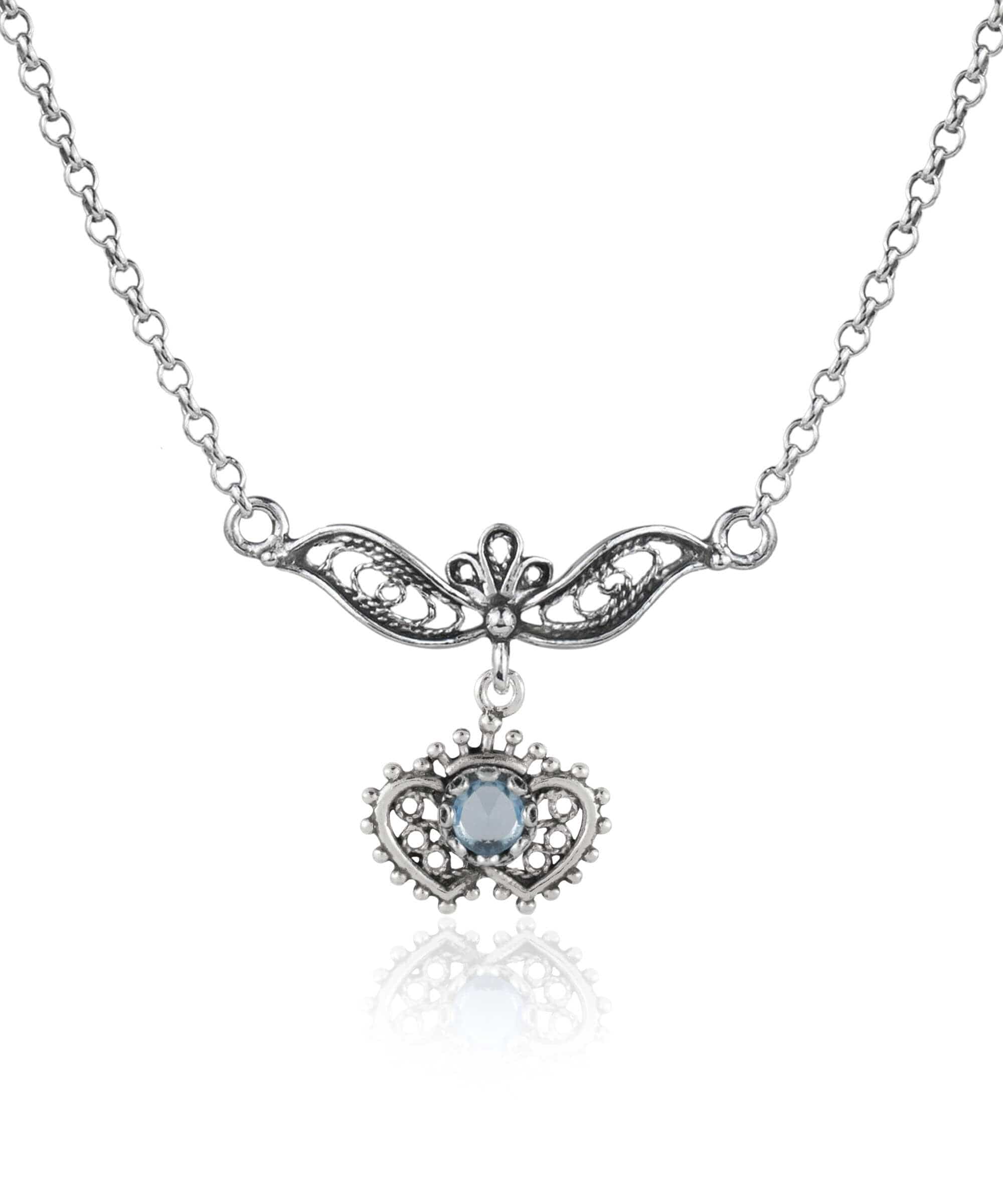 Introducing the exquisite Filigree Art Amethyst / Blue Topaz Heart to Heart Design Women Silver Necklace, a stunning piece that combines elegance and artistry. Crafted from high-quality sterling silver, this necklace features a beautifully designed filigree pendant that showcases the intricate craftsmanship of this timeless art form. The pendant measures 0.75 inches in length and 1.00 inch in width, making it a perfect statement piece for any outfit.
