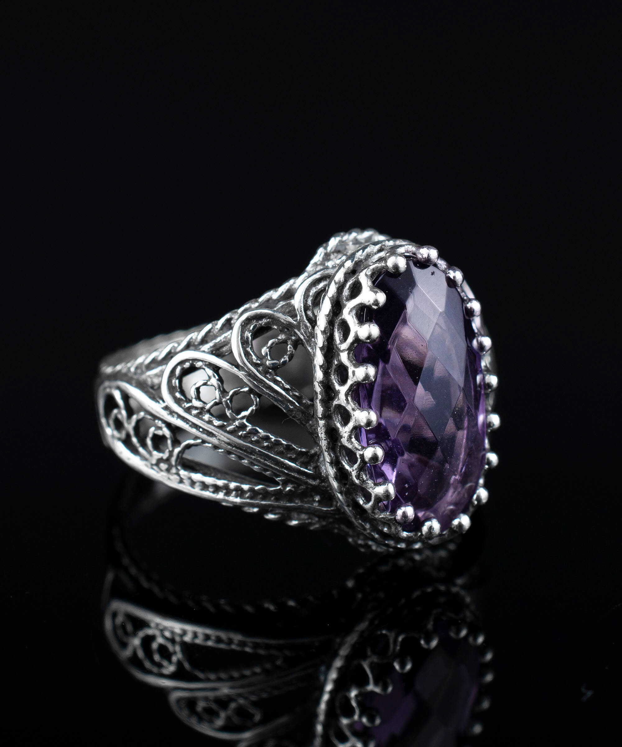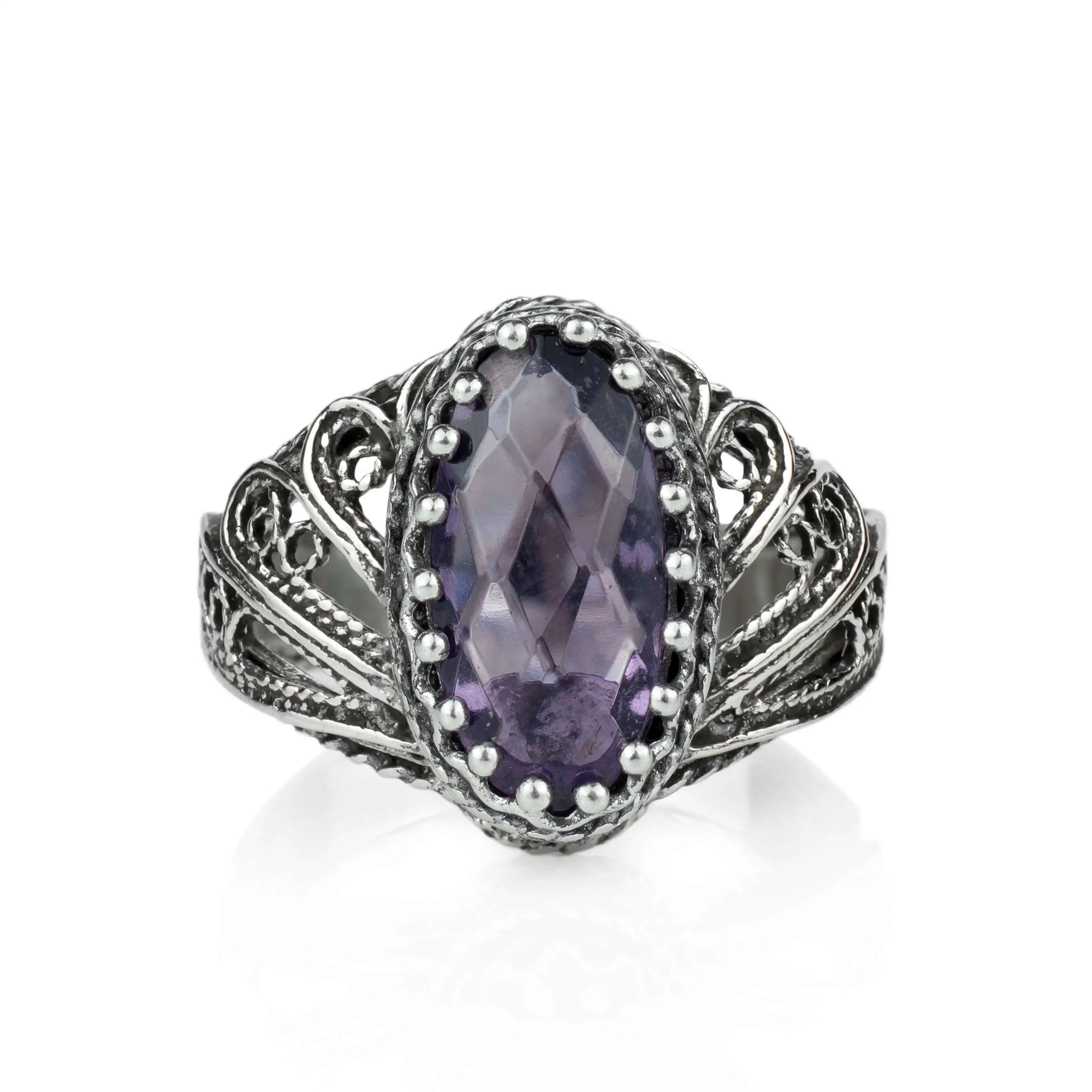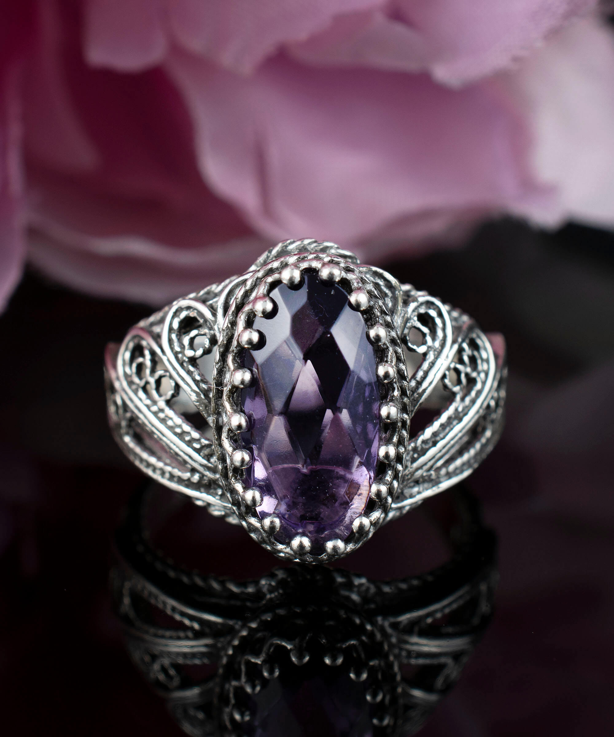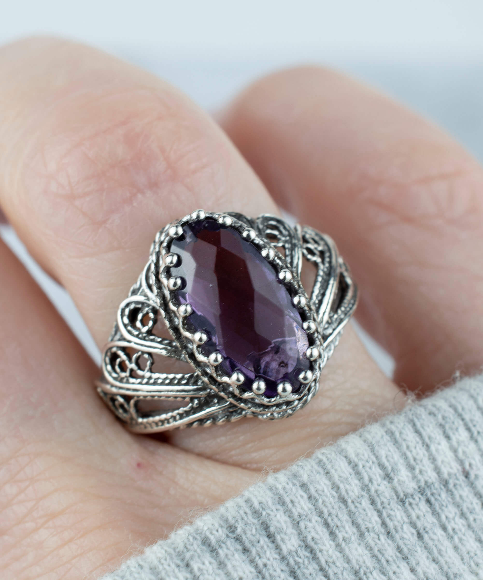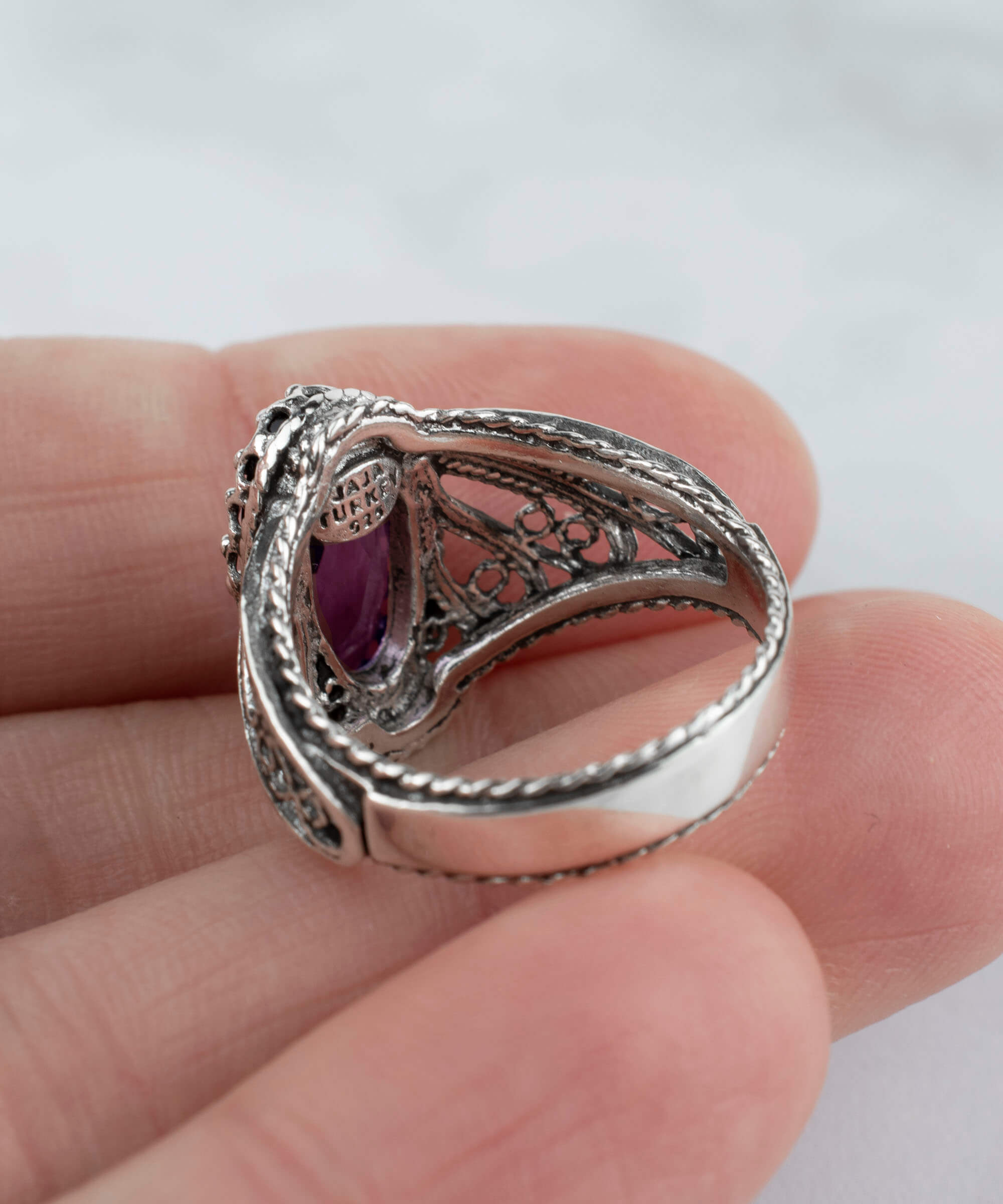 This Filigree Art Amethyst Gemstone Angel Design Ring is perfect for various occasions, whether you're attending a cocktail party, a wedding, or simply want to elevate your everyday style. Its unique design and vibrant color make it a versatile accessory that can be paired with both casual and formal outfits. You can wear it alone for a bold statement or stack it with other rings for a trendy layered look.