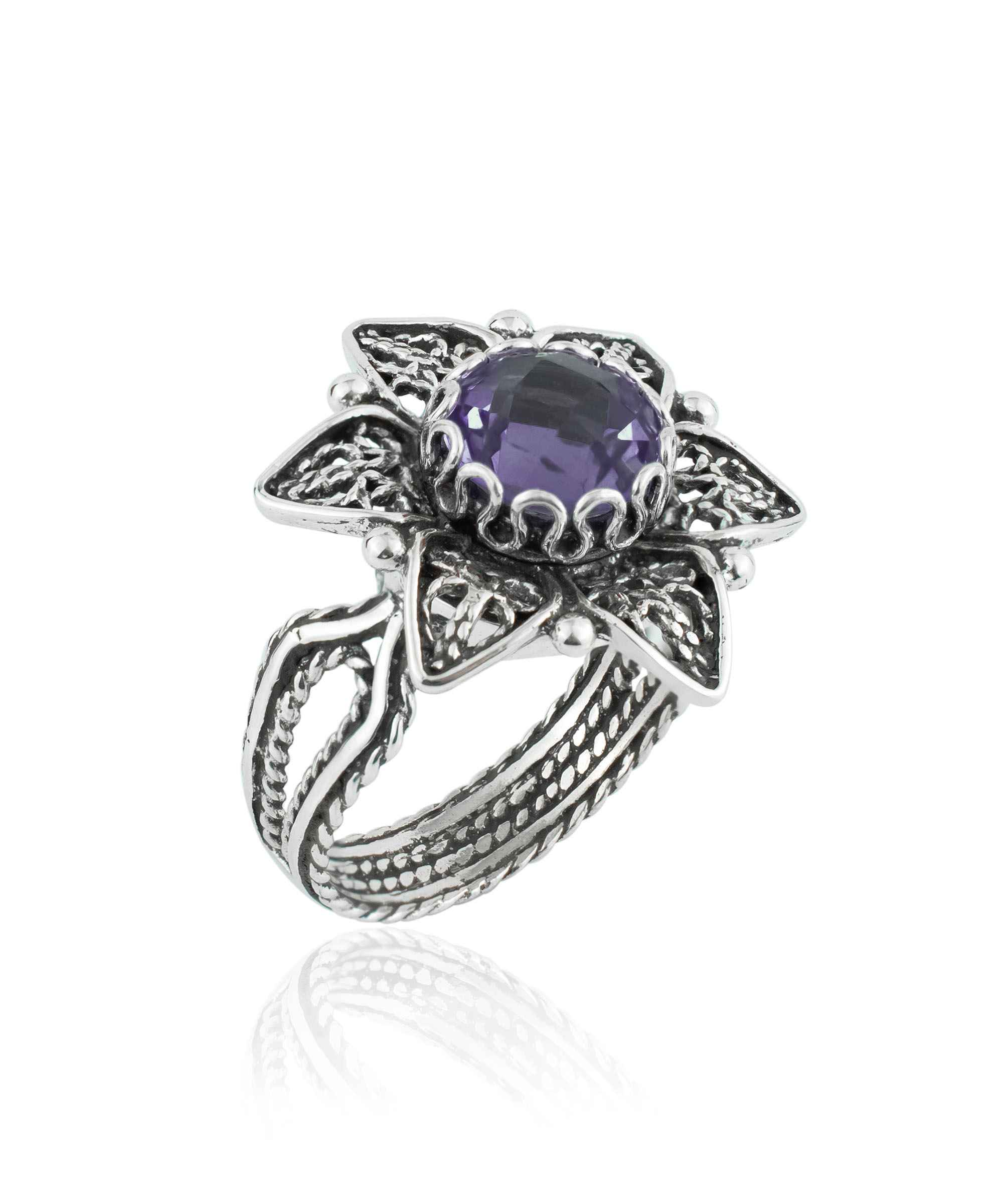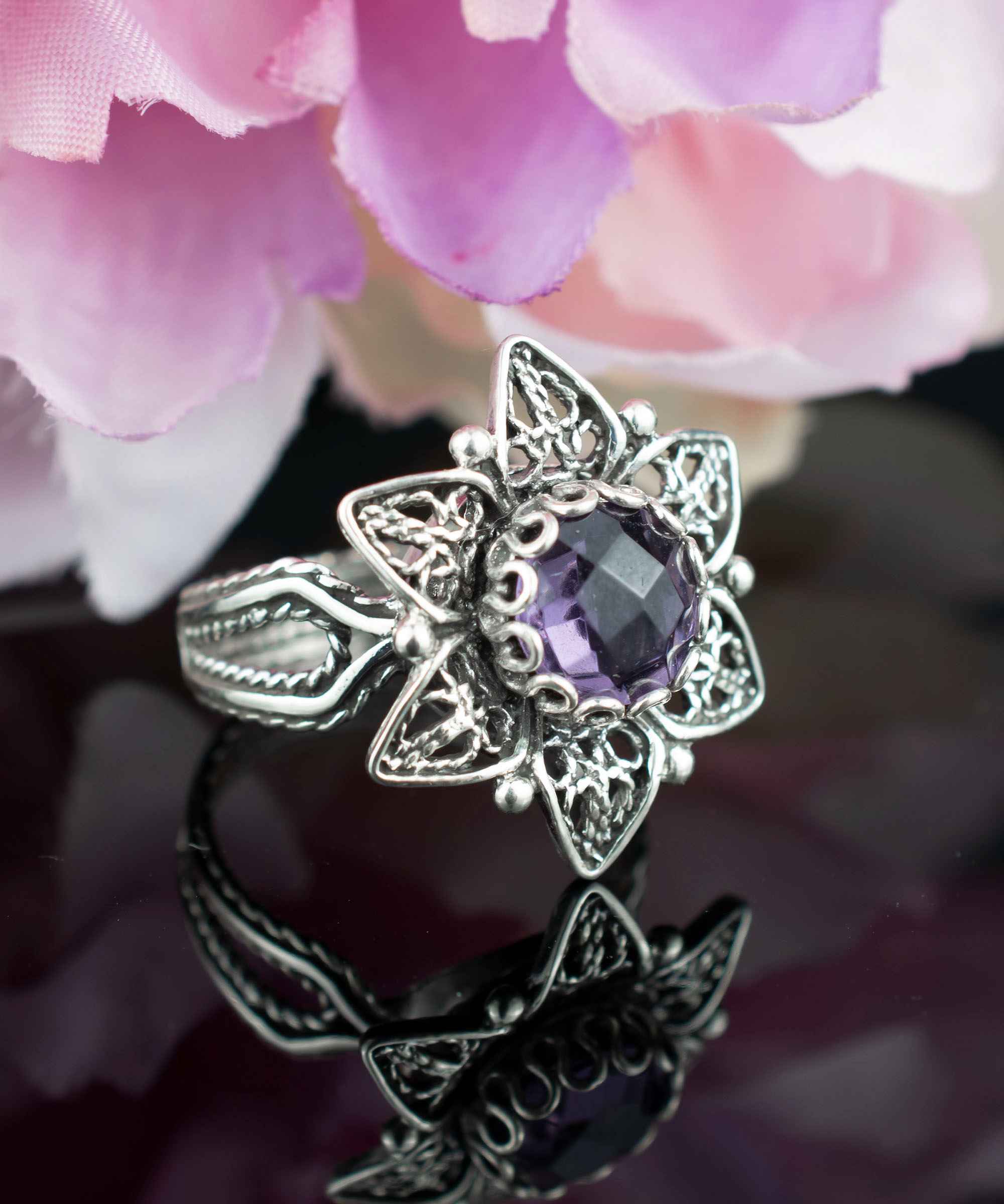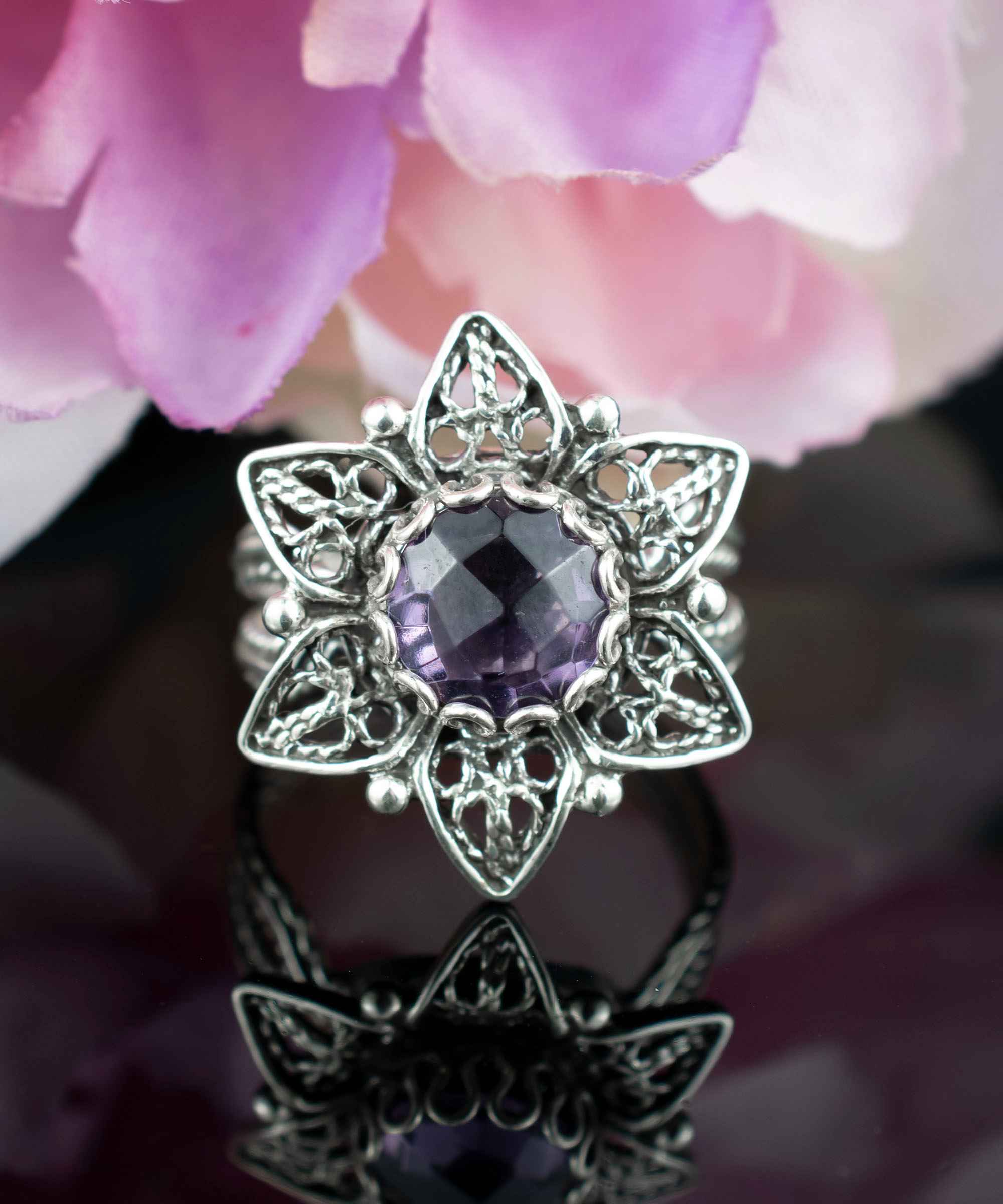 This exquisite Filigree Art Amethyst Gemstone Daisy Flower Women Silver Cocktail Ring is a stunning addition to any jewelry collection. Crafted from high-quality 925 sterling silver, this ring showcases a beautiful daisy flower design that is both modern and timeless. The centerpiece of this cocktail ring is an 8 mm round-cut Amethyst gemstone, which has been expertly faceted to enhance its natural beauty and brilliance.