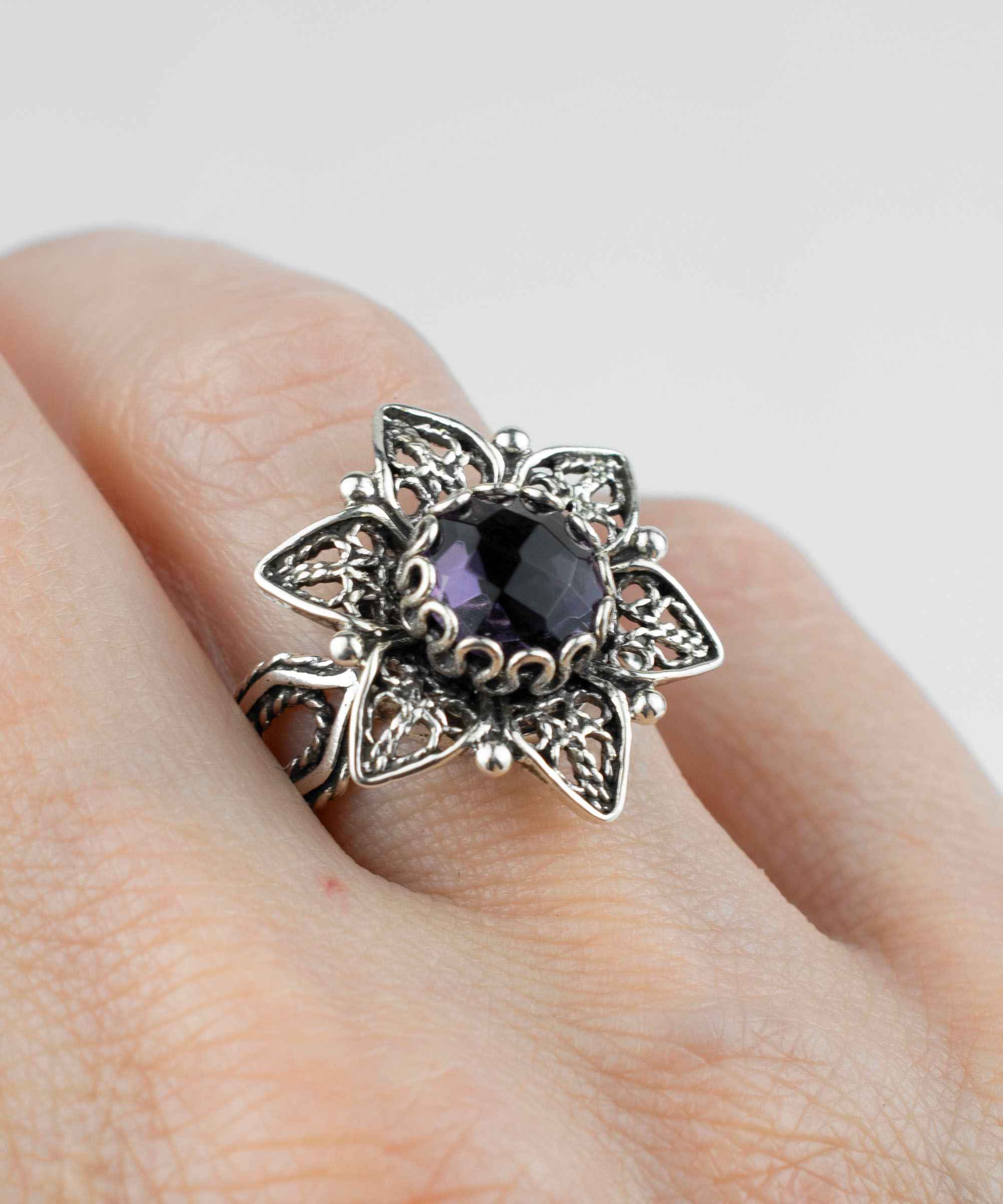 In summary, the Filigree Art Amethyst Gemstone Daisy Flower Women Silver Cocktail Ring is a stunning piece that combines elegance, versatility, and meaningful symbolism. Its high-quality materials, thoughtful design, and beautiful packaging make it an exceptional choice for anyone looking to add a touch of sophistication to their jewelry collection or to give a memorable gift.