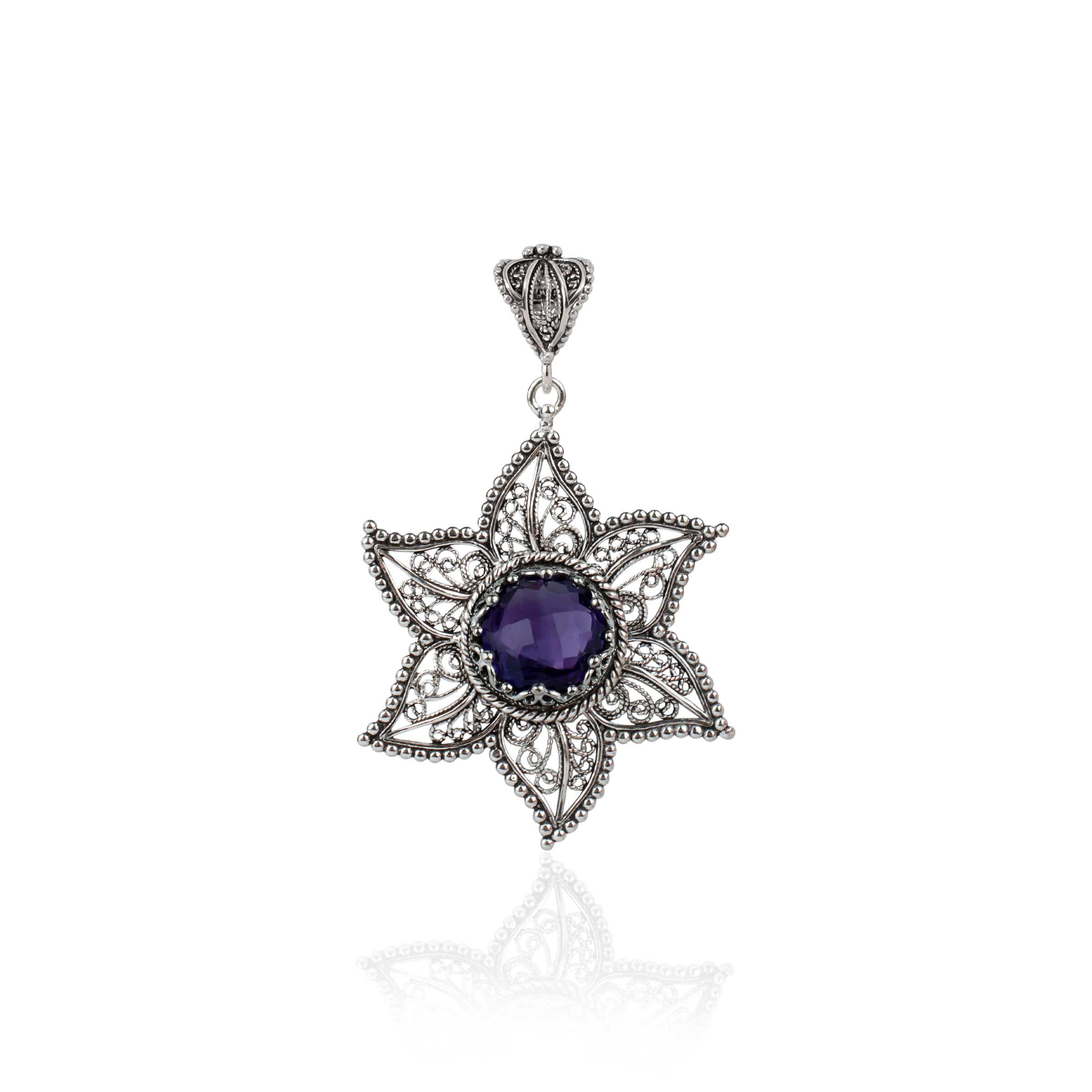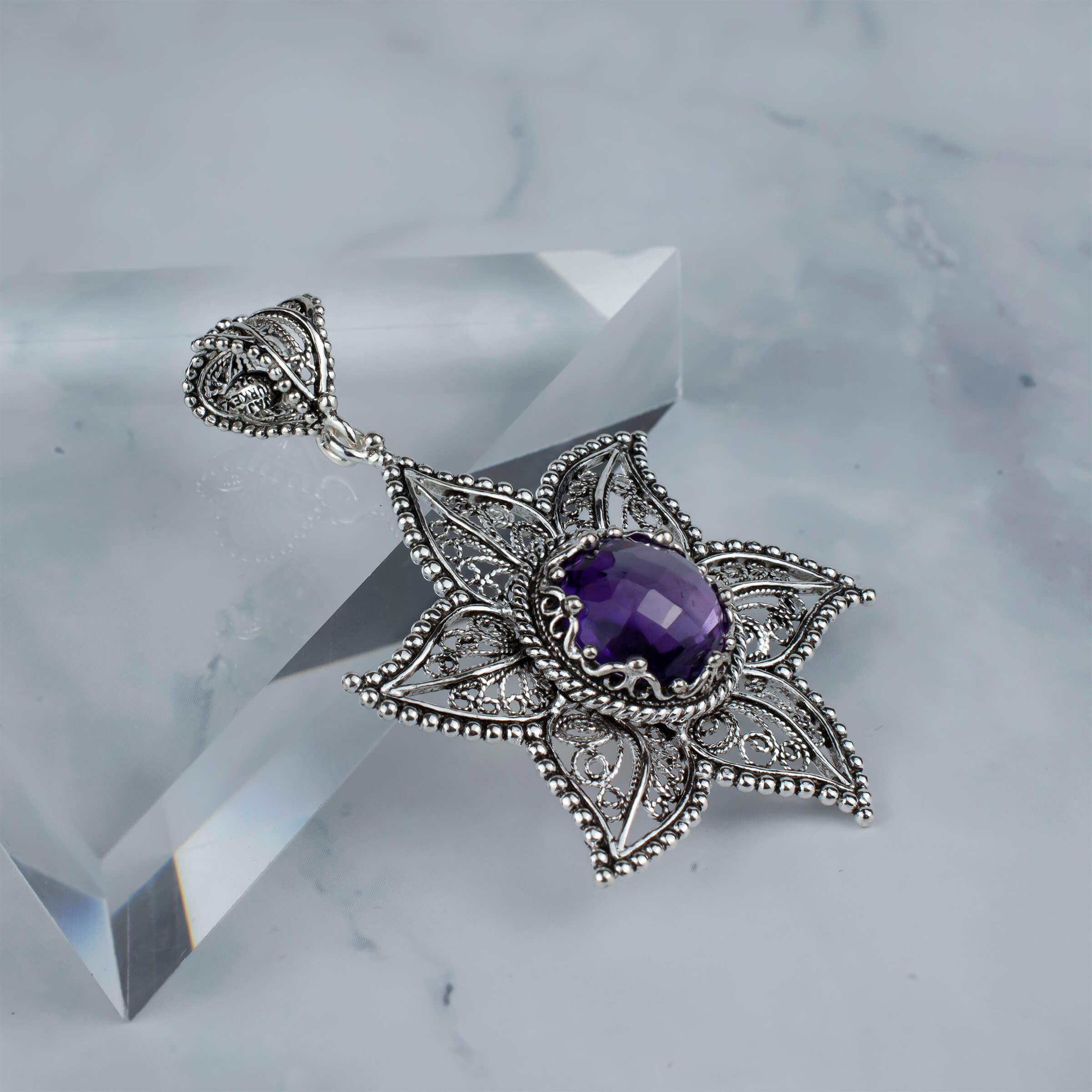 This Filigree Art Amethyst Gemstone Star Design Pendant makes for an ideal gift for birthdays, anniversaries, or special occasions. Its timeless design and meaningful symbolism make it a thoughtful present for loved ones. Whether you are treating yourself or surprising someone special, this pendant is sure to be cherished for years to come.