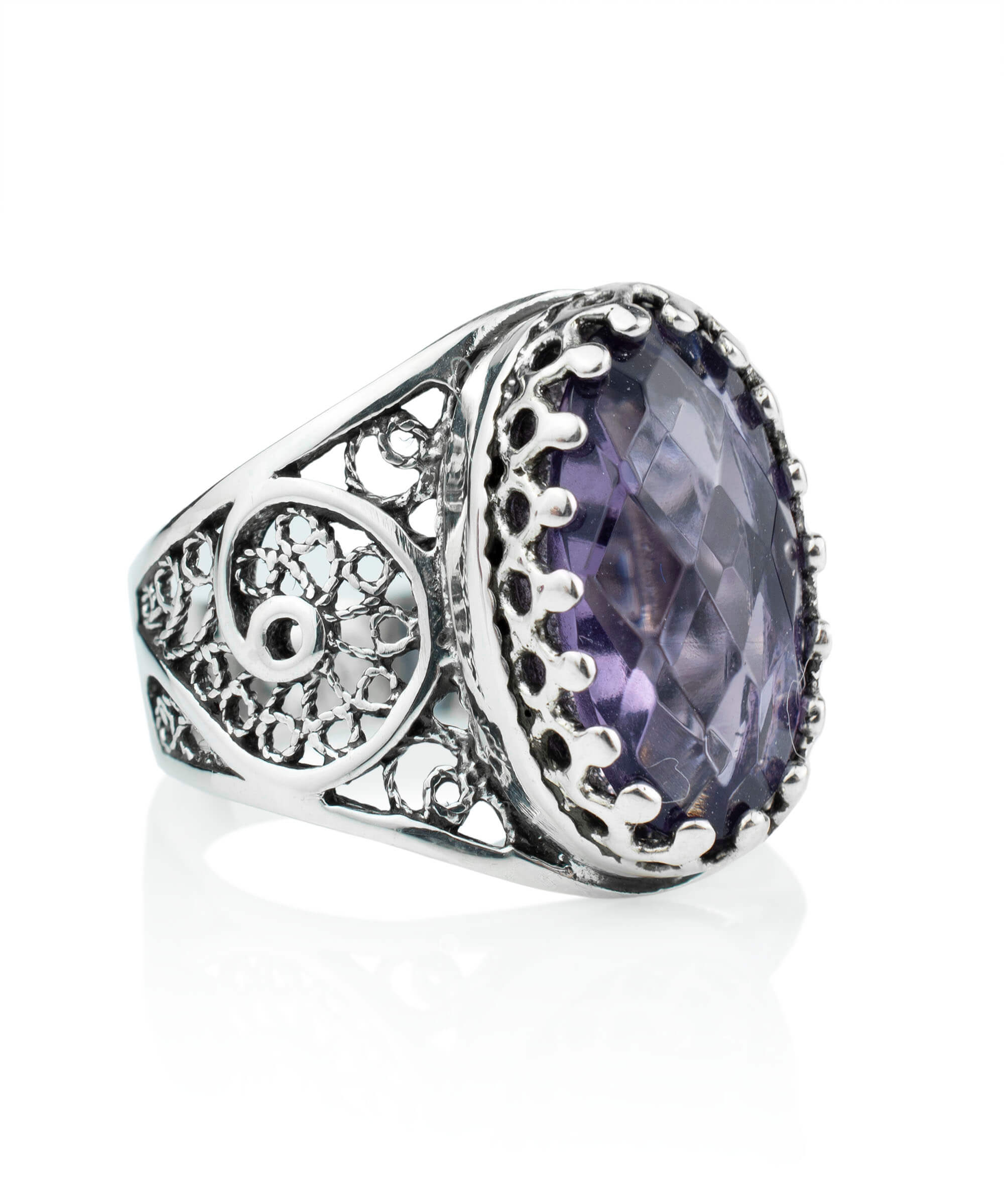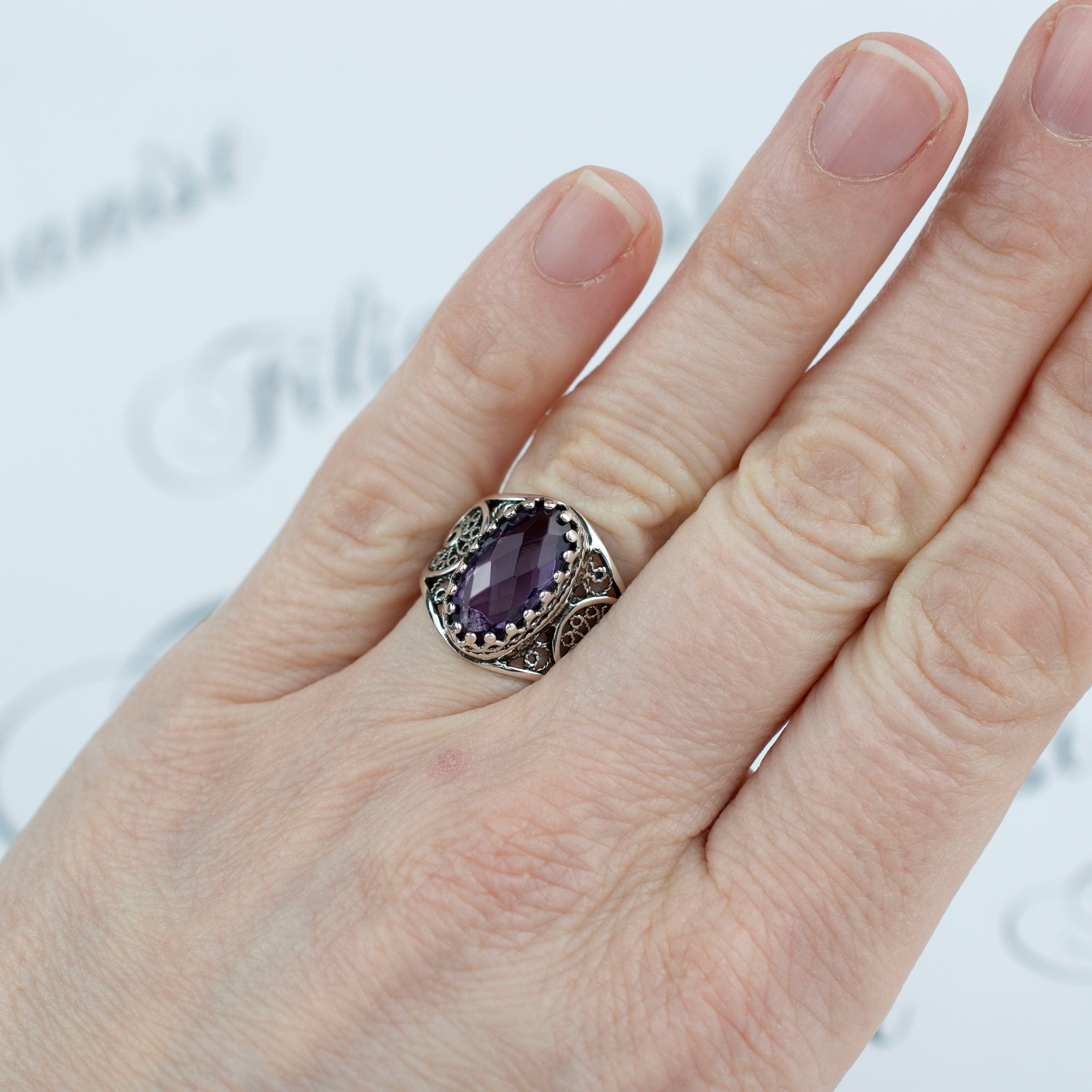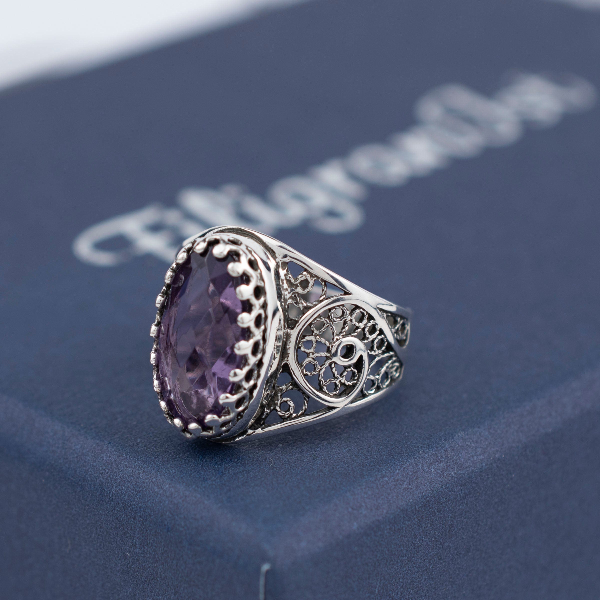 Sterling silver filigree art cocktail ring featuring a natural amethyst gemstone in an oval cut, showcasing intricate metalwork.