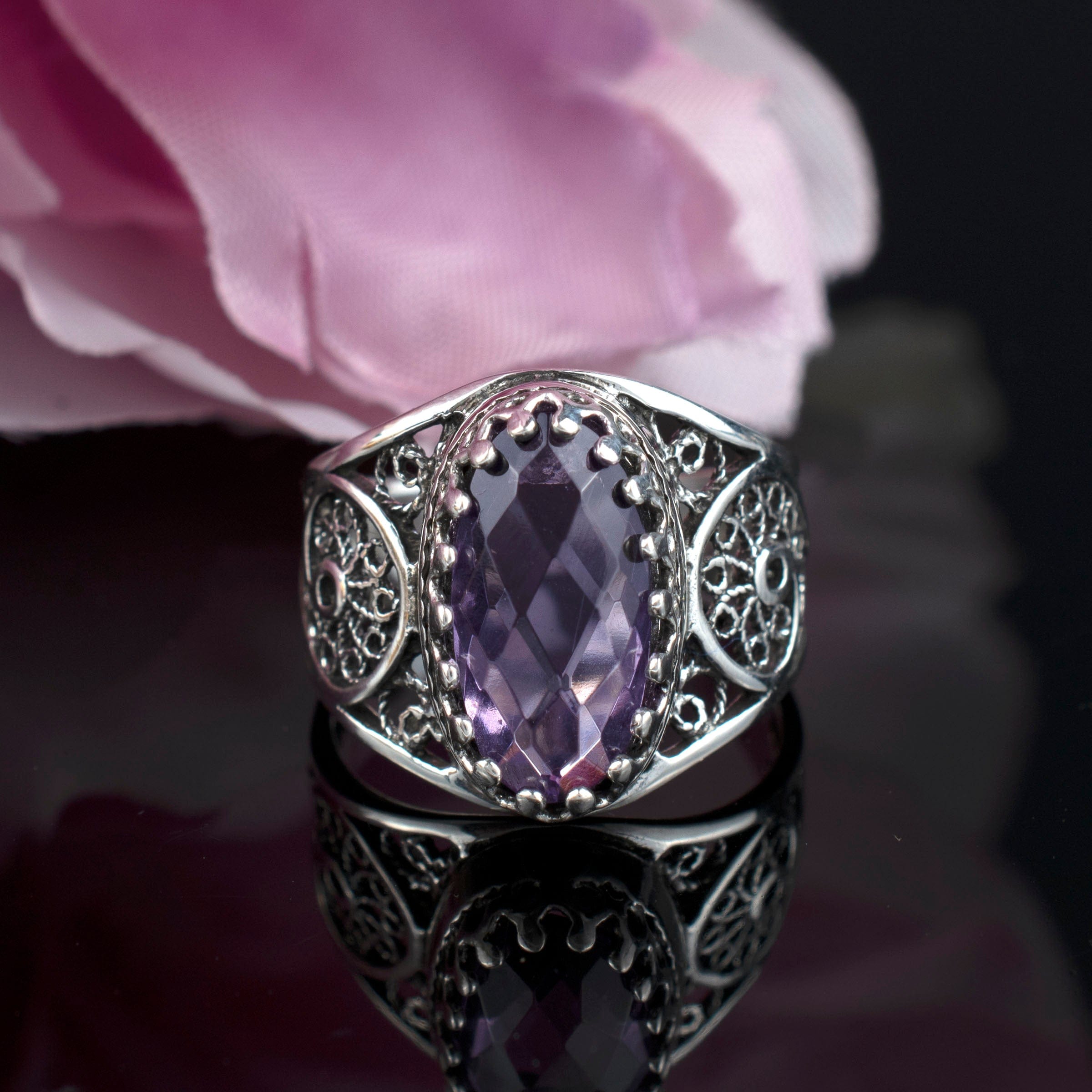 Introducing the exquisite Filigree Art Amethyst Gemstone Women Oval Silver Cocktail Ring, a stunning piece that combines elegance and artistry. Crafted from high-quality sterling silver, this ring features a beautiful natural amethyst gemstone that is sure to catch the eye. The oval cut of the amethyst measures 7X14 mm, showcasing its vibrant purple hues and intricate facets that reflect light beautifully.