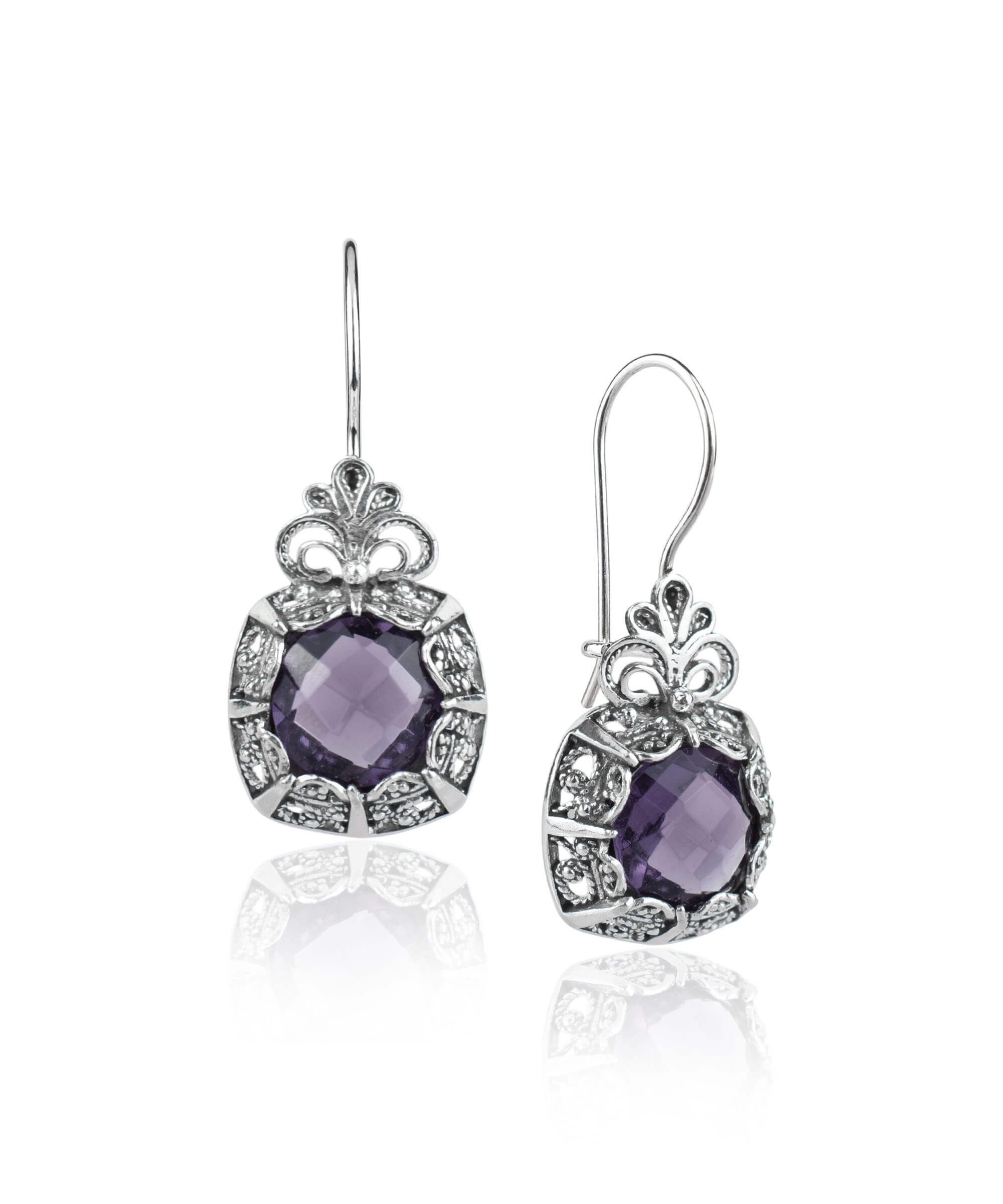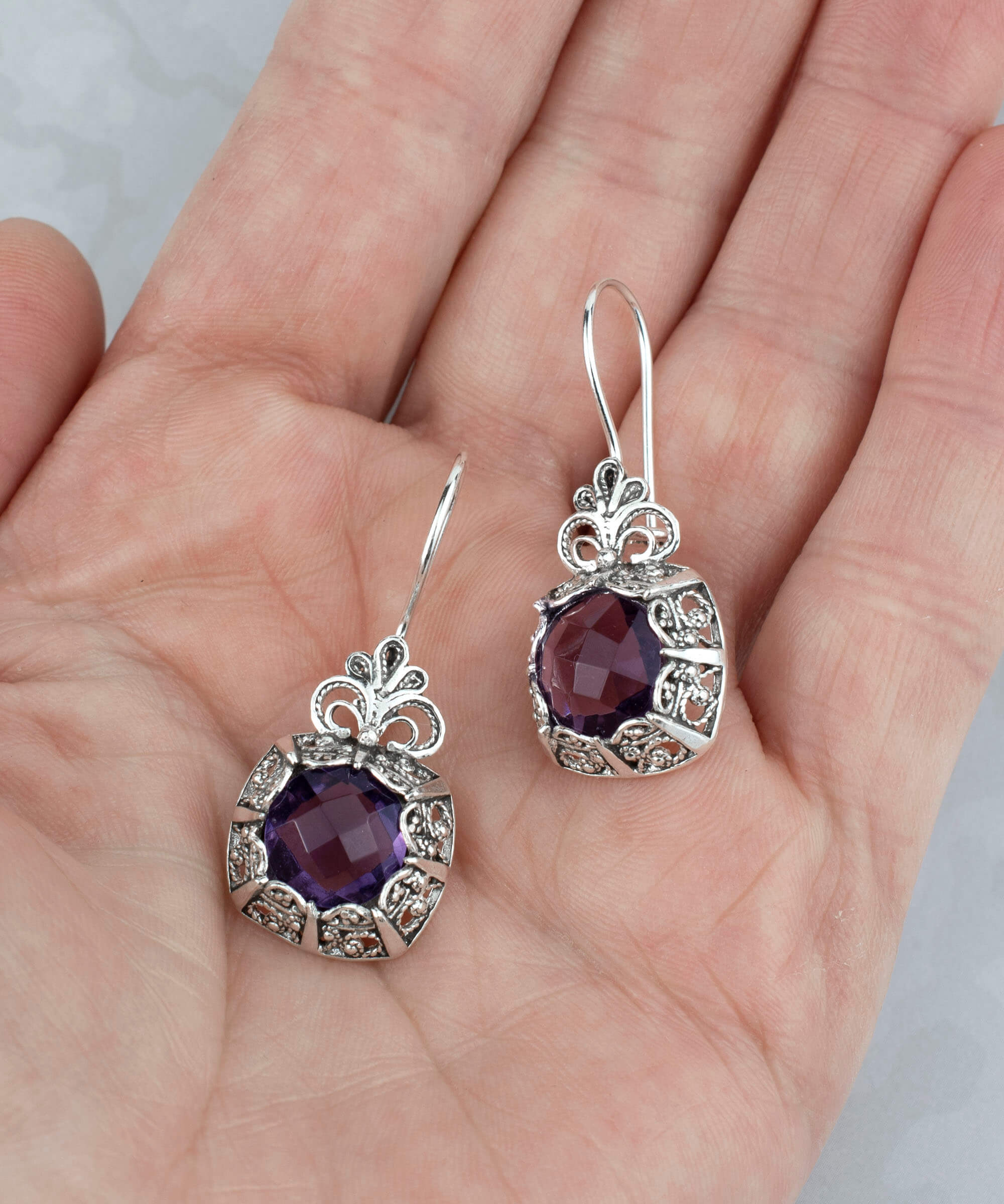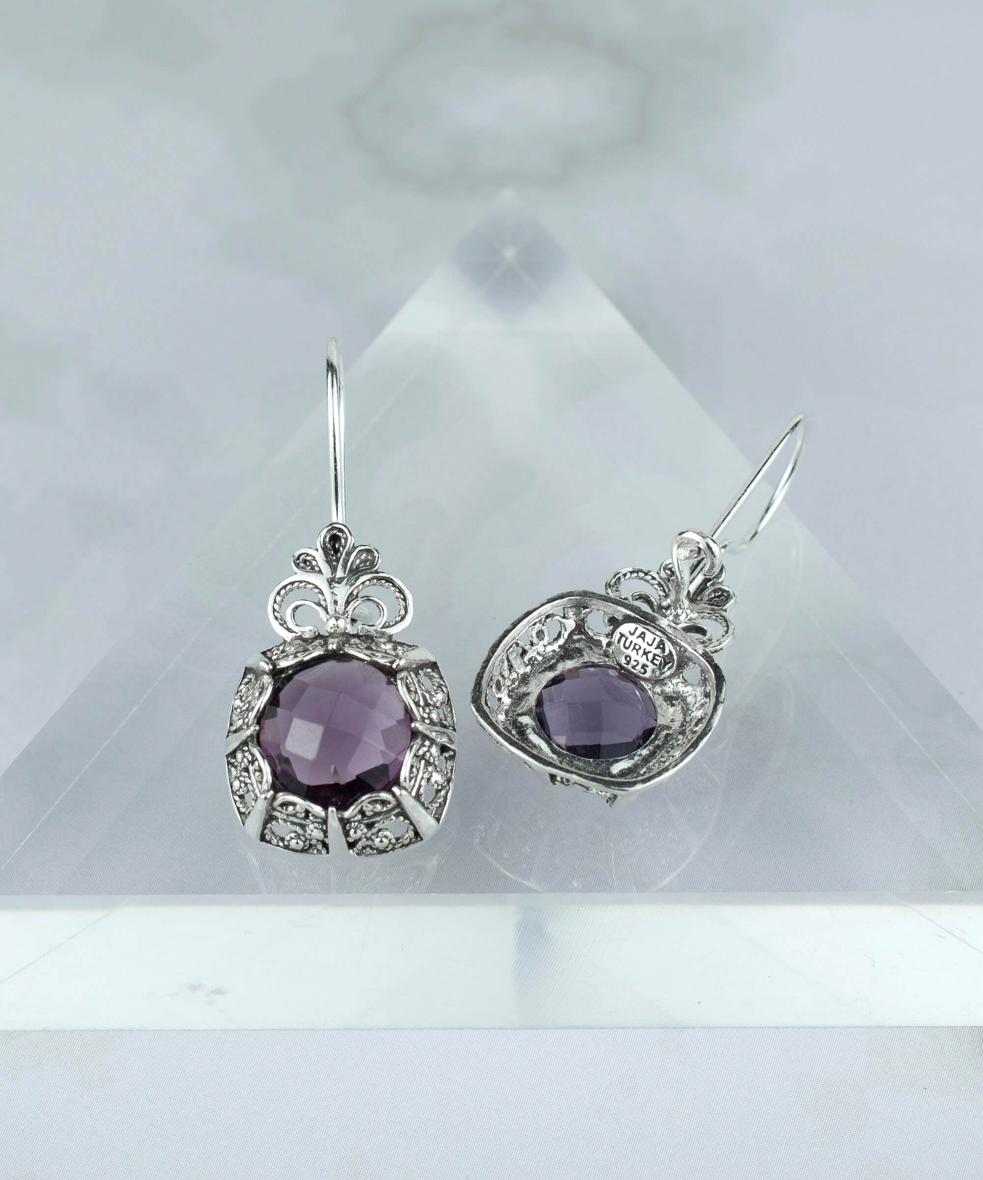 Introducing the exquisite Filigree Art Amethyst Gemstone Women Silver Drop Earrings, a stunning piece of handmade jewelry that combines elegance with artistry. Crafted from high-quality 925 sterling silver, these earrings are designed to make a statement while providing a touch of sophistication to any outfit. The intricate flower pattern, enhanced by delicate filigree work, showcases the skill and craftsmanship that goes into each pair.