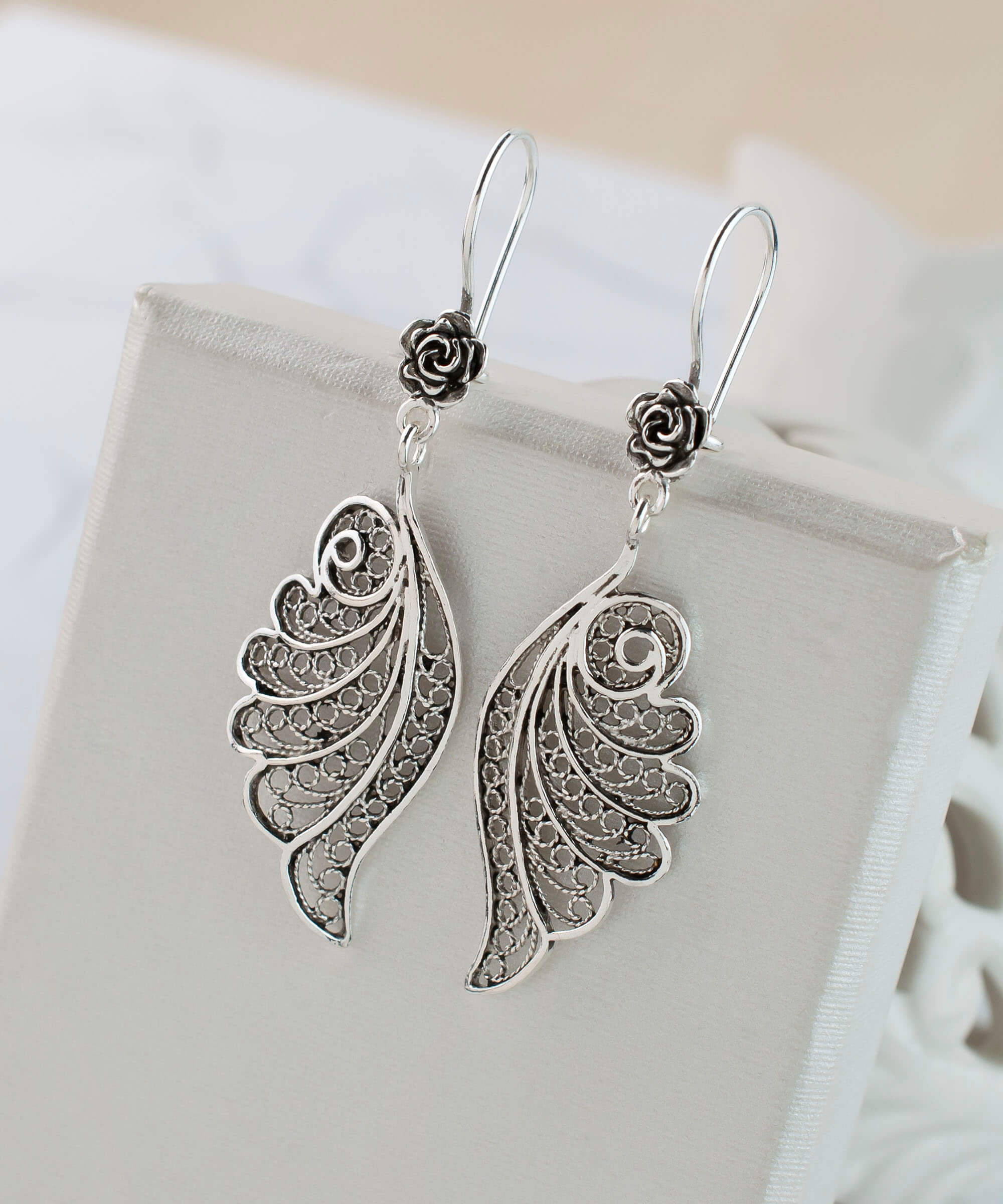 The angel wings design is not only beautiful but also symbolizes protection and hope. Each pair of earrings is crafted with care, showcasing the skillful artistry involved in creating filigree. This technique involves delicate metal strands that are intricately fashioned to form stunning patterns, resulting in a piece that is both timeless and contemporary.