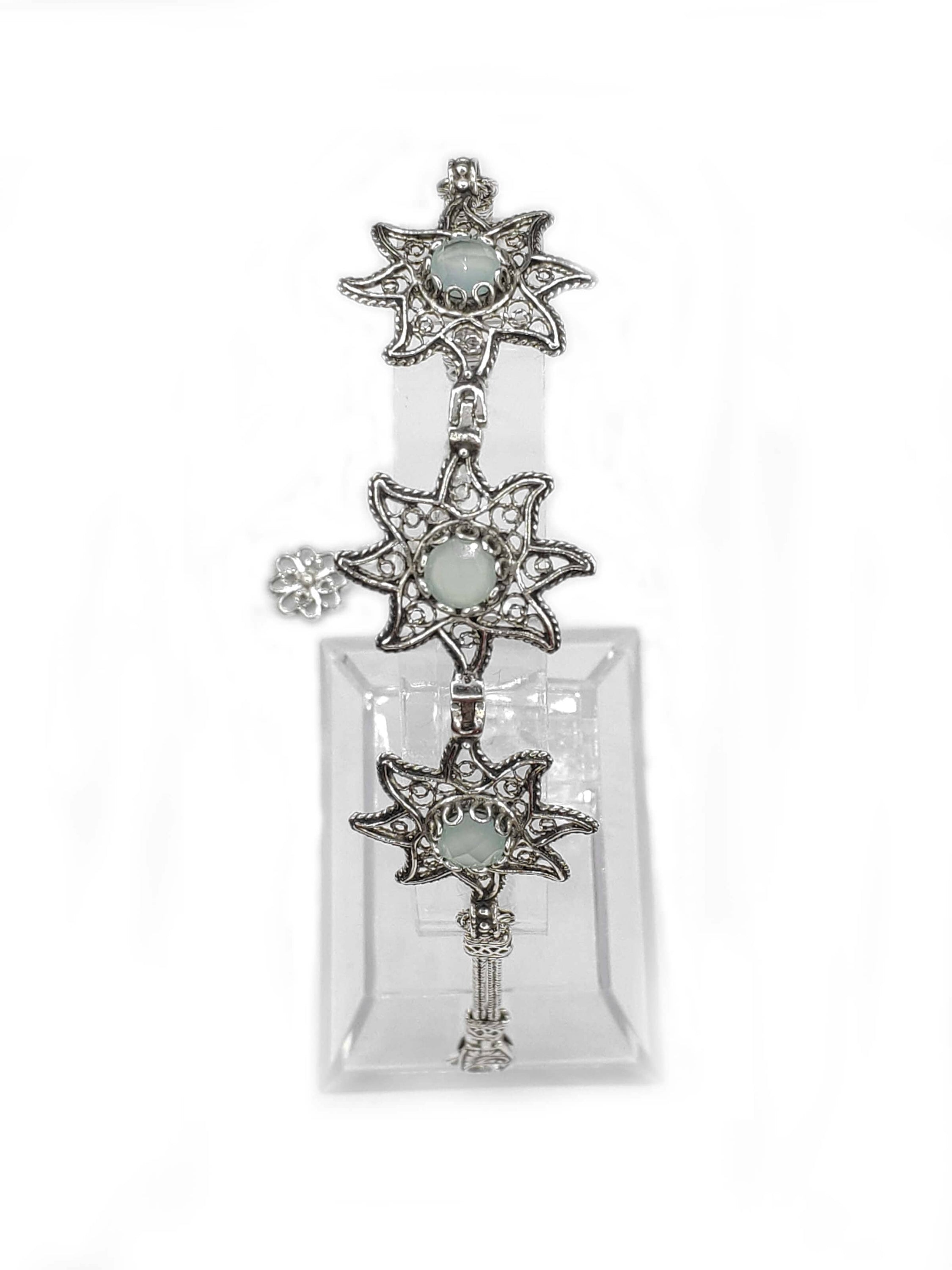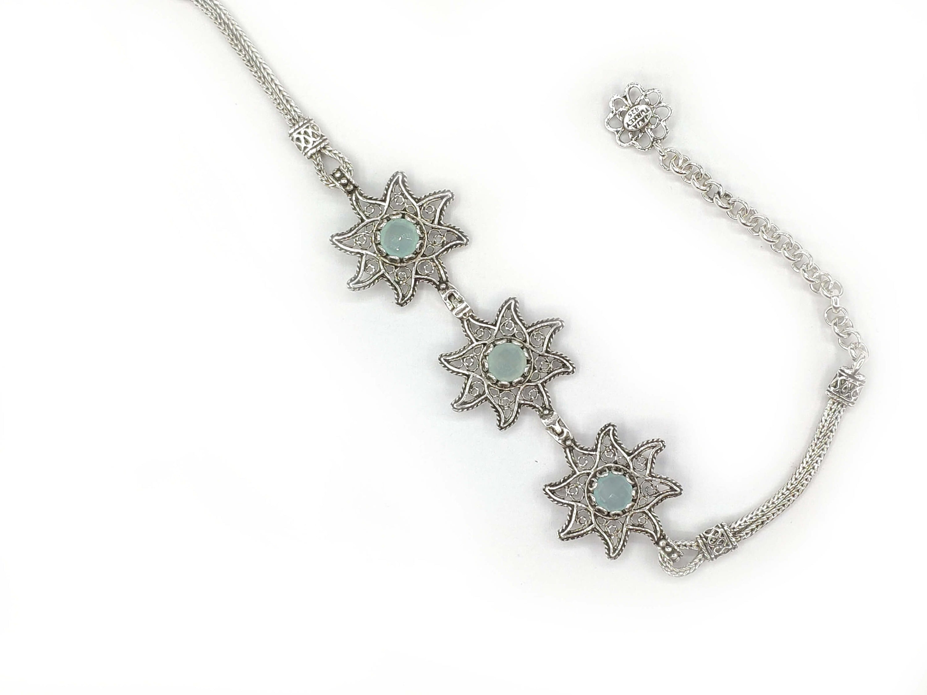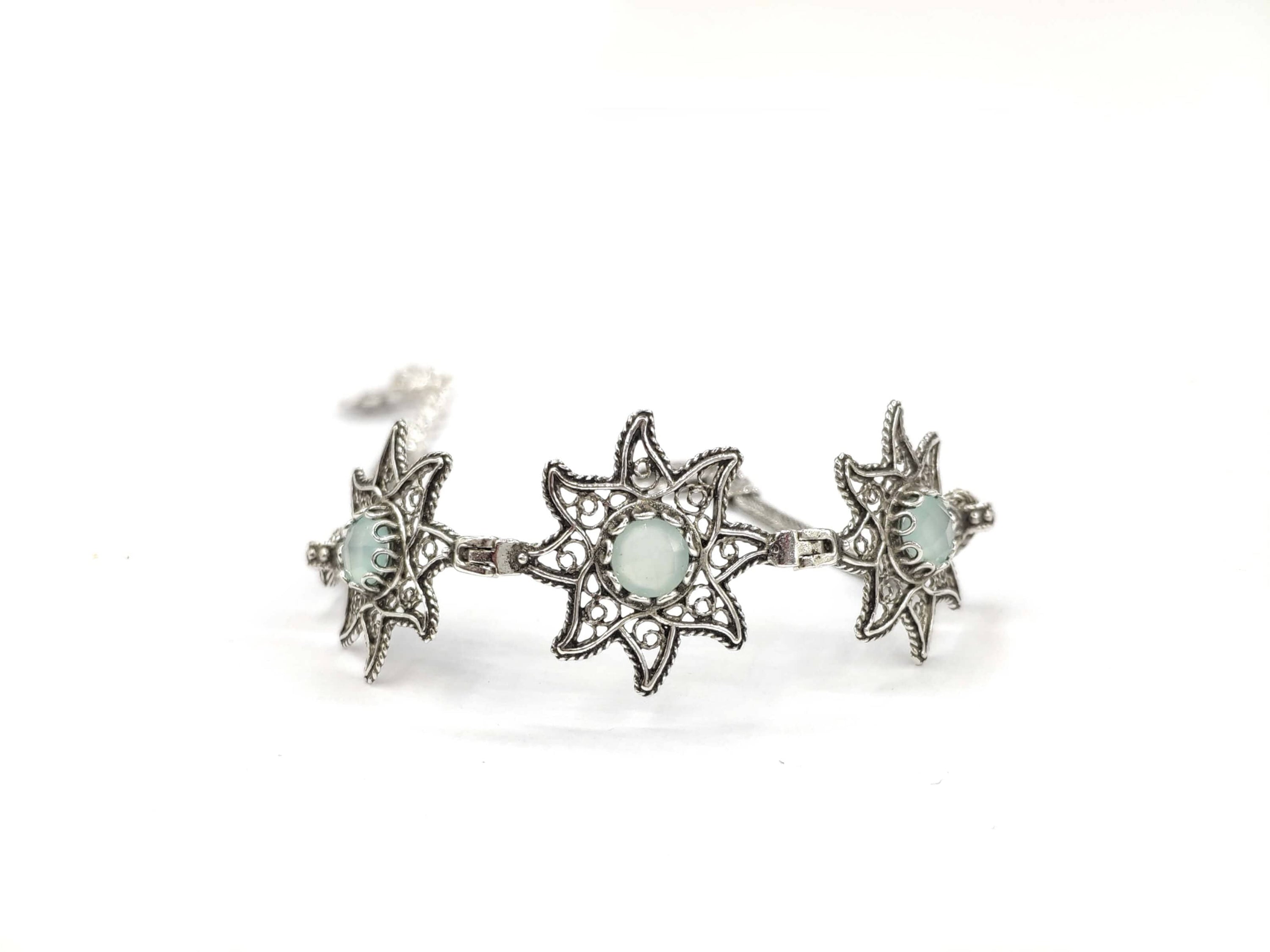 Aqua Chalcedony Gemstone Star Figured Women Silver Link Bracelet featuring intricate filigree design and sparkling gemstones.