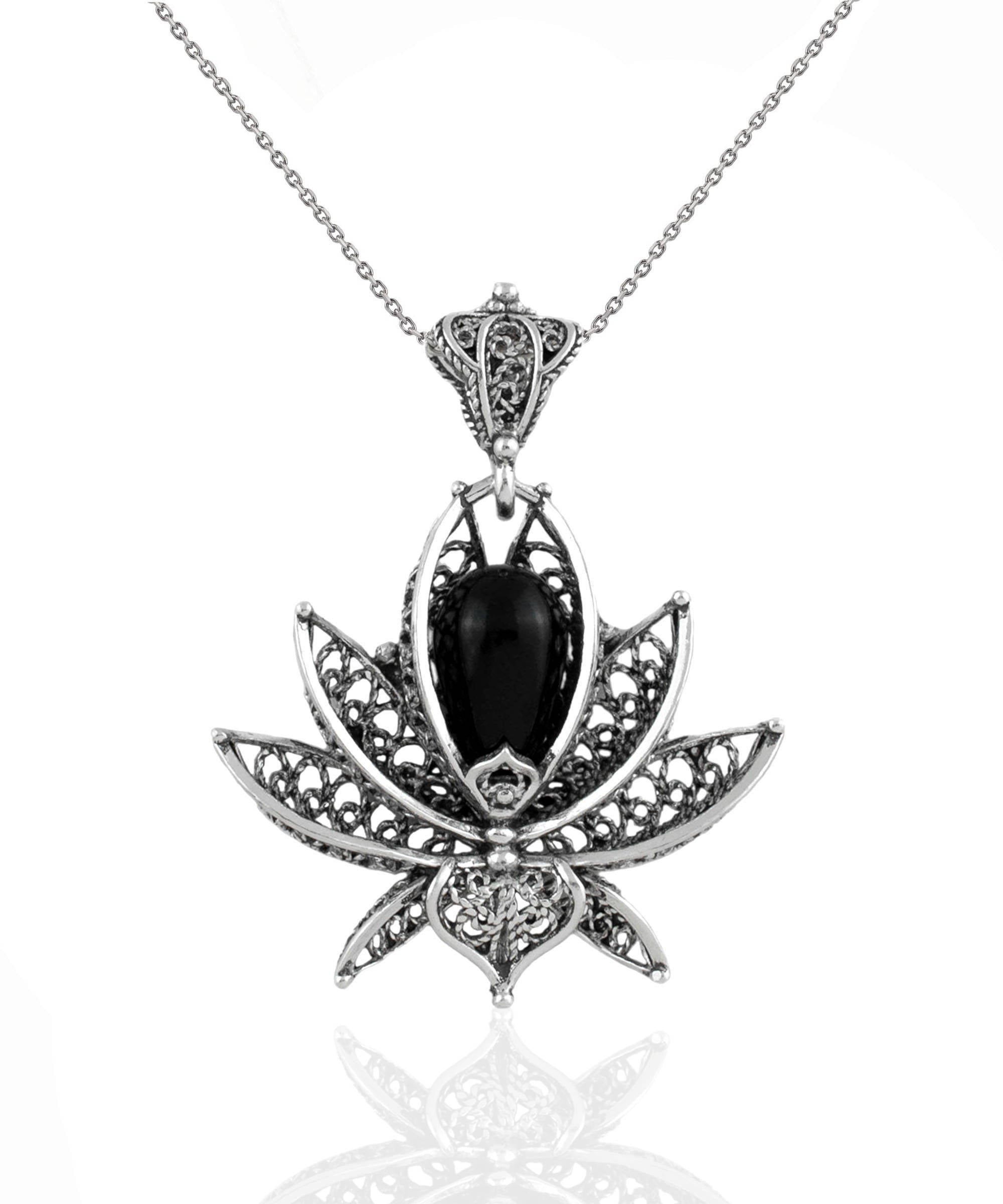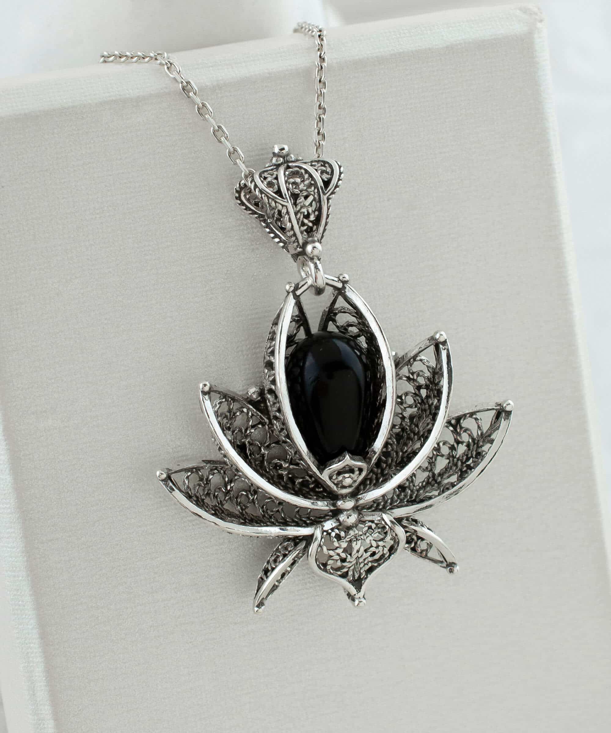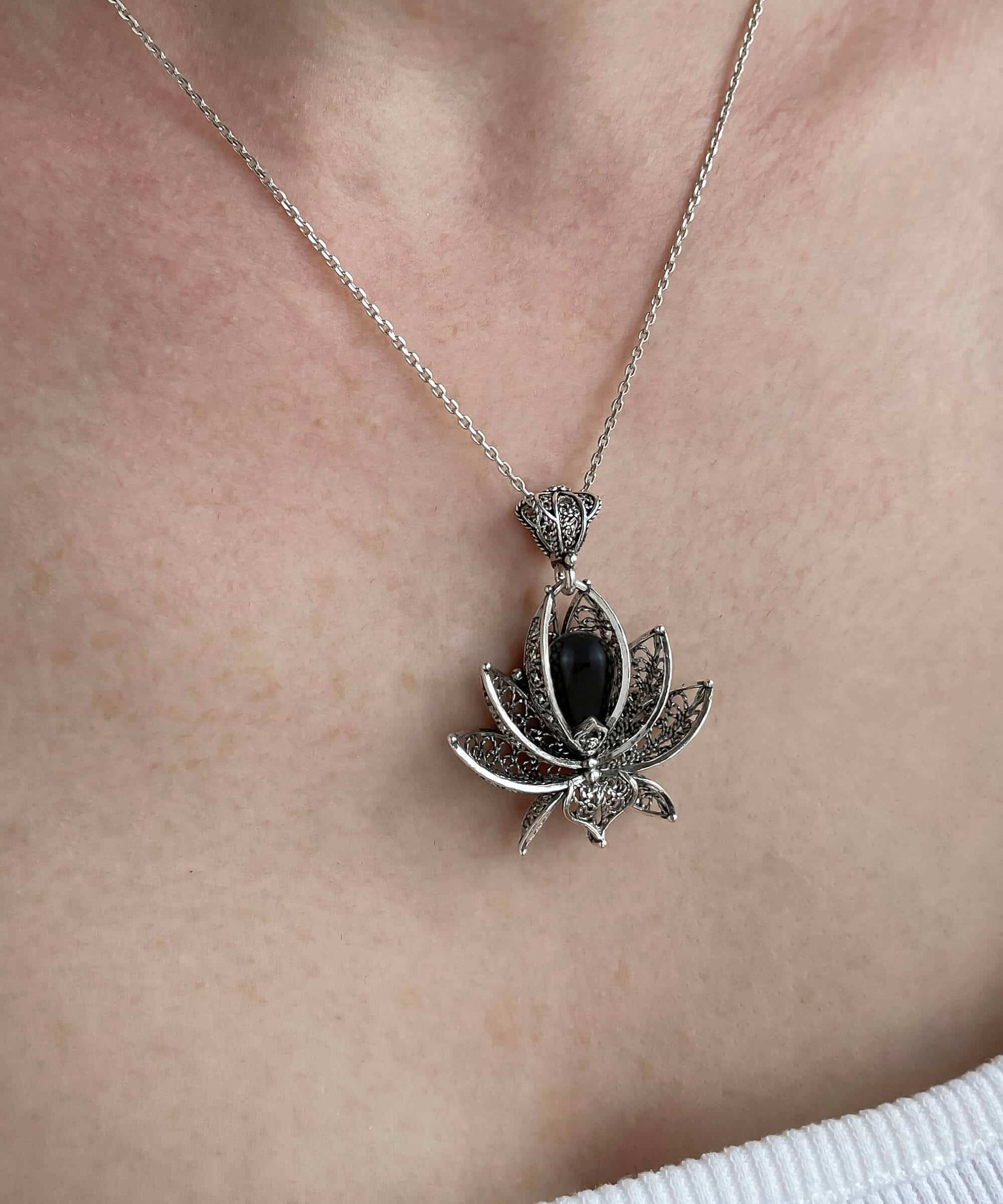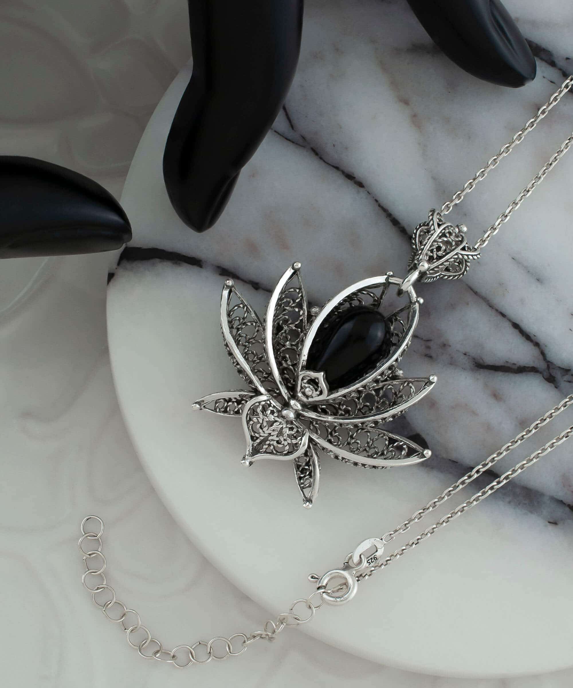 When you choose the Filigree Art Black Onyx Gemstone Lotus Flower Pendant, you're not just purchasing a piece of jewelry; you're investing in a timeless accessory that reflects your unique style. The combination of the black onyx gemstone and the intricate silver filigree work creates a stunning visual contrast that is sure to draw compliments.