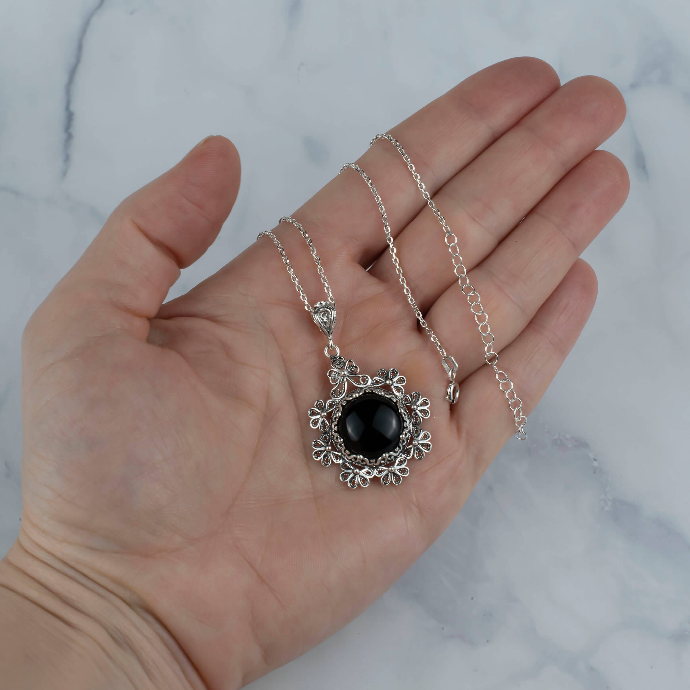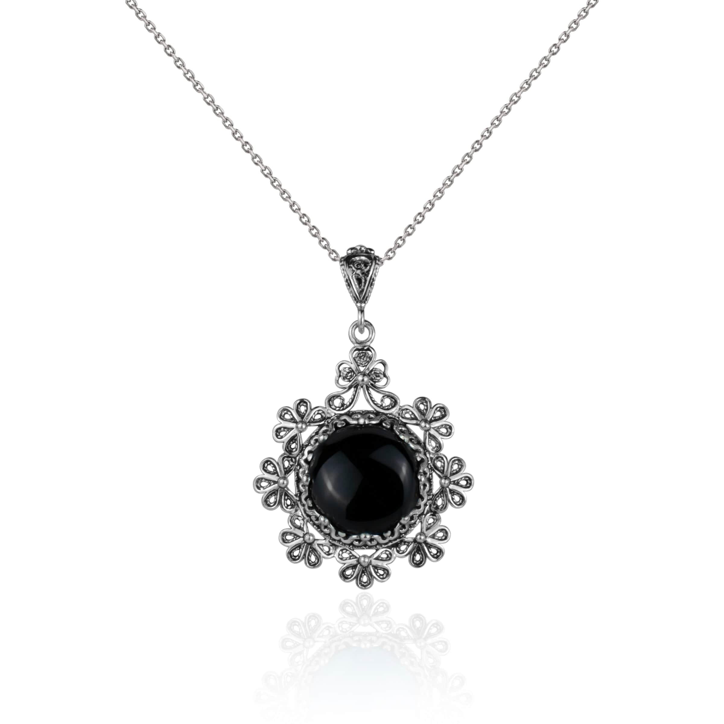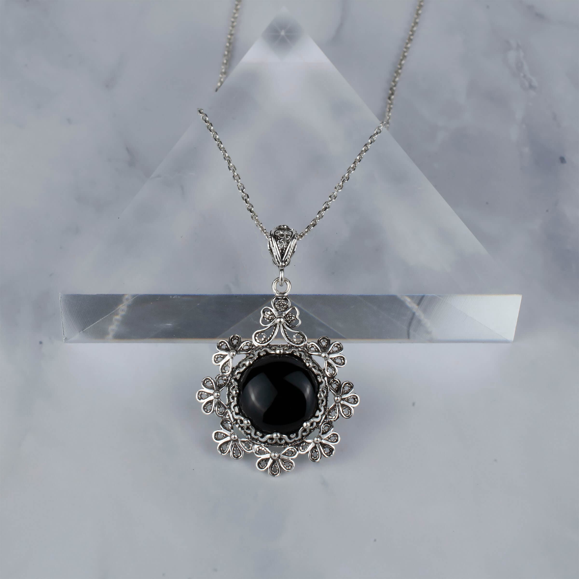 Sterling silver floral pendant featuring a black onyx gemstone, showcasing intricate filigree art design.