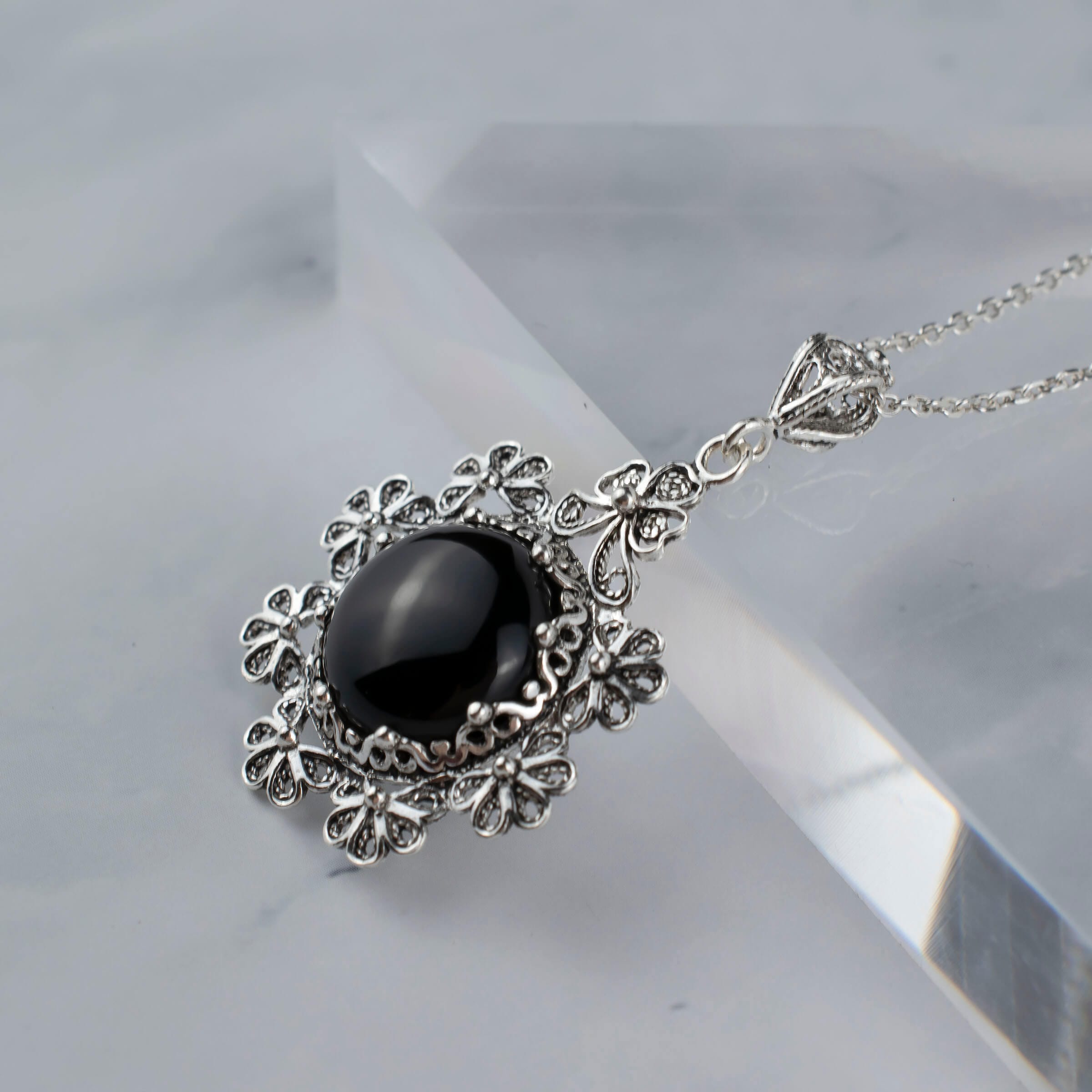 Dropship Filigree Art Black Onyx Gemstone Floral Design Women Silver Pendant