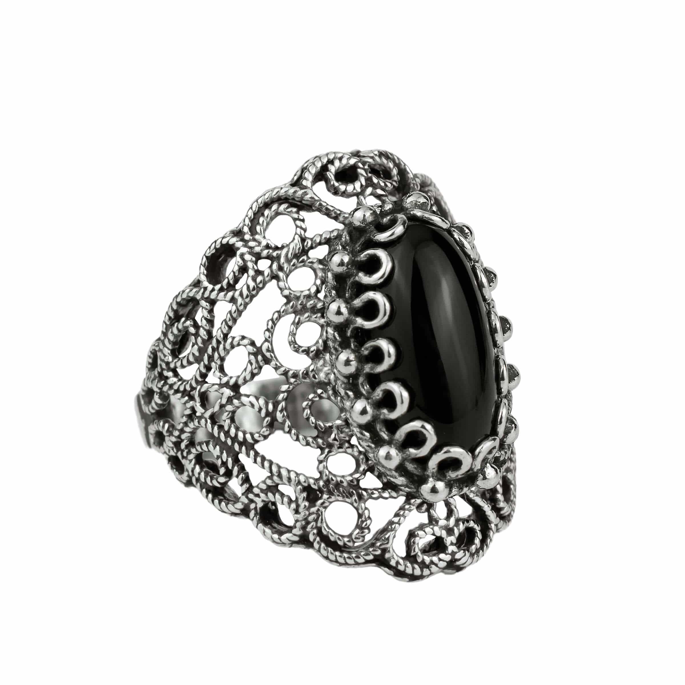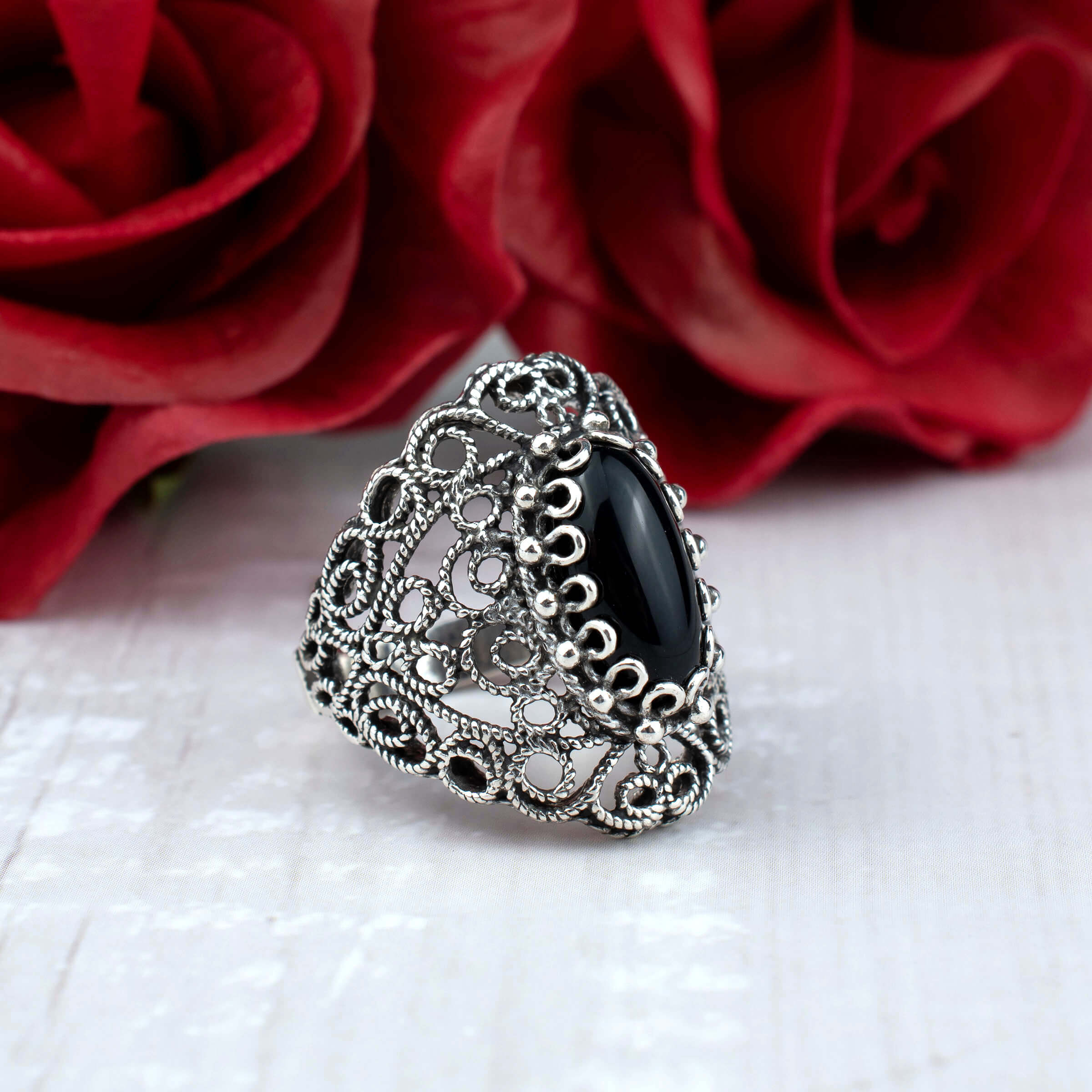 The ring face measures 0.65 inches in length and 0.30 inches in width, making it a noticeable yet comfortable accessory. The black onyx gemstone is an oval cabochon measuring 7X14 mm, perfectly set within the delicate filigree design. This attention to detail ensures that the ring not only looks beautiful but also feels great to wear.