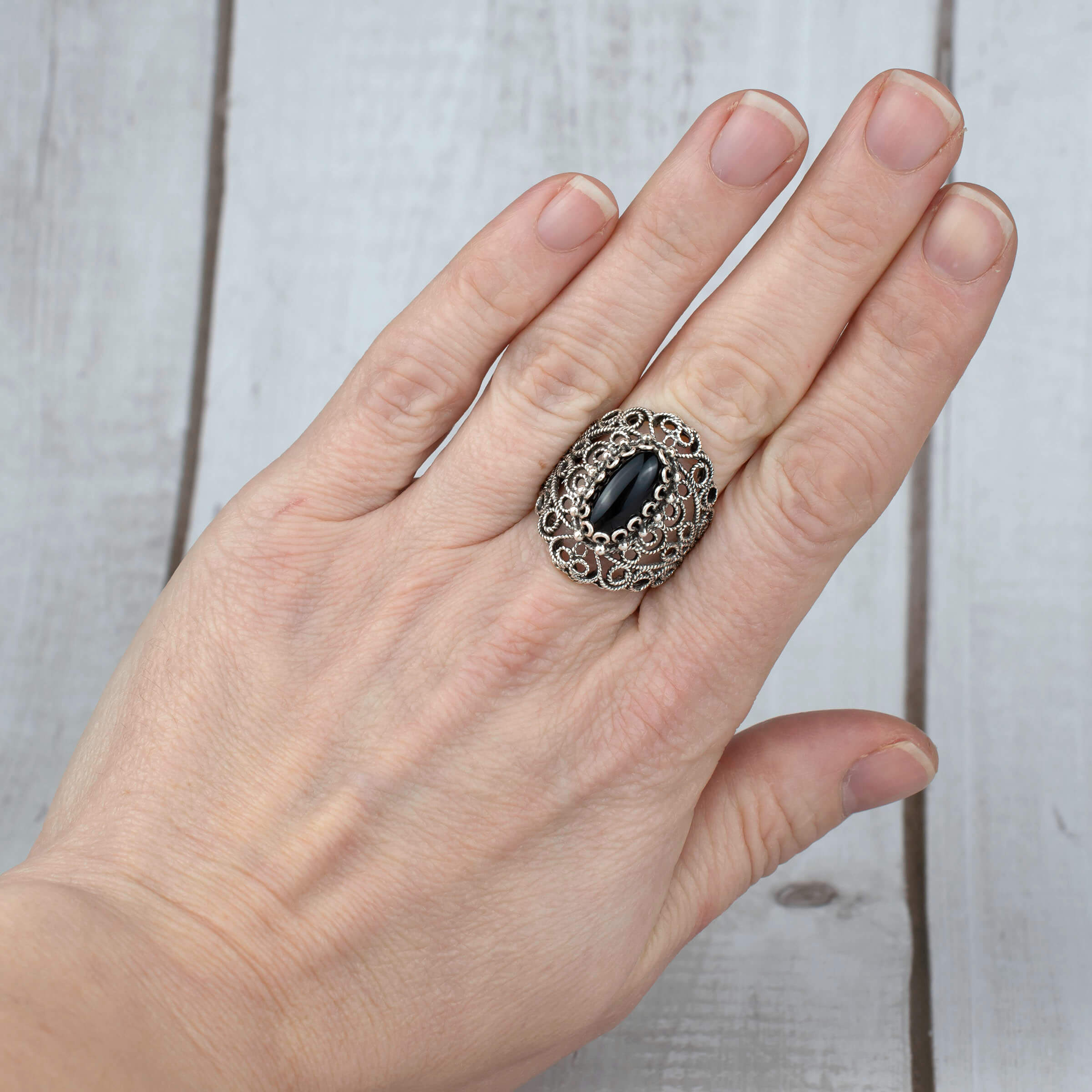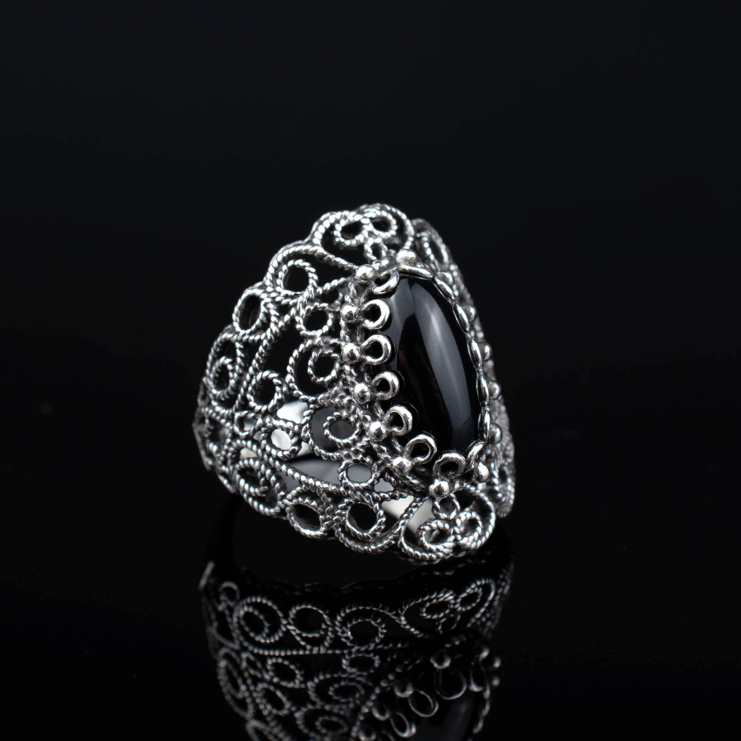 Crafted from durable sterling silver, this statement ring not only exudes luxury but also promises longevity. The sterling silver band is oxidized and highly polished, giving it a beautiful finish that enhances the intricate details of the filigree work. The combination of the black onyx and the silver creates a stunning contrast that is sure to catch the eye and make a lasting impression.