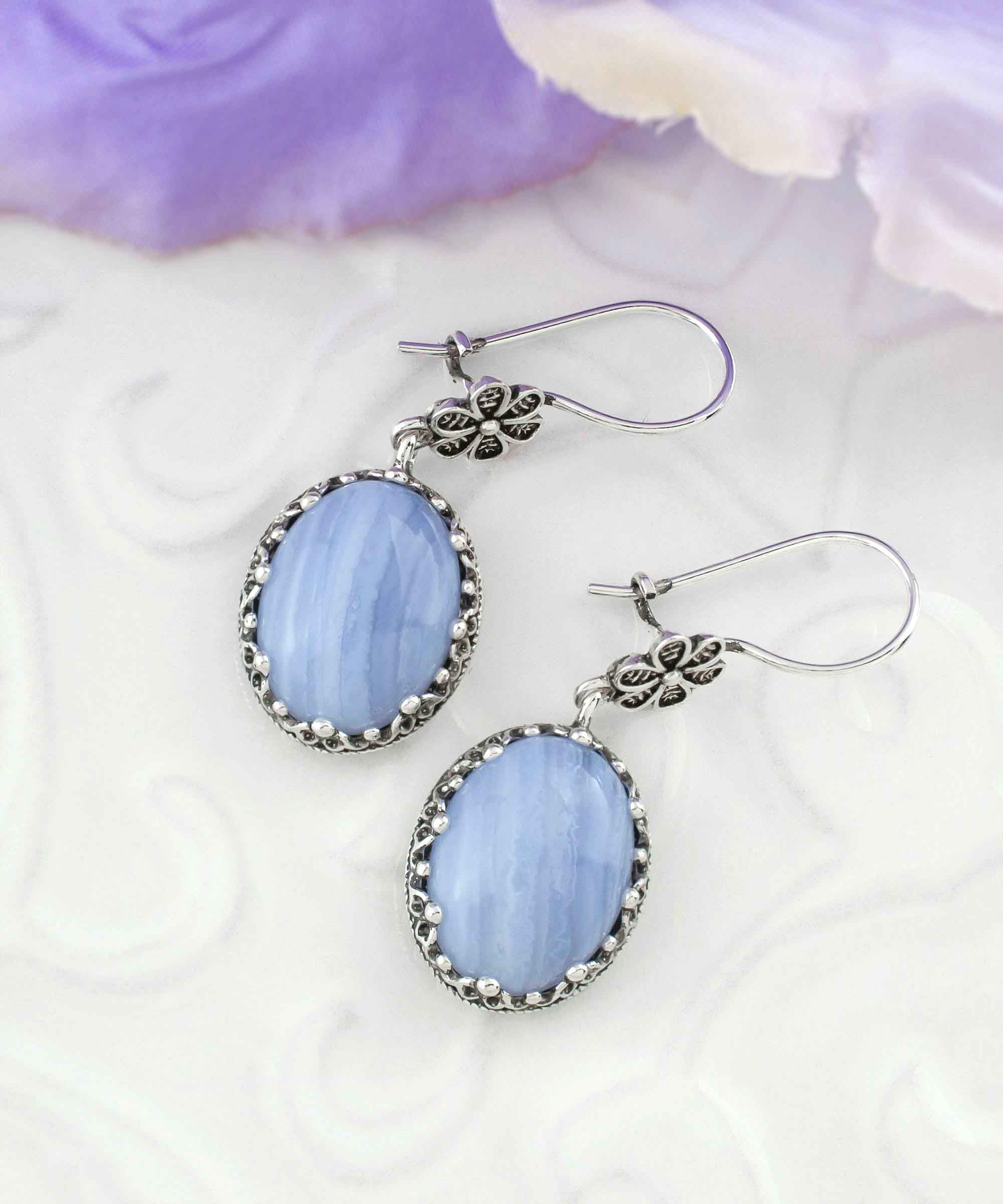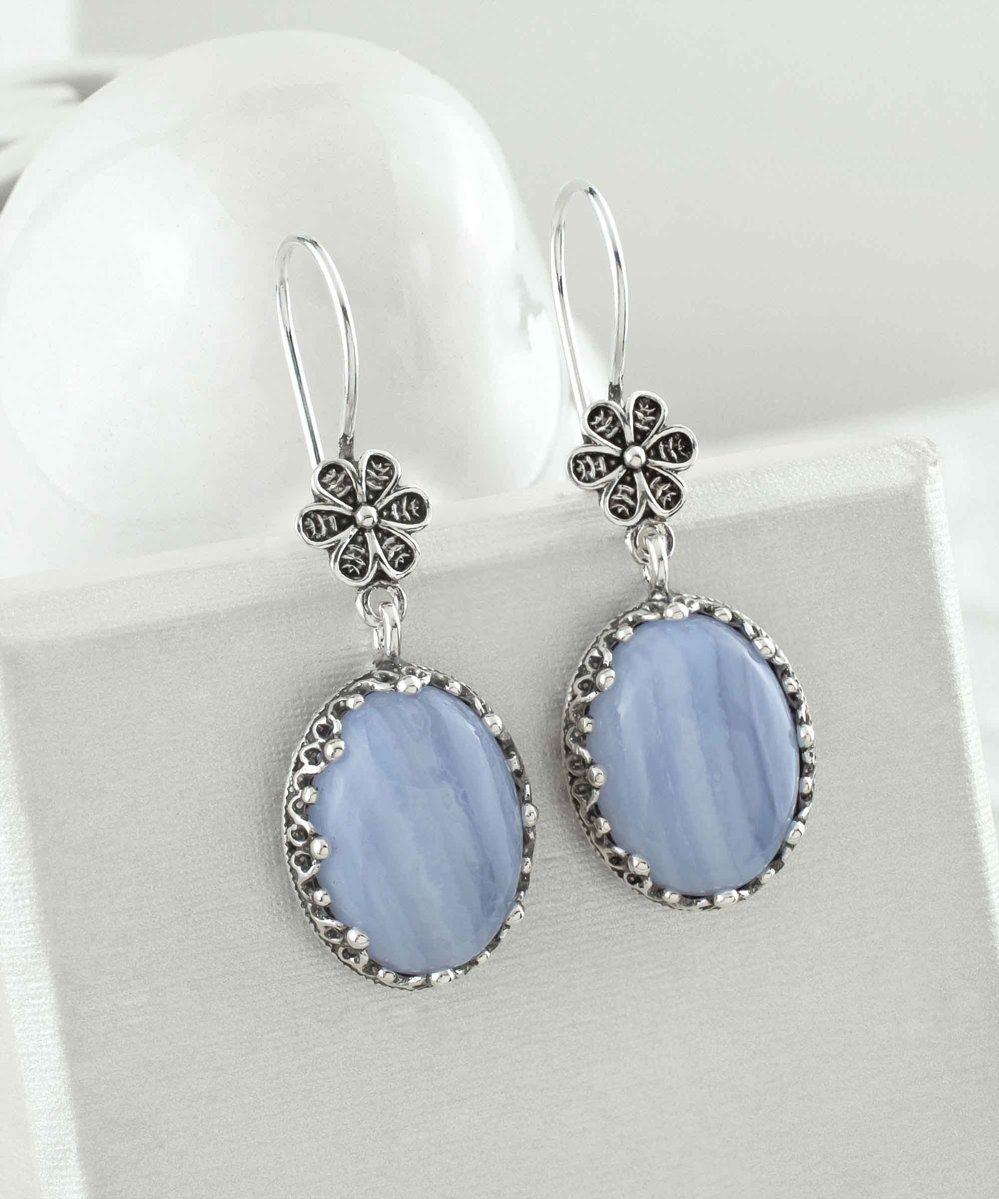 Introducing our exquisite Filigree Art Blue Lace Agate Gemstone Women Silver Oval Dangle earrings, a stunning addition to any jewelry collection. Crafted from high-quality 925 sterling silver, these earrings showcase the perfect blend of elegance and artistry. The unique filigree design adds a touch of sophistication, making them ideal for both casual and formal occasions.