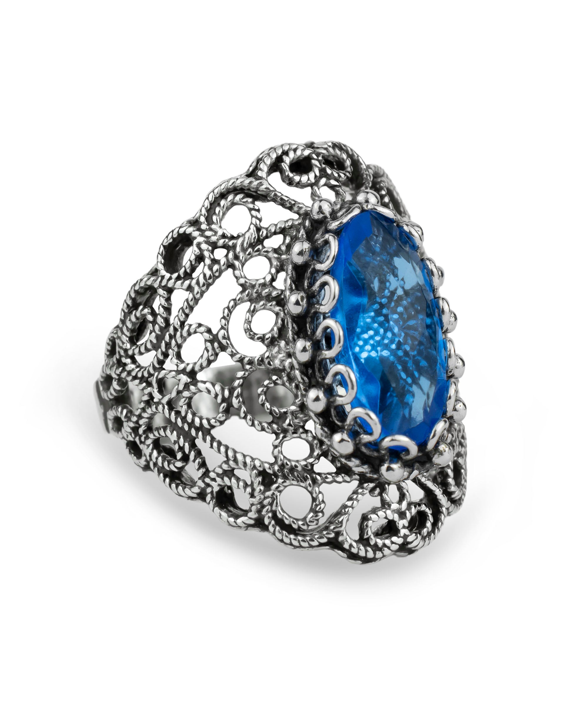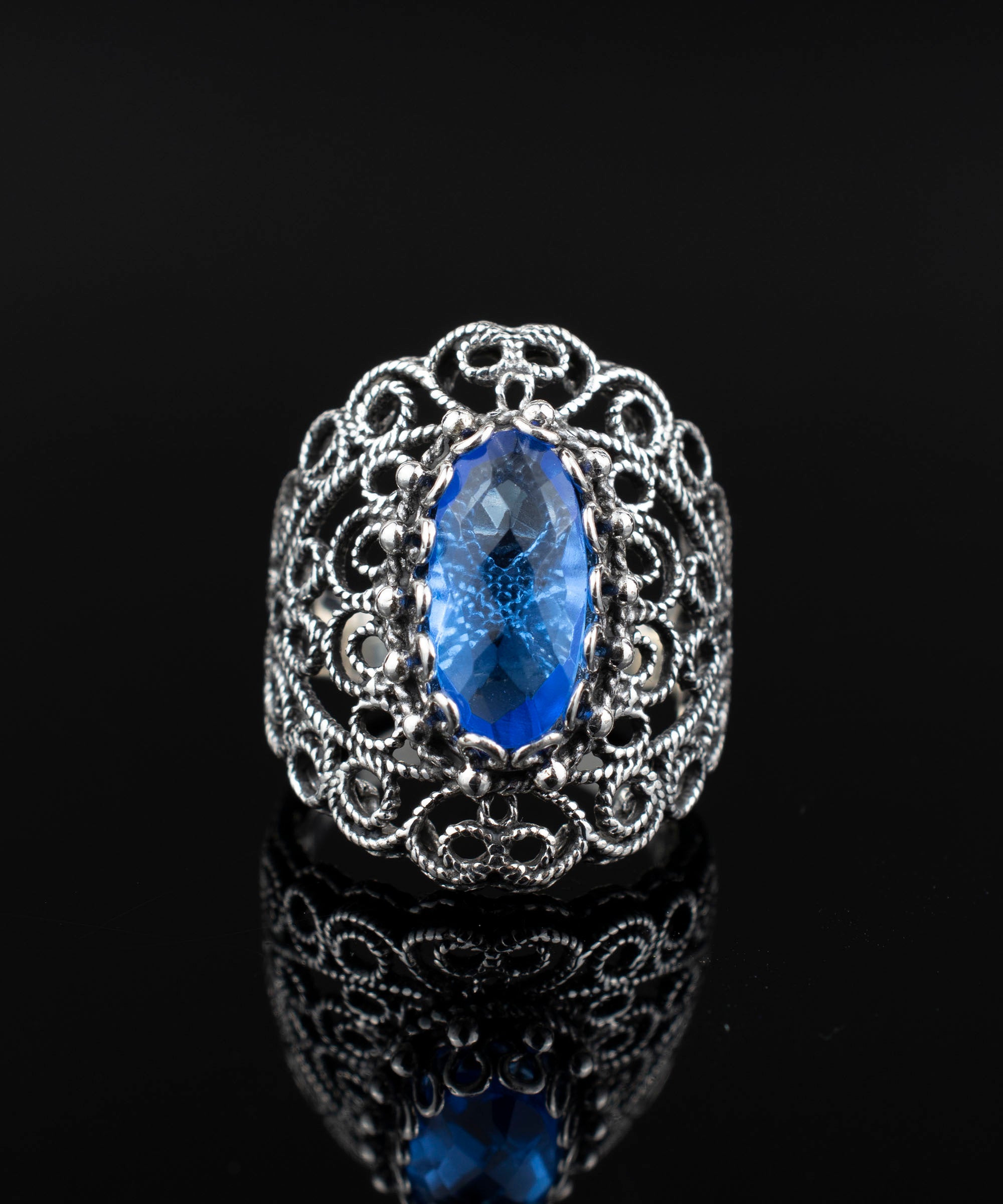 The ring features intricate filigree work, a technique that involves delicate metal strands skillfully fashioned to create stunning patterns. This art form has its origins in ancient Mesopotamia and Anatolia, showcasing a rich history of craftsmanship. The lace detailing on the band adds a touch of femininity and elegance, making this ring a true statement piece.