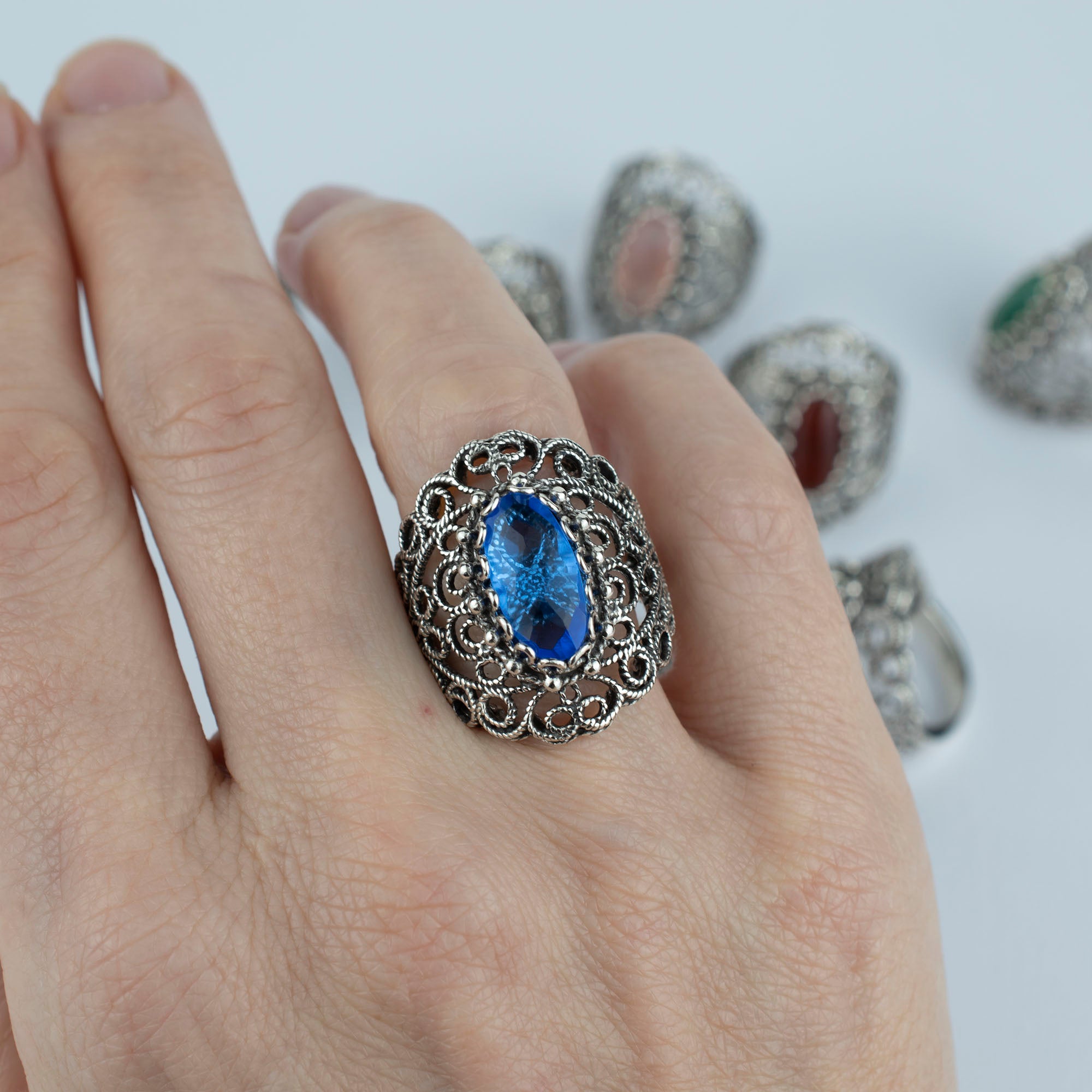 In summary, the Filigree Art Blue Quartz Gemstone Lace Detailed Women's Silver Statement Ring is a unique and elegant piece of jewelry that showcases the beauty of artisanal craftsmanship. With its stunning design, high-quality materials, and thoughtful gift packaging, this ring is a must-have for any jewelry lover.