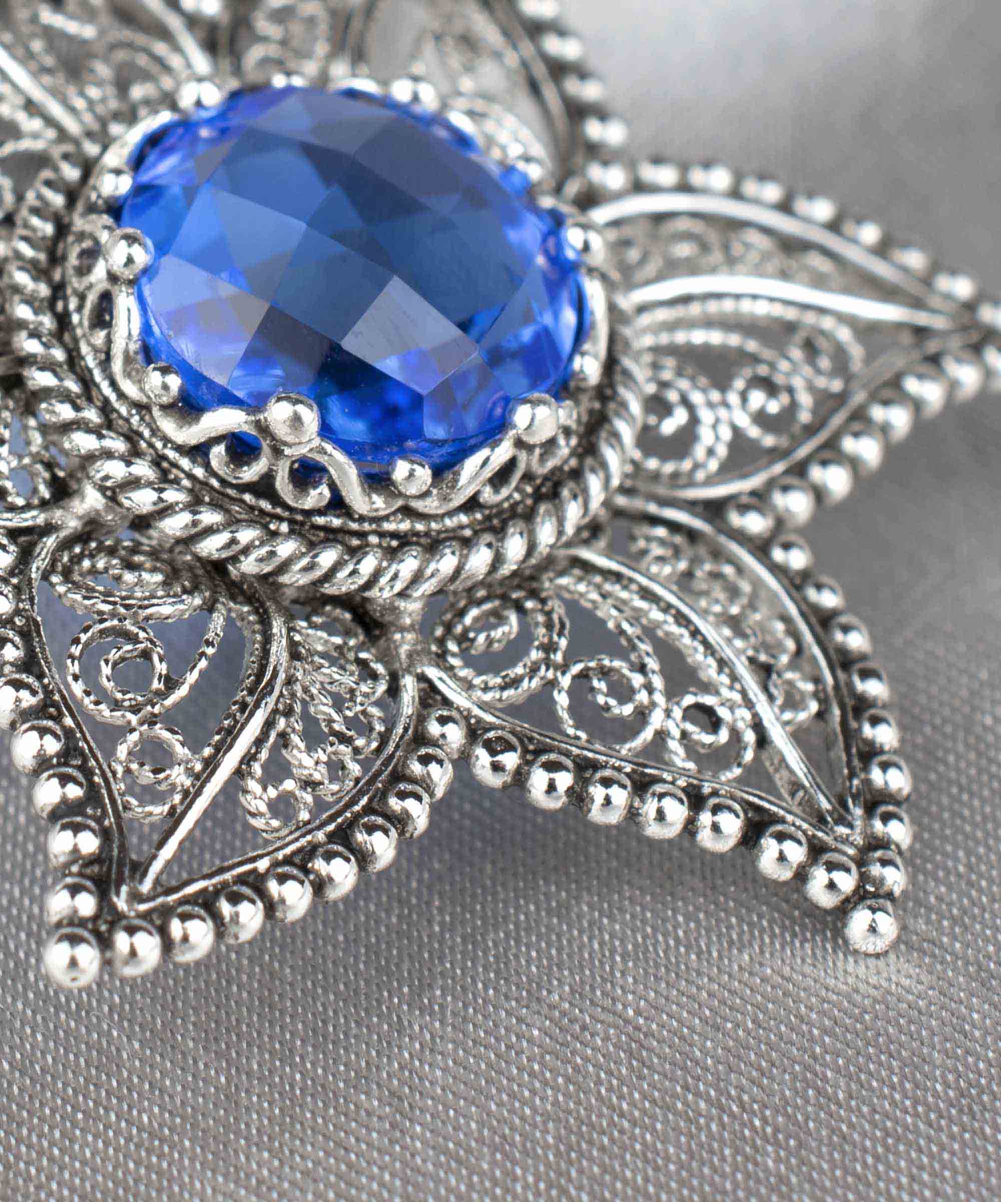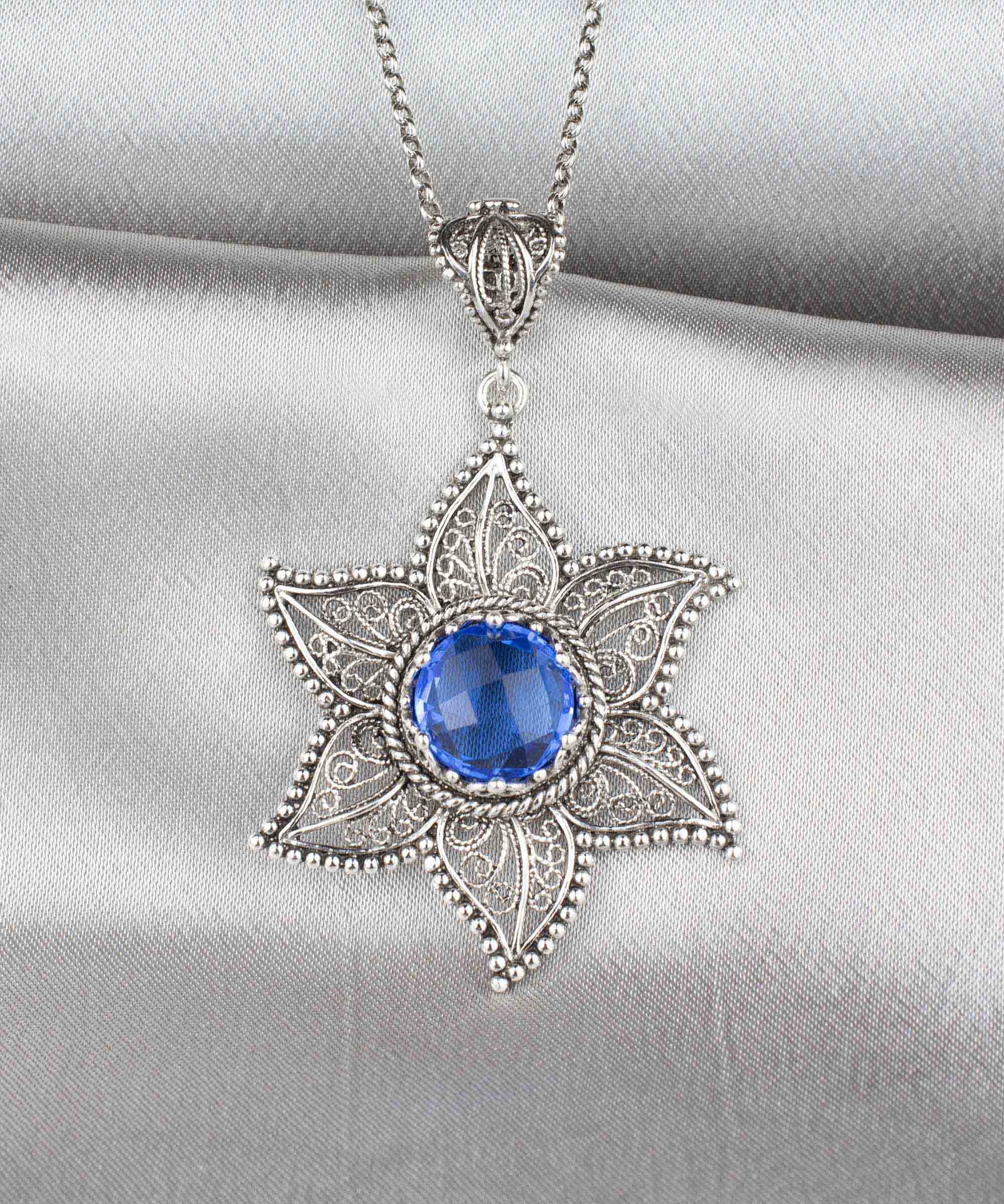 Handcrafted silver pendant featuring intricate filigree art and a blue quartz gemstone in a star design.