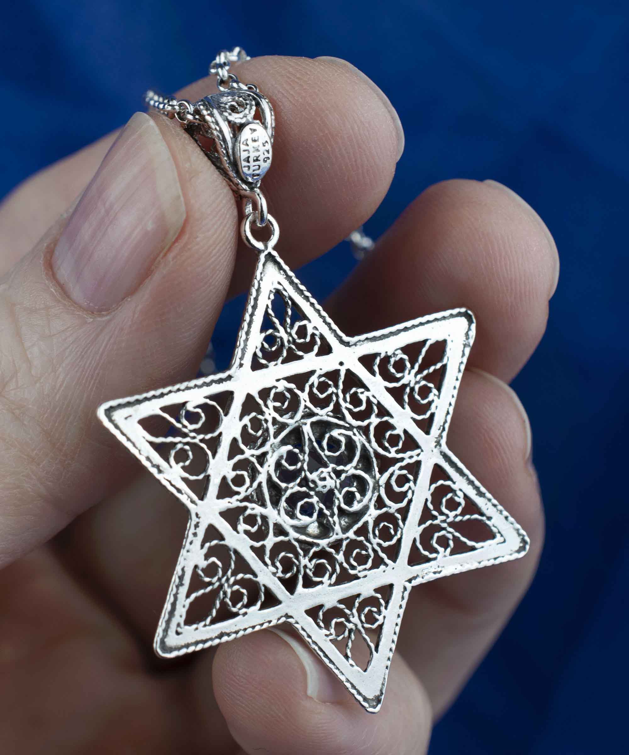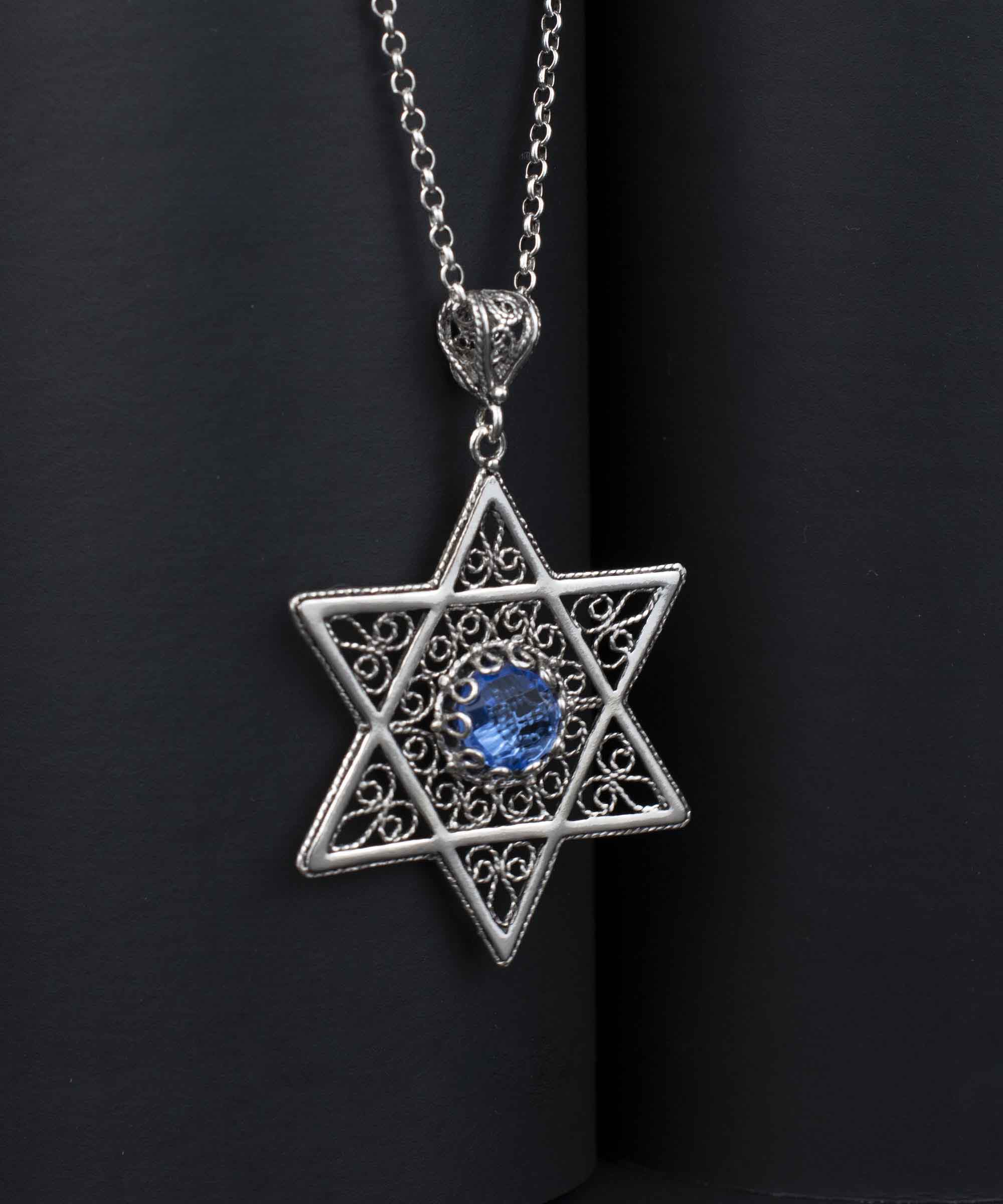 Stand out from the crowd with this unique and meaningful piece of jewelry. Our handcrafted filigree art design ensures that each pendant is one-of-a-kind, reflecting the artistry and dedication that goes into its creation. The combination of the blue quartz gemstone and the Star of David symbol makes this pendant a powerful statement piece that resonates with many.