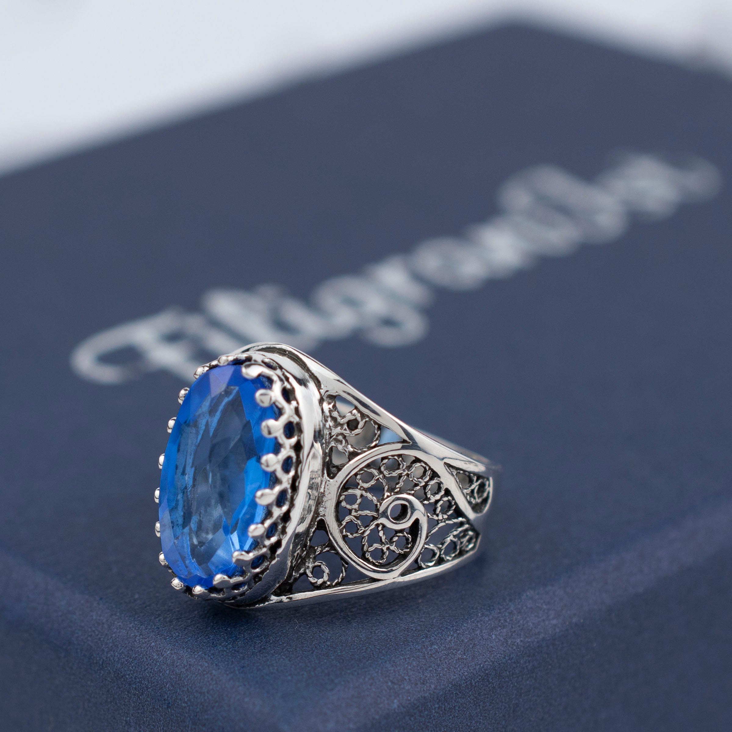 Introducing the exquisite Filigree Art Blue Quartz Gemstone Women Oval Silver Cocktail Ring, a stunning piece that combines traditional craftsmanship with modern elegance. This ring is designed for women who appreciate fine jewelry and want to make a statement. The centerpiece of this ring is a beautiful blue quartz gemstone, known for its calming hues and natural beauty. The ring's face measures 0.65 inches in length and 0.40 inches in width, making it a perfect fit for any finger.