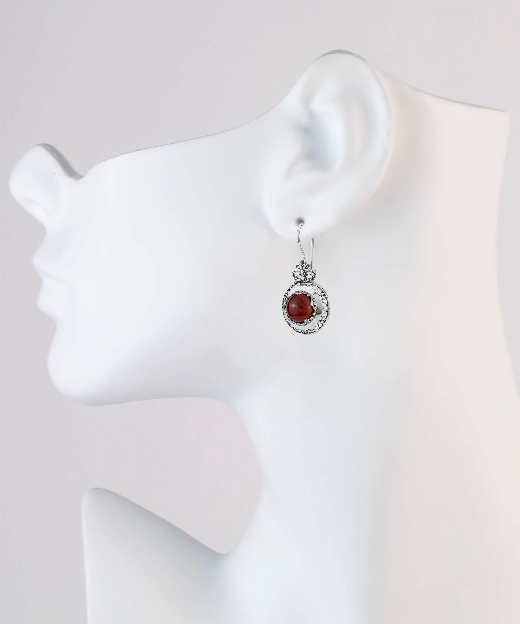 Each earring is adorned with a natural 10 mm cabochon round-cut Carnelian gemstone, known for its warm and deep orange hue. The vibrant color of the Carnelian stones provides a stunning contrast against the oxidized silver filigree, enhancing the overall aesthetic of the earrings. Carnelian is believed to promote creativity and courage, making these earrings not only a beautiful accessory but also a meaningful one.