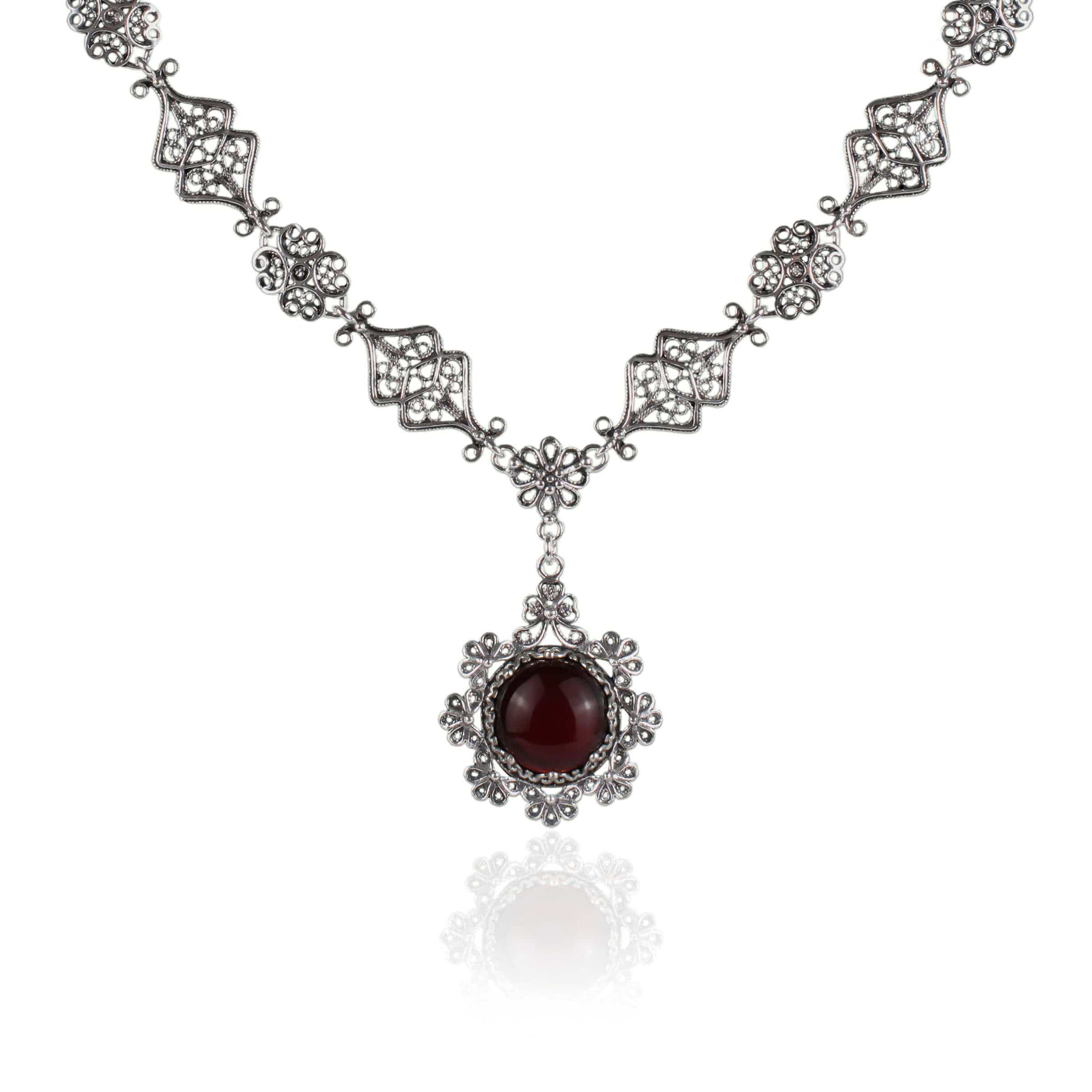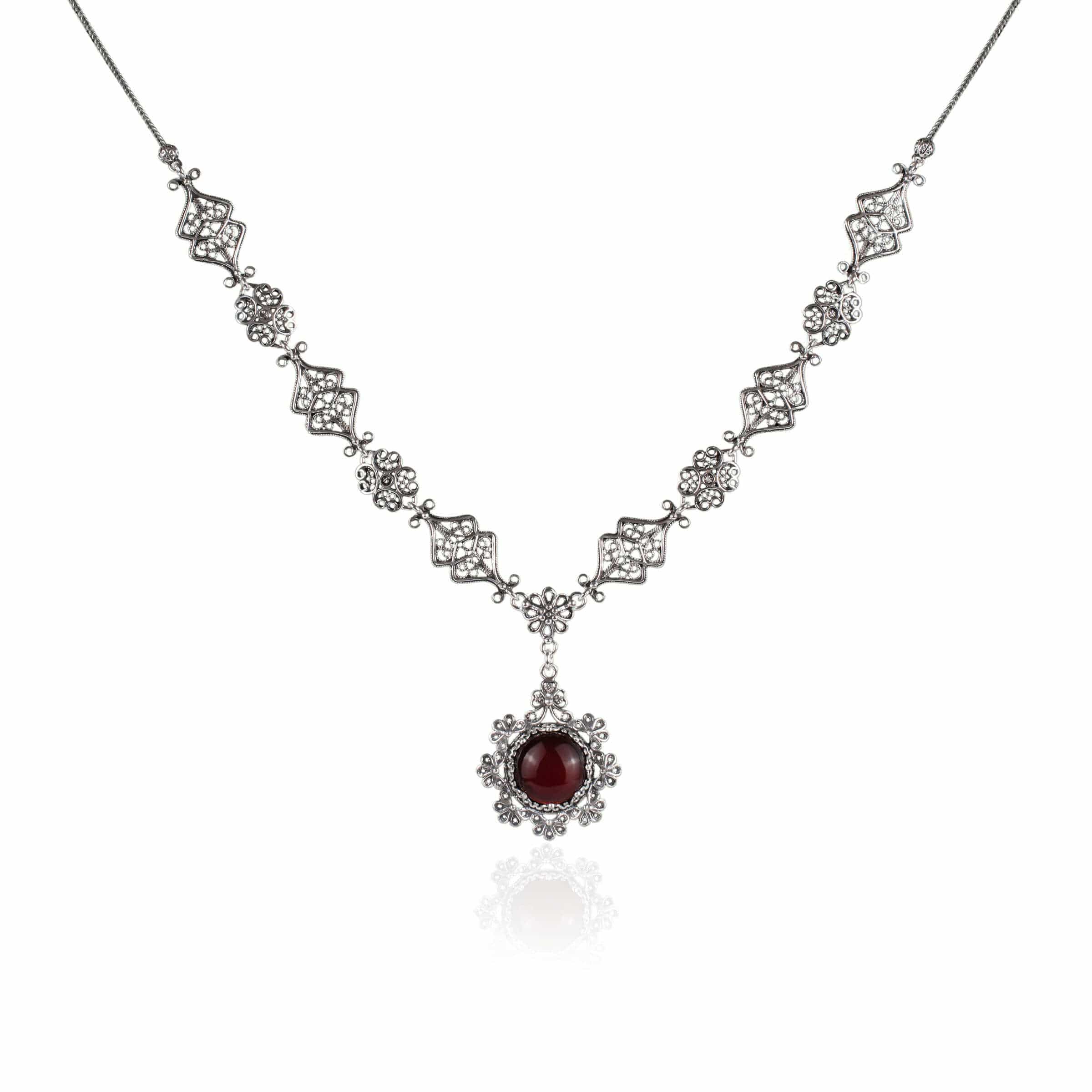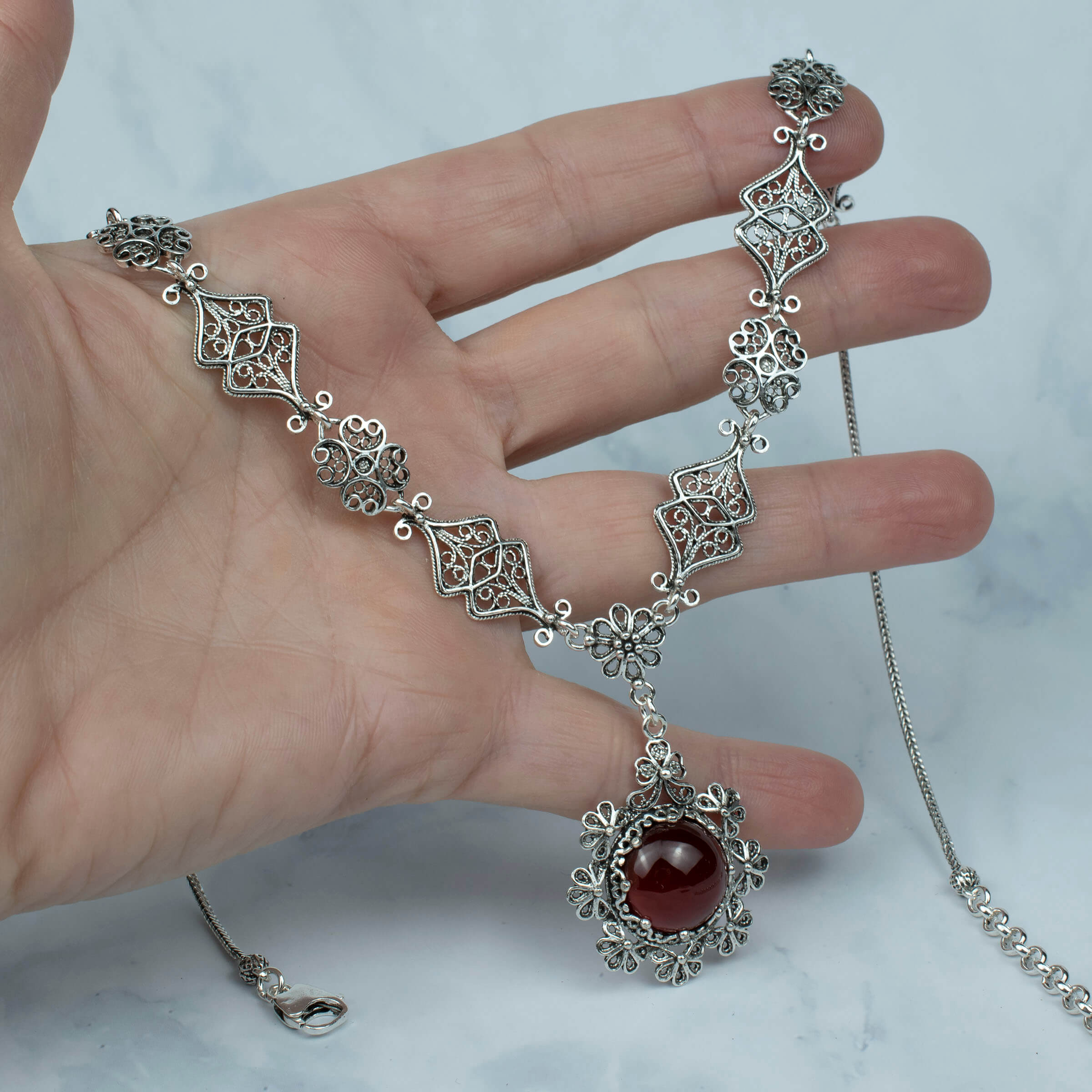 The necklace is crafted from high-quality sterling silver, ensuring durability and a luxurious shine. The intricate filigree design showcases delicate metal strands that have been skillfully fashioned, creating a unique pattern that is both eye-catching and timeless. This art form has its roots in ancient Mesopotamia and Anatolia, making this necklace not just a piece of jewelry, but a piece of history.