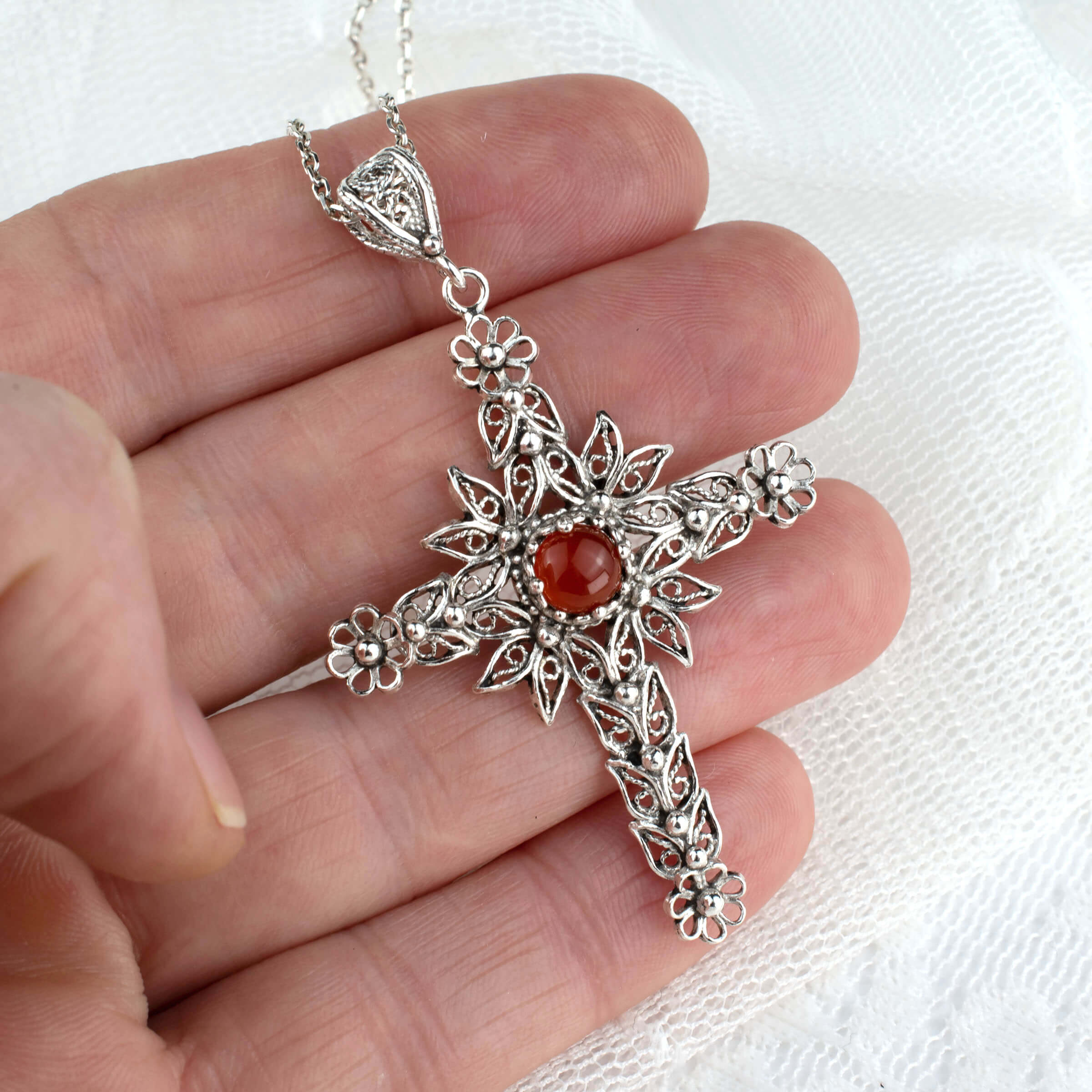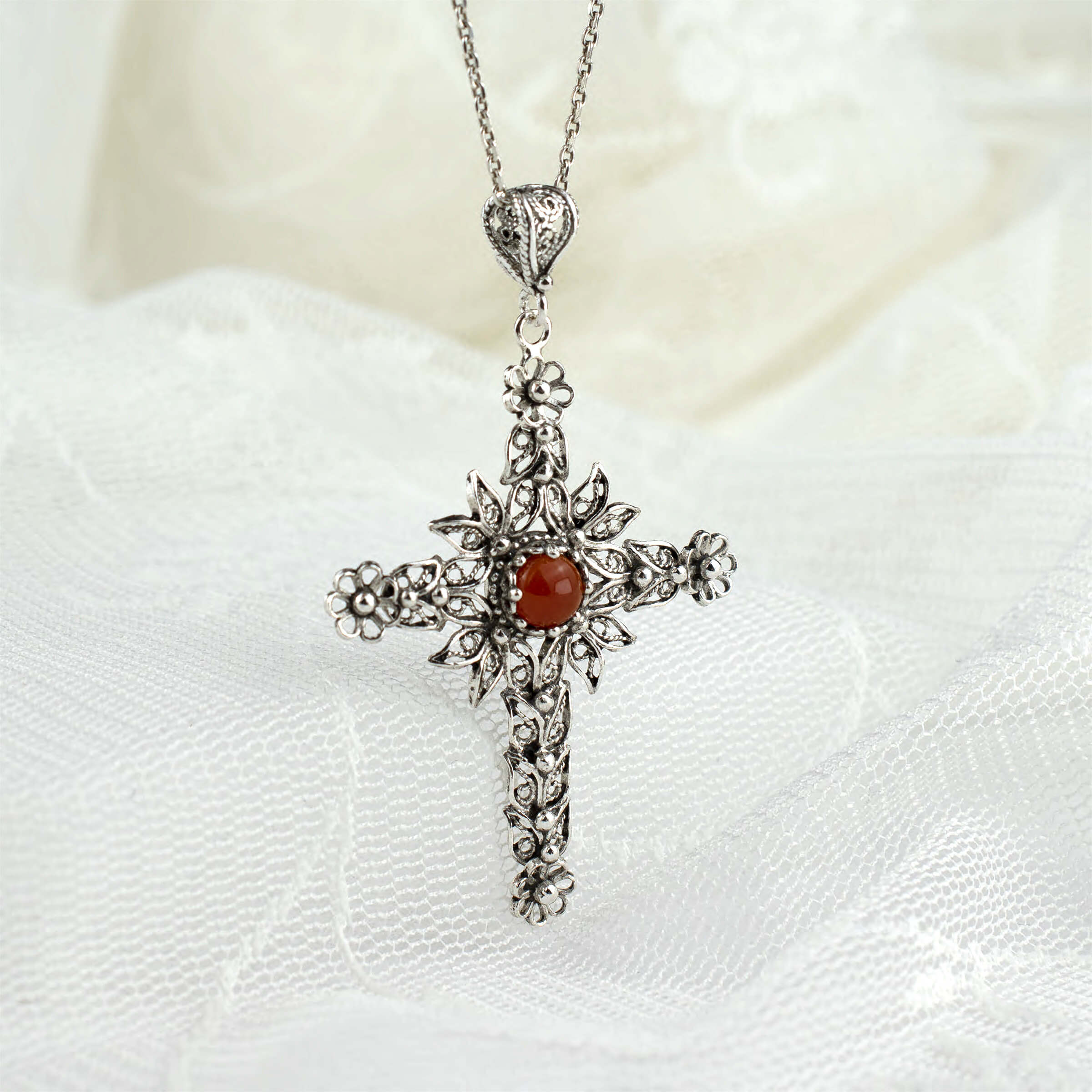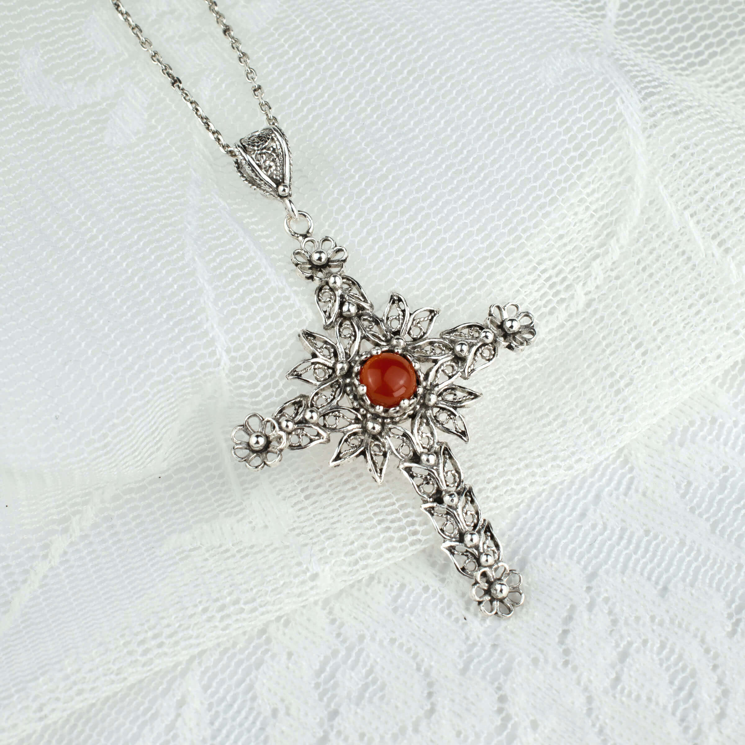 Elegant silver cross pendant necklace featuring intricate filigree design and a vibrant carnelian gemstone.