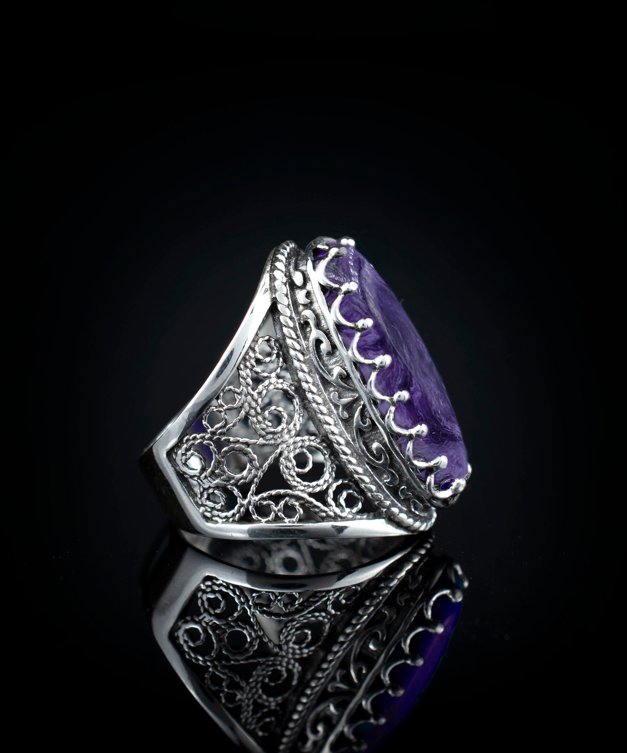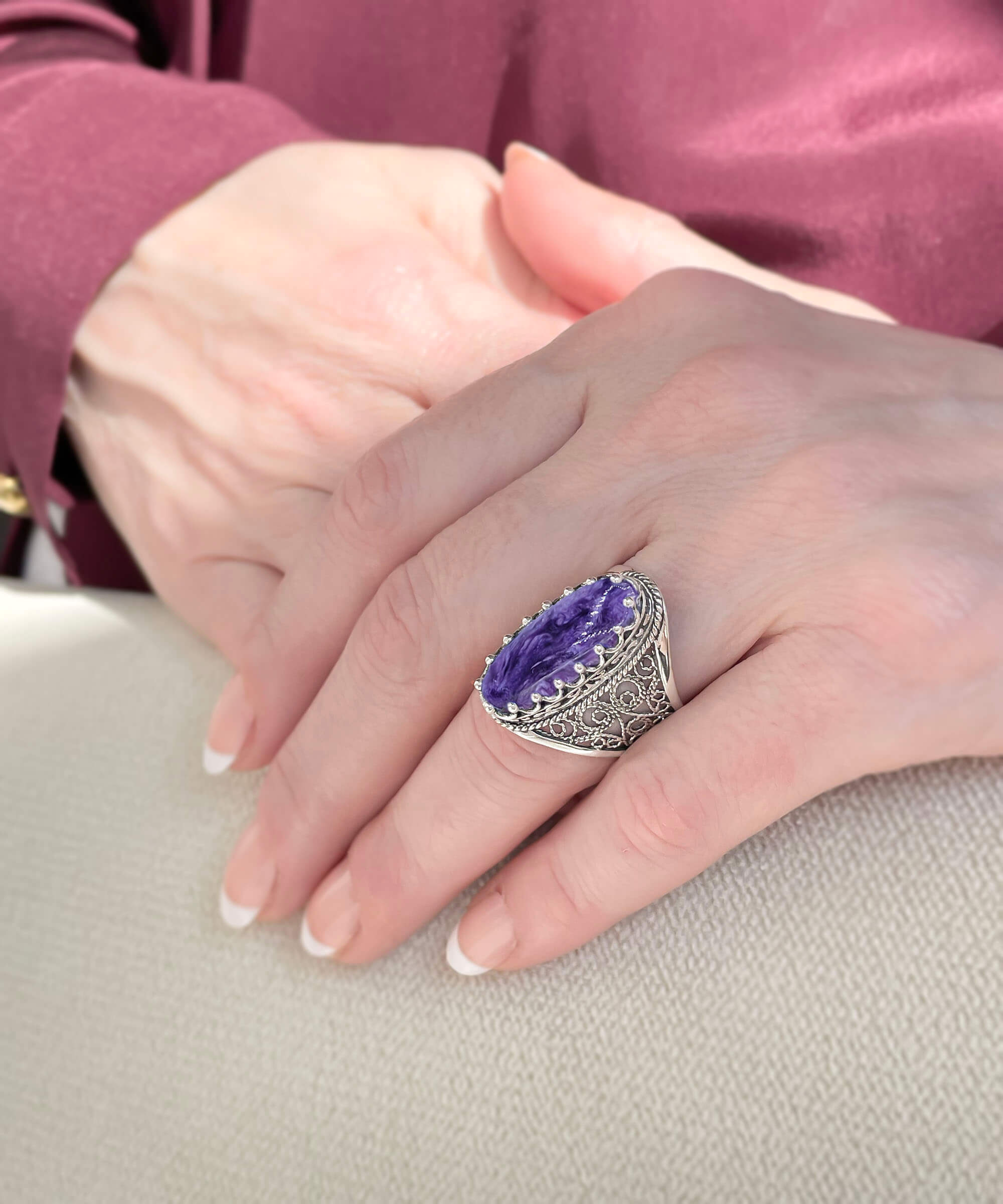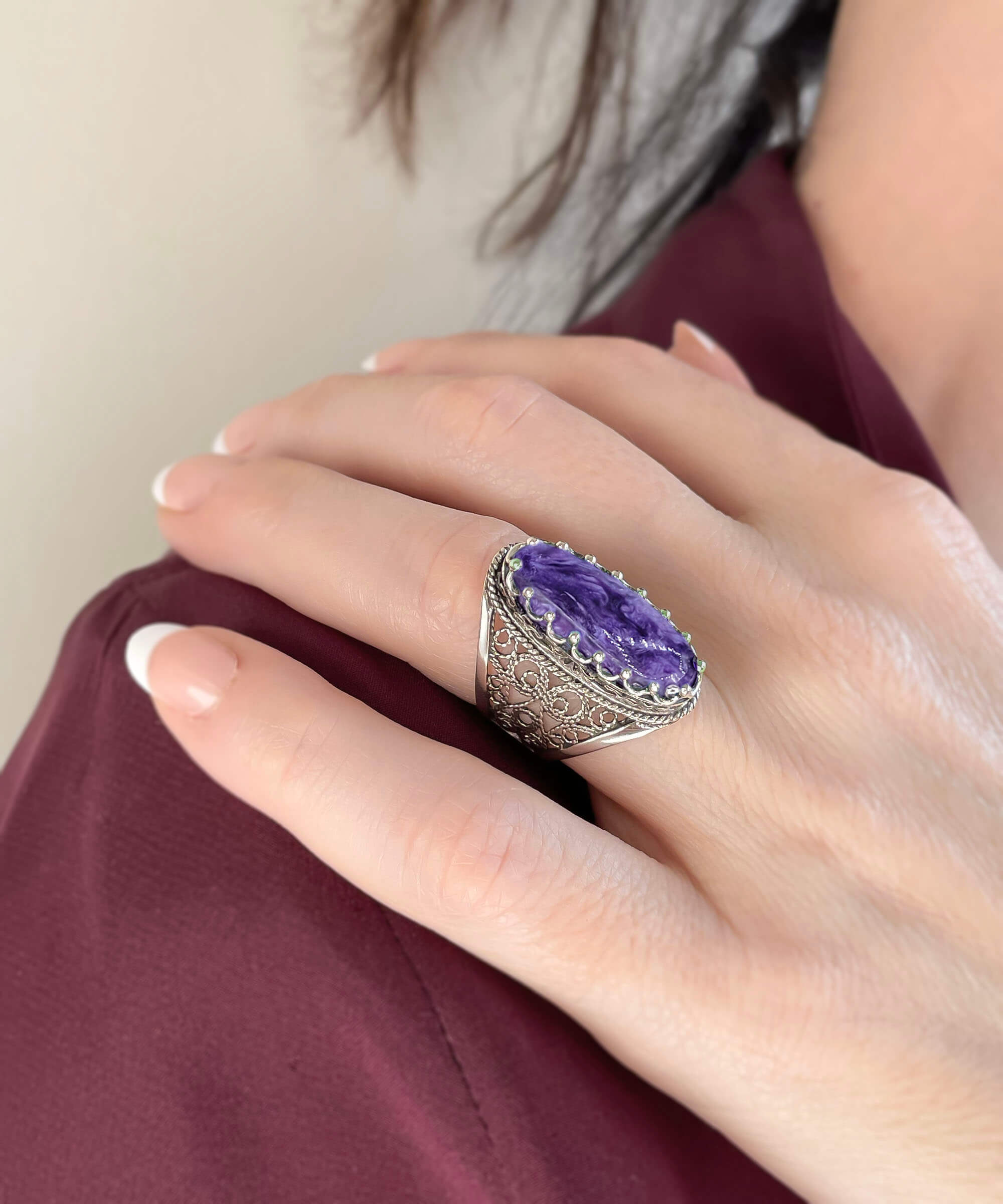 In summary, the Filigree Art Charoite Gemstone Women Silver Long Statement Ring is a stunning piece that showcases the beauty of natural gemstones and the artistry of filigree design. Its unique combination of elegance, quality, and thoughtful presentation makes it a must-have addition to any jewelry collection.