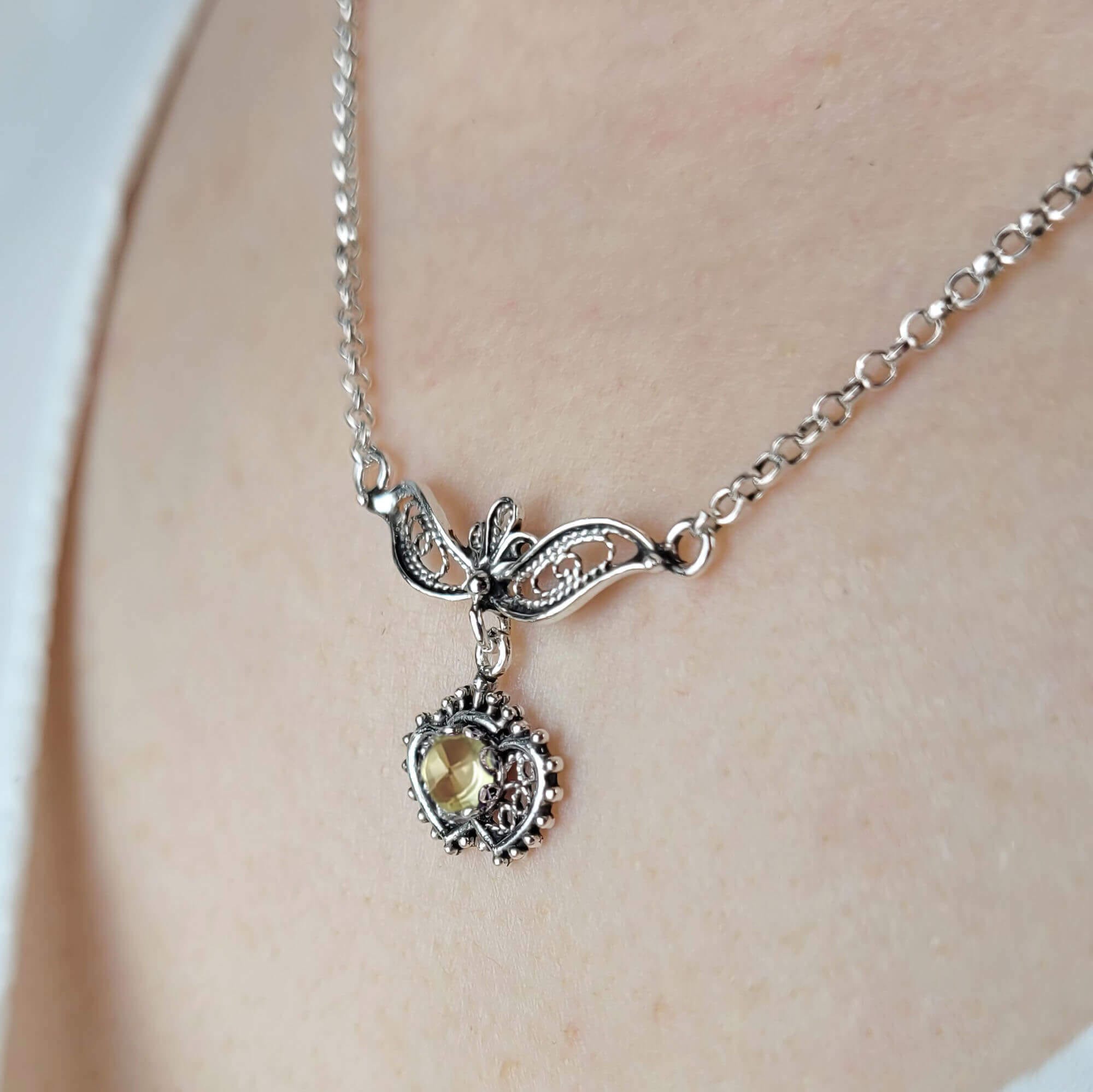 Sterling silver choker necklace featuring filigree art with citrine and blue quartz gemstones in a heart design.