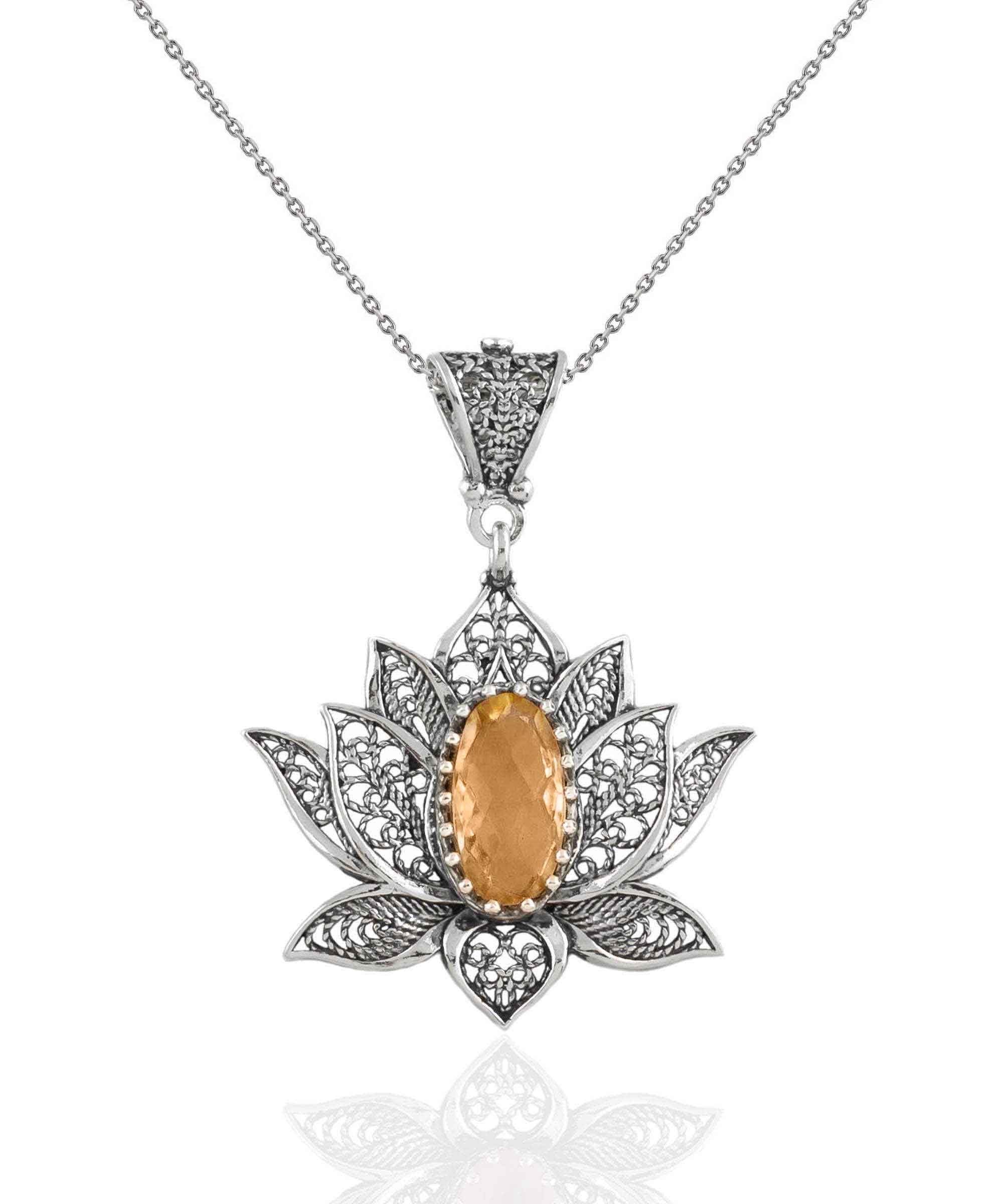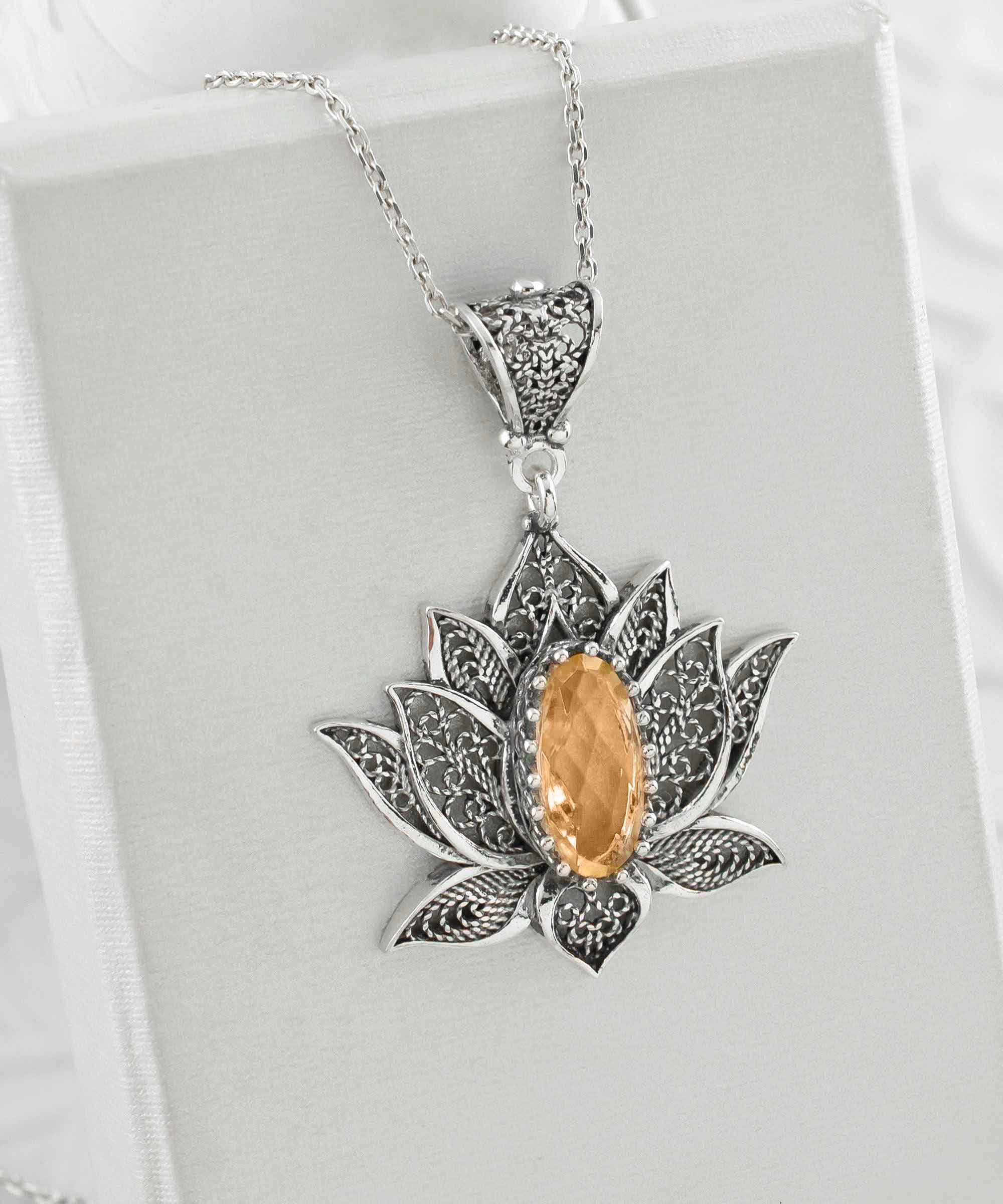 Elegant 925 Sterling Silver filigree lotus flower pendant necklace with Citrine gemstone, showcasing intricate craftsmanship.