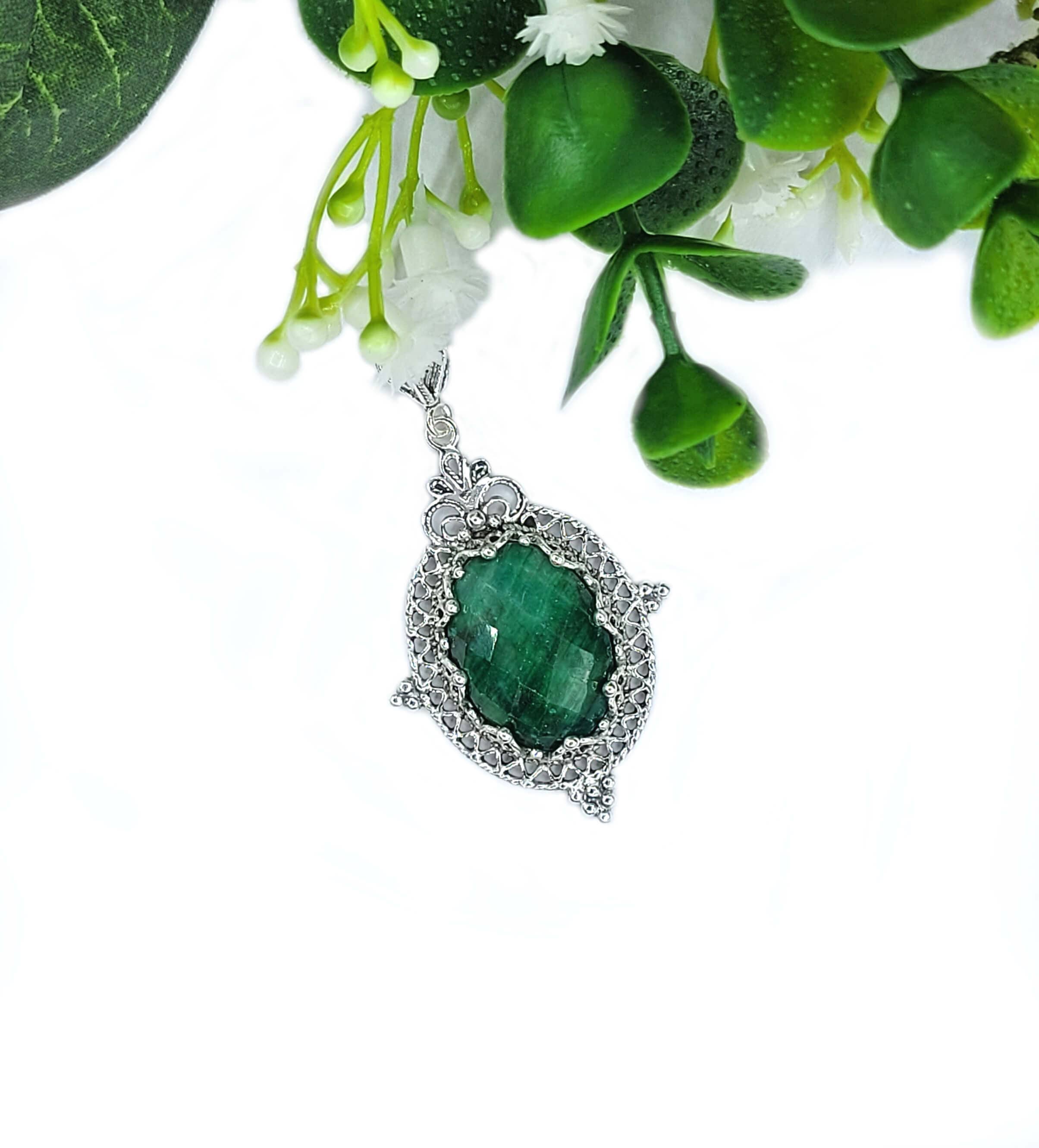 Introducing the exquisite Filigree Art Emerald Gemstone Women Silver Oval Pendant Necklace, a stunning piece of jewelry that combines traditional craftsmanship with modern elegance. This necklace features a beautifully crafted sterling silver filigree design that showcases the intricate artistry of metalwork. The pendant is adorned with a natural emerald corundum gemstone, making it a perfect accessory for any occasion.