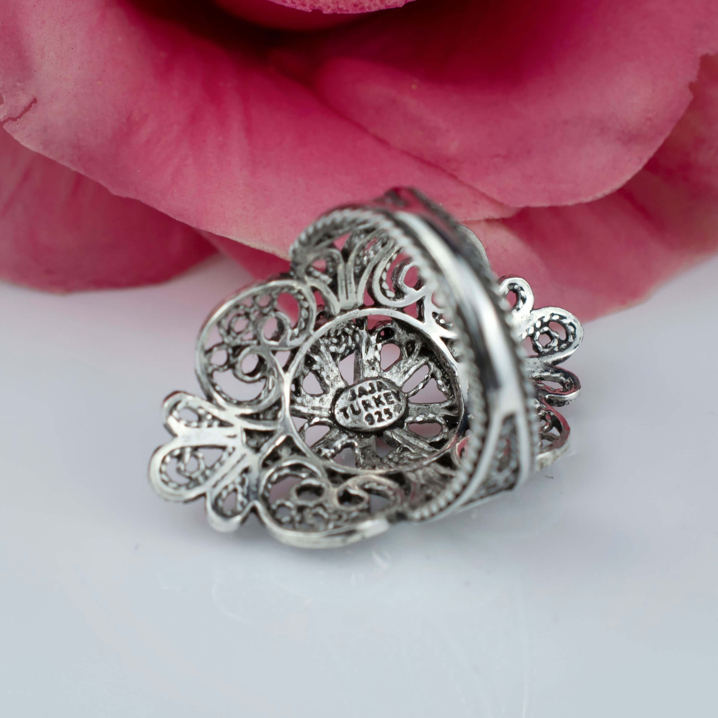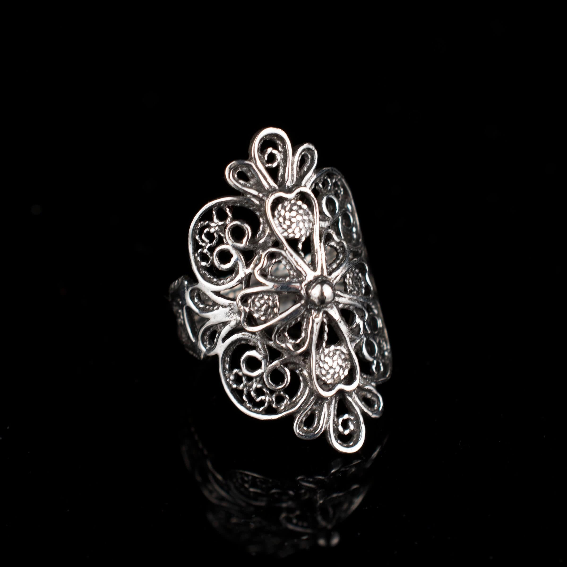 The long and bold design of this ring is a true testament to the artistry involved in its creation. The filigree work is made from delicate metal strands that have been skillfully fashioned to create an outstanding combination of old and modern art. This technique, which has its origins in Mesopotamia and Anatolia, showcases the rich history and craftsmanship that goes into each piece.