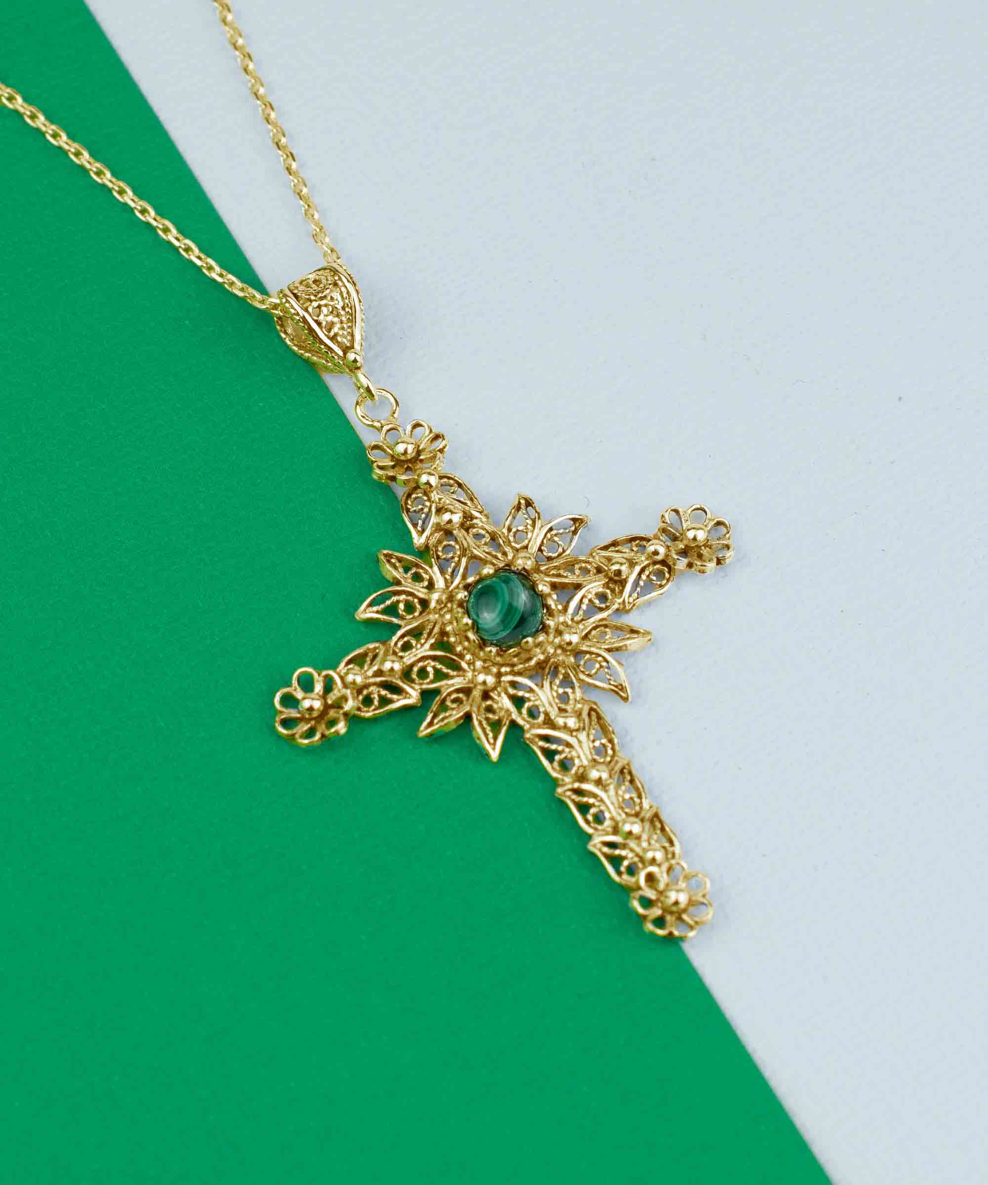 In summary, the Filigree Art Malachite Gemstone Women Gold Plated Silver Cross Pendant is a remarkable piece of jewelry that combines artistry, symbolism, and quality. Whether you are purchasing it for yourself or as a gift, this pendant is sure to make a lasting impression.